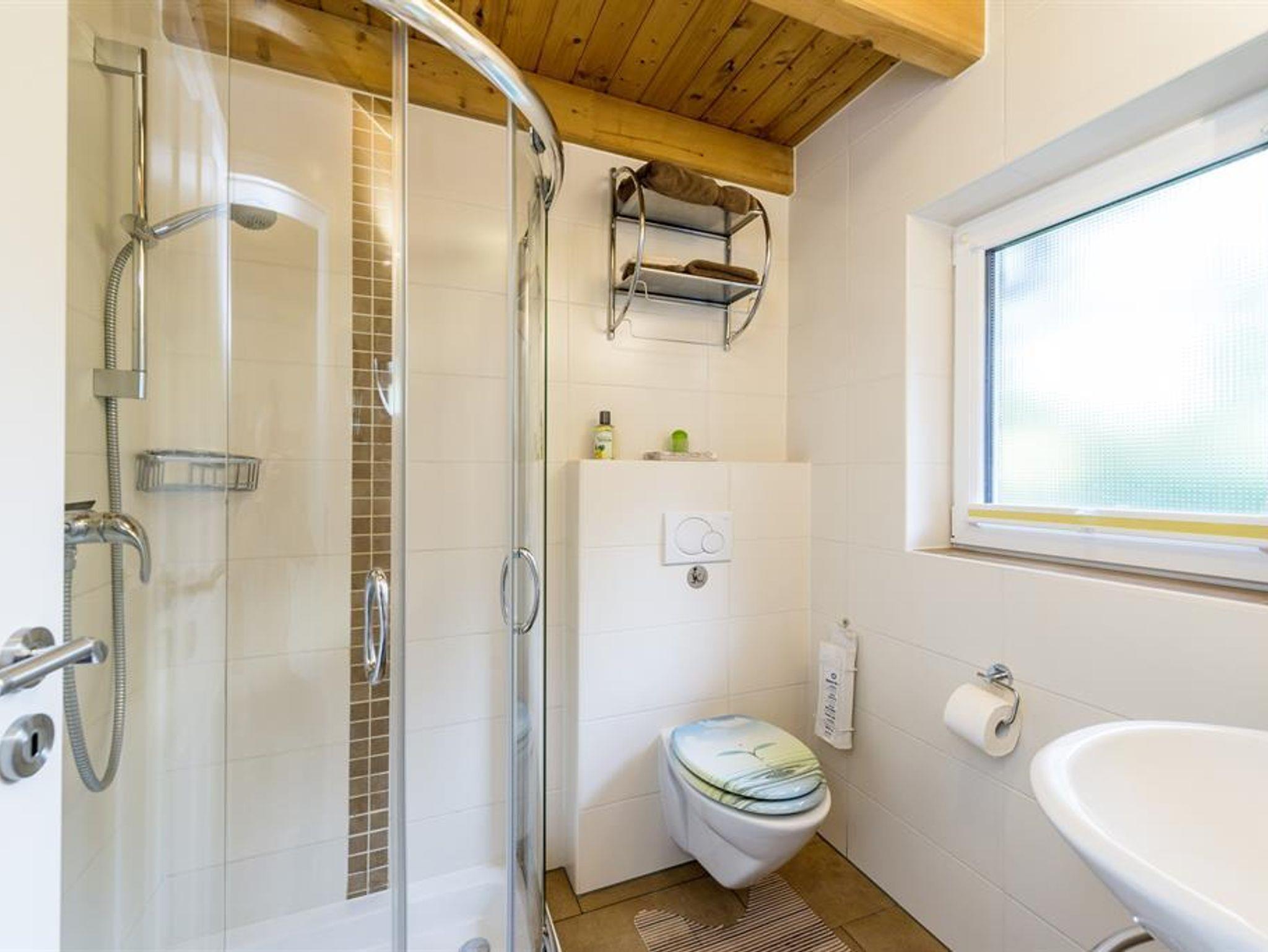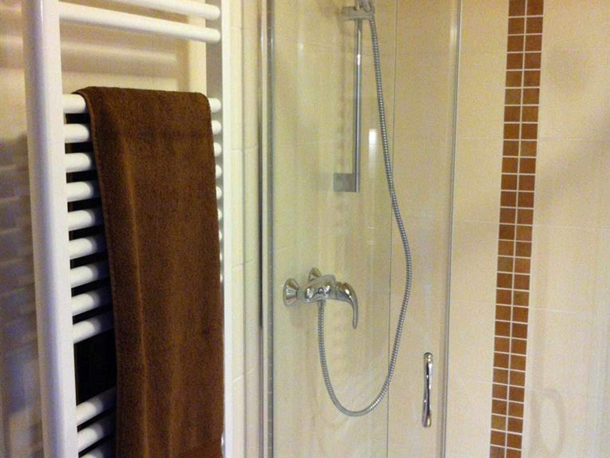 Das Bad bietet ein WC, eine Dusche, Badwandheizkörper und Föhn