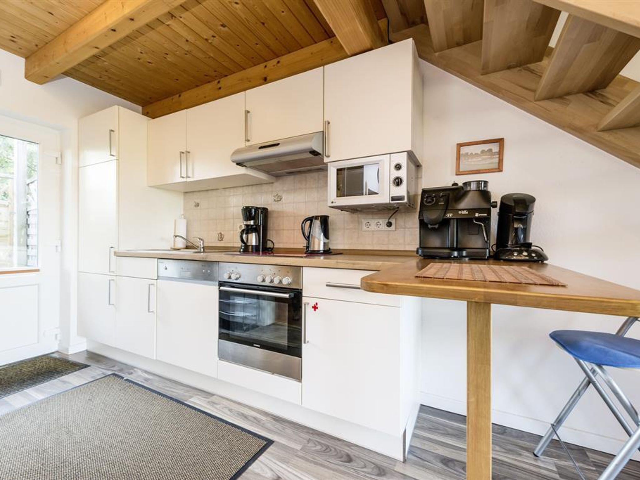 * Esstisch mit Sitzplätzen * Kühlschrank mit Gefrierfach * Elektroherd mit Ceranfeld und Backofen * Geschirrspülmaschine * Mikrowelle * Kaffeemaschine, Wasserkocher, Toaster
