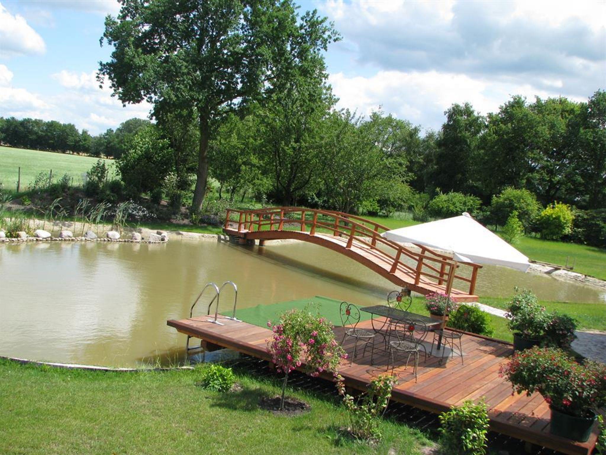 2 Doppelbetten, (eines 180 cm breit), 2 Einzelbetten, Sitzecke mit Blick auf Schwimmteich, geschlossener Kleiderschrank , auf Wunsch Kinderbett