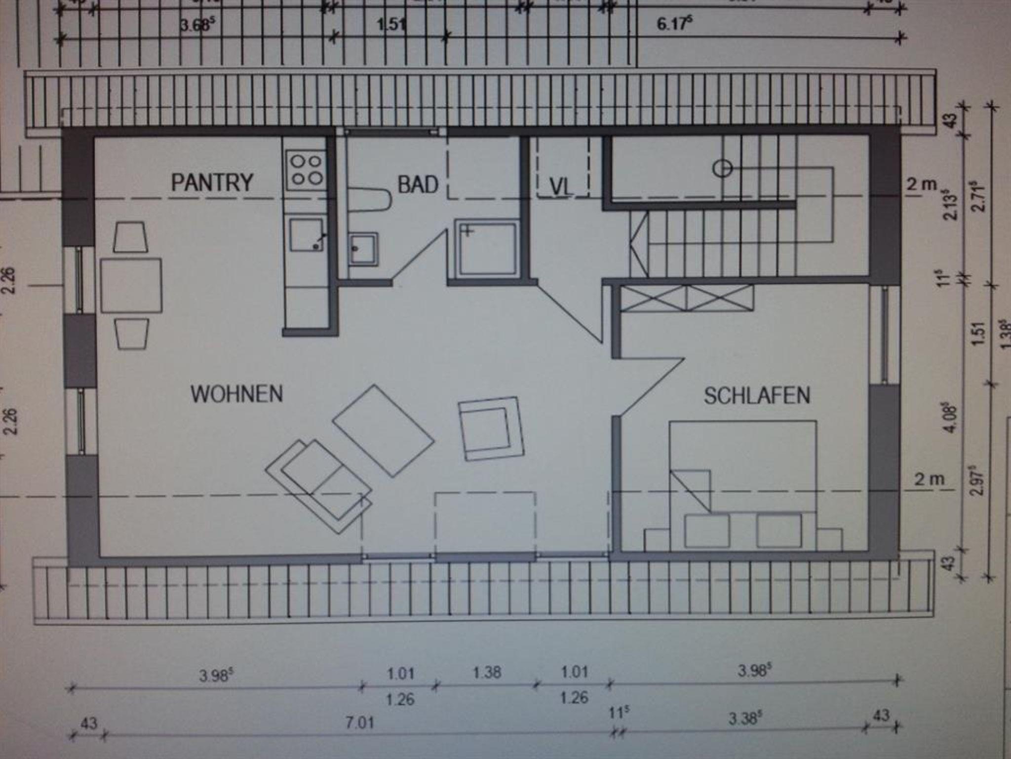 Die Wohnung verfügt über einen kombinierten Wohn-/Essbereich mit integrierter Küche, eine großes, helles freundliches Bad, sowie ein Schlafzimmer mit Doppelbett.