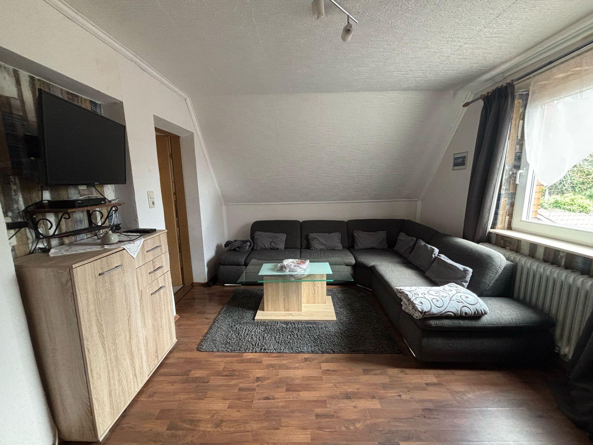 Wohnzimmer mit Sat-TV, gemütliches Ecksofa und separates Schlafsofa,