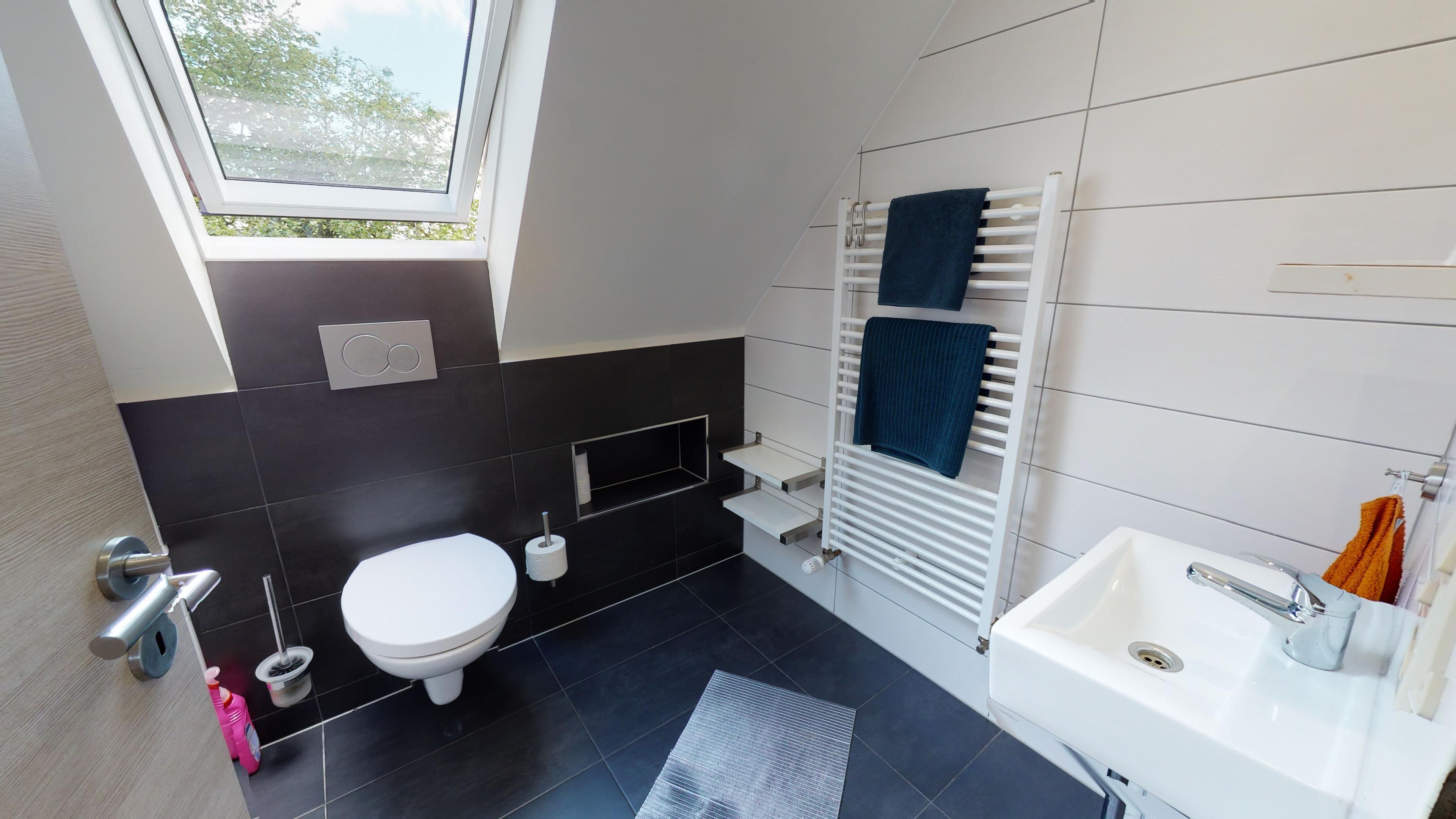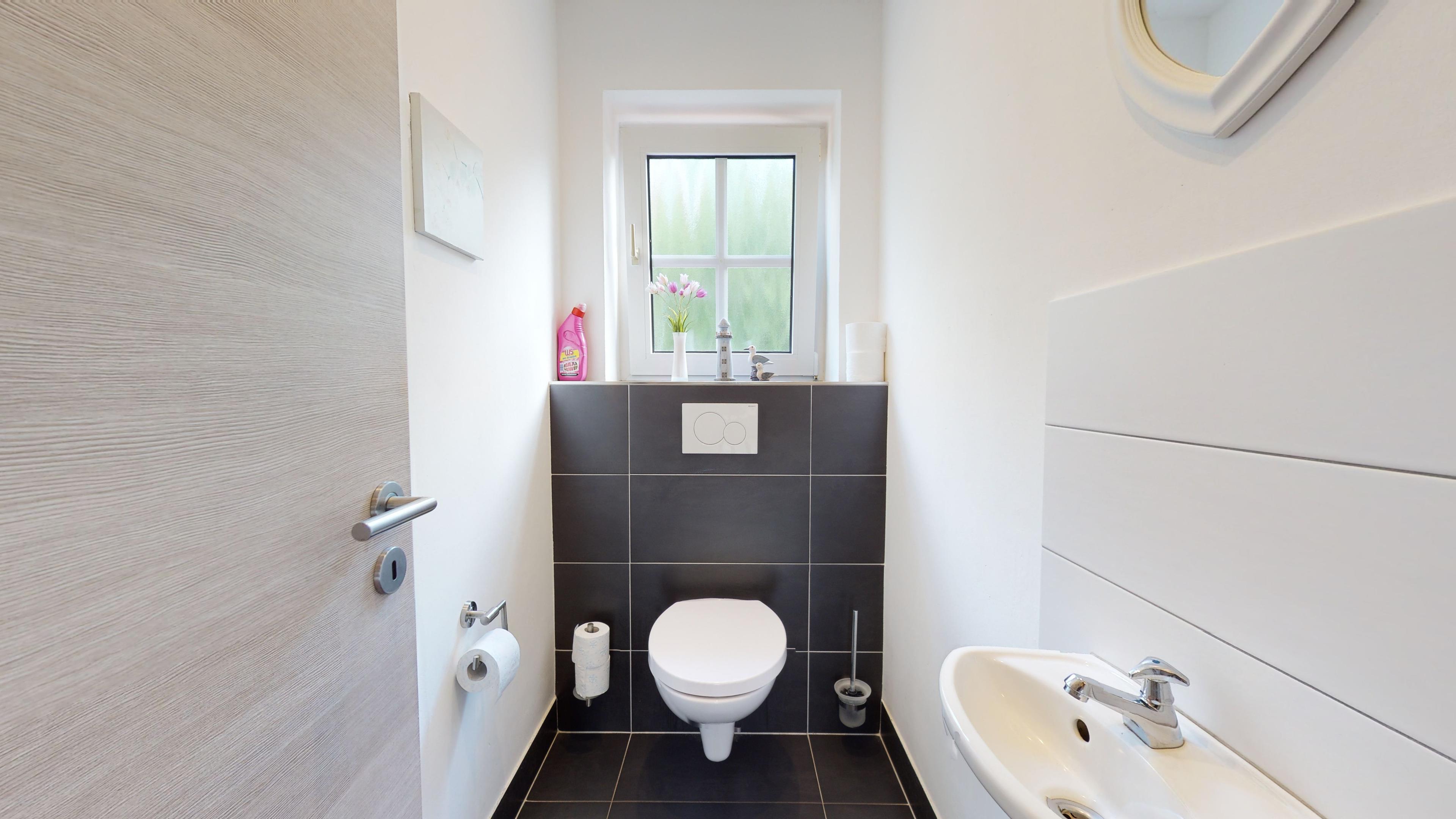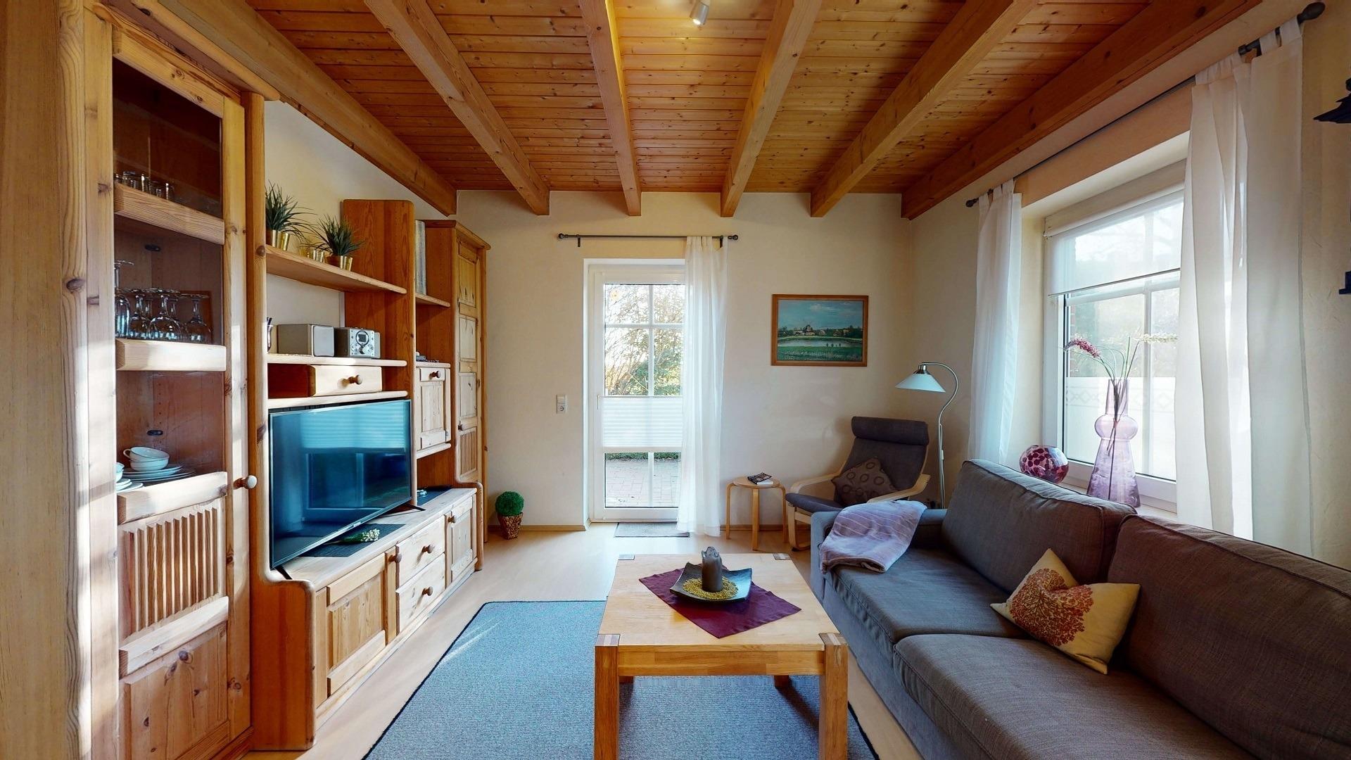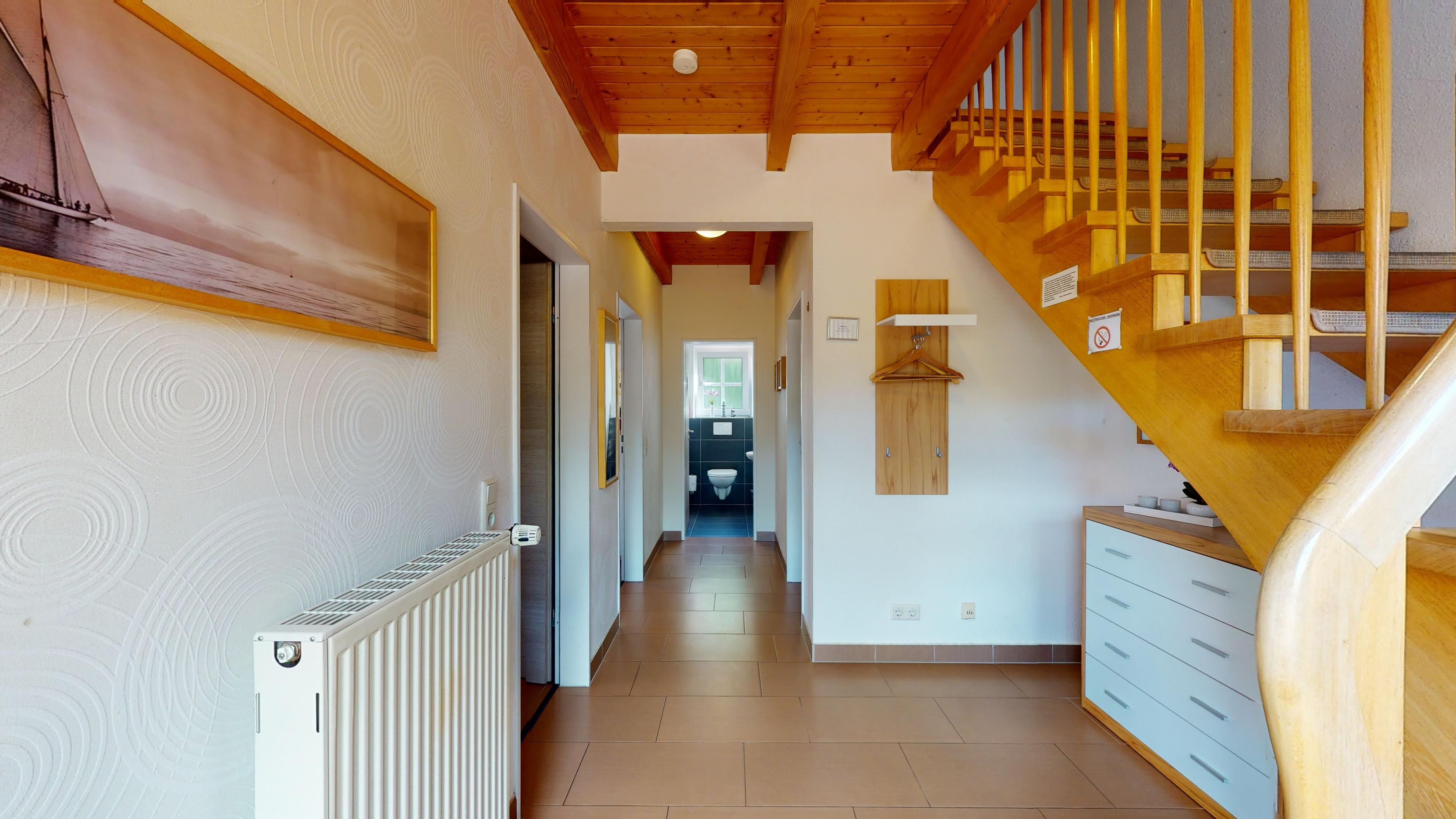 Im Erdgeschoss sind die Deckenbalken in Sicht, neben der Küche und dem Gäste WC befindet sich hier auch das großzügige Wohnzimmer sowie der Hauswirtschaftsraum.