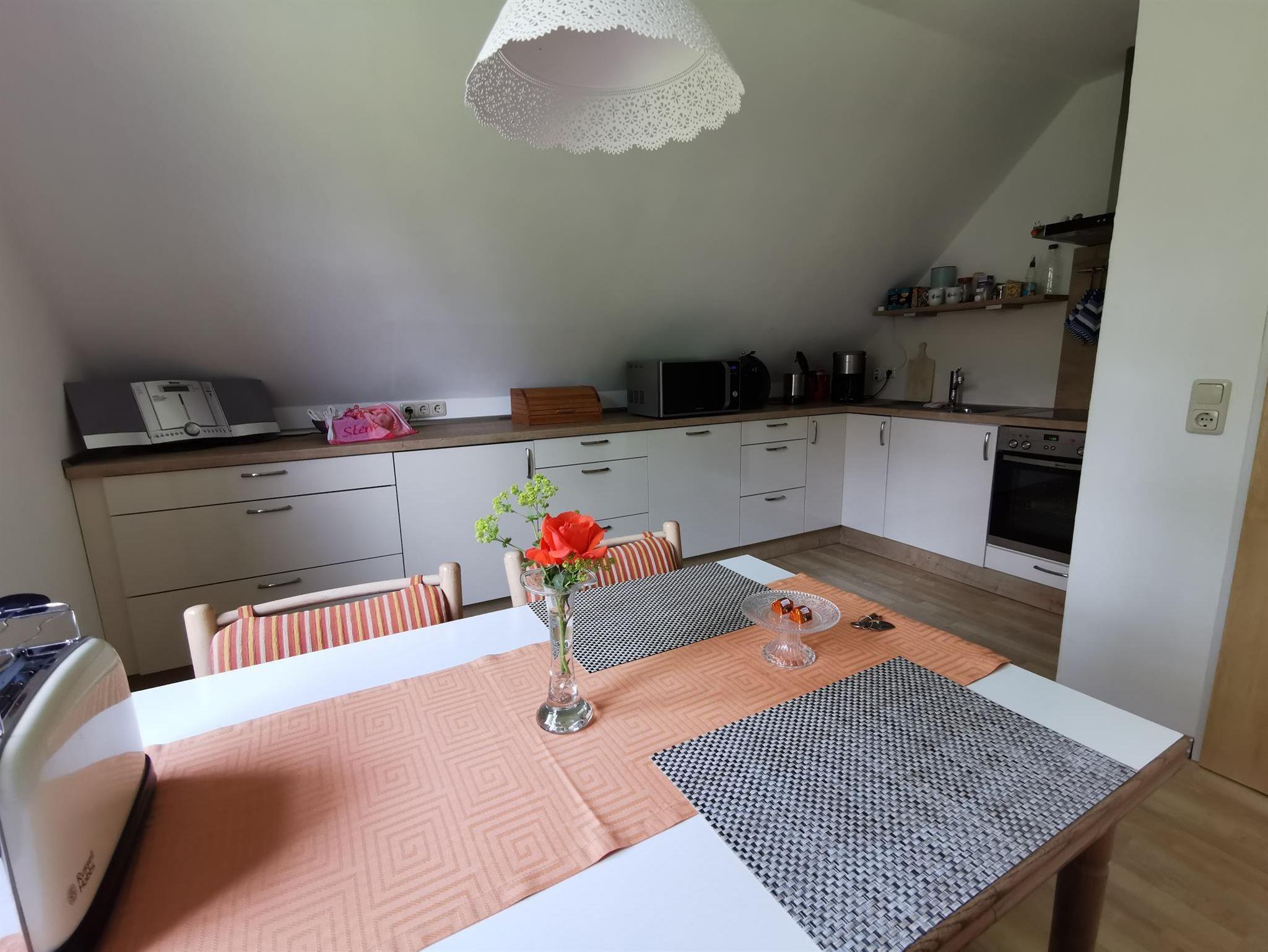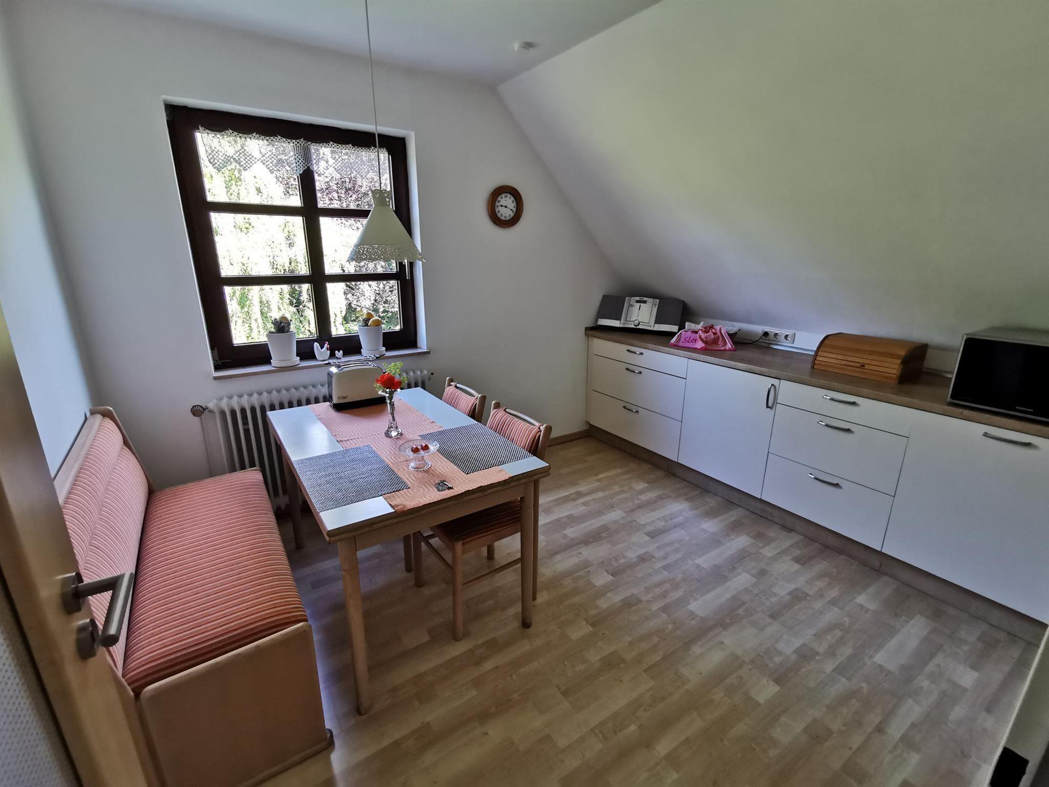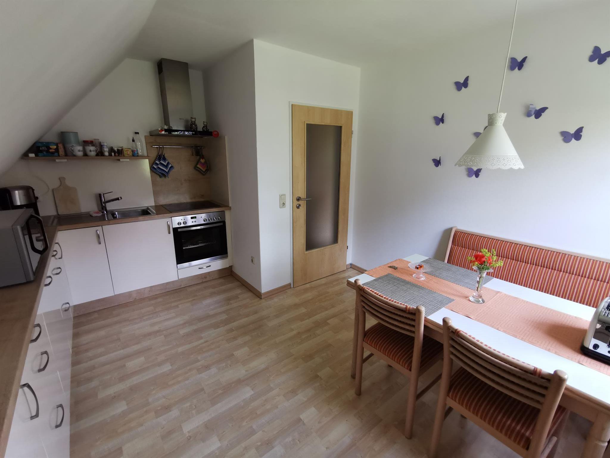 In dem Anwesen (Fachwerkhaus) befindet sich im Obergeschoss die Ferienwohnung. Sie wurde zeitnah renoviert und modernisiert. Die Ferienwohnung besteht aus einem Wohnzimmer, Schlafzimmer (eine getrennte Schlafmöglichkeit ist vorhanden), Arbeitszimmer, komplett eingerichteter Küche und einem Bad.