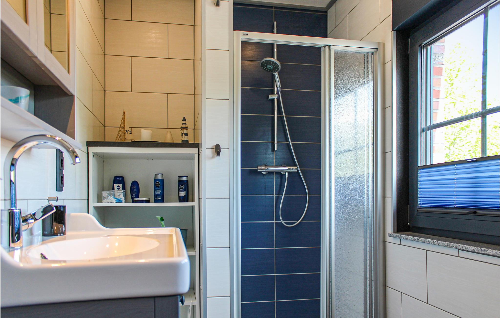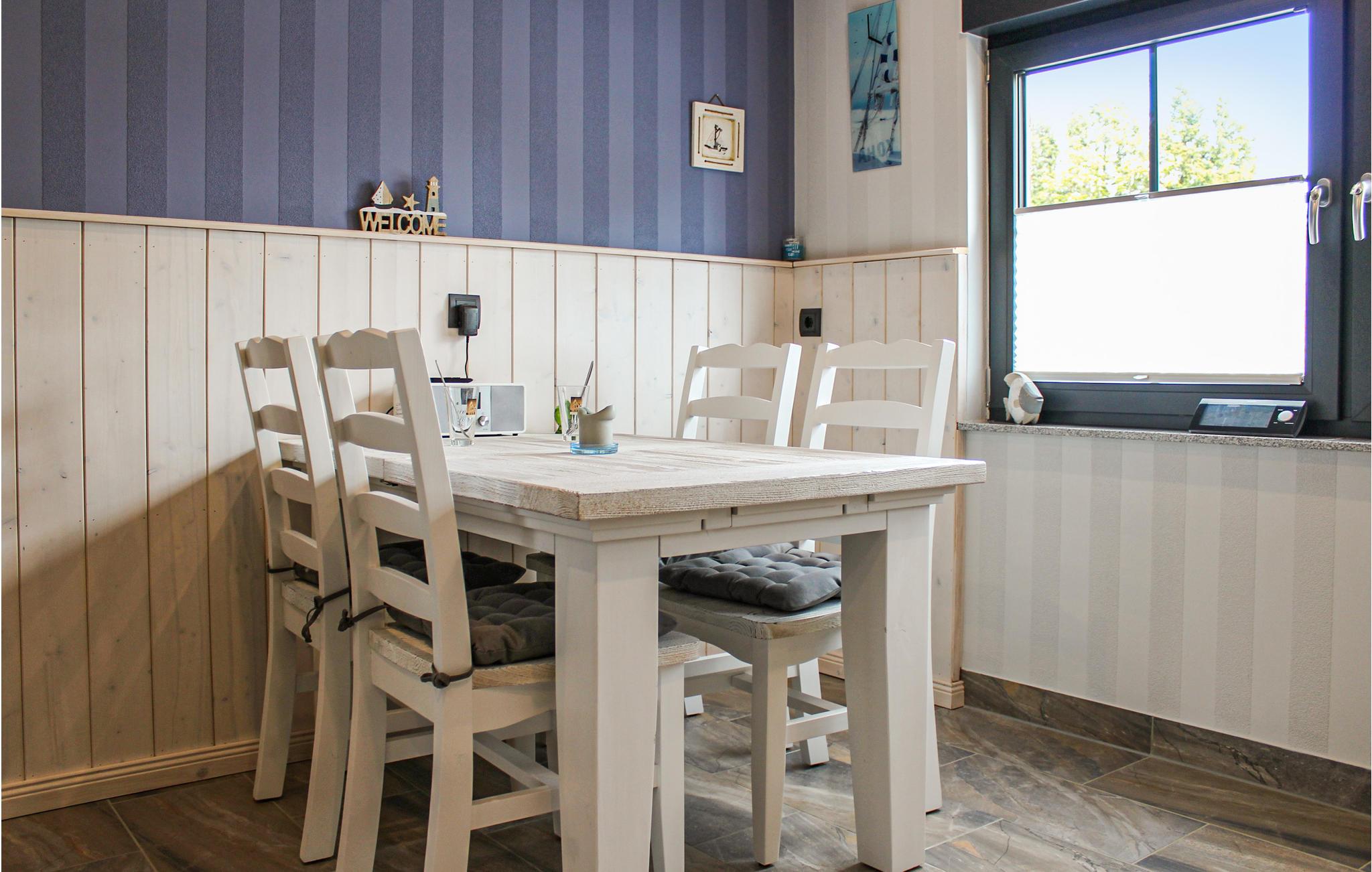 Die Wohnung ist in maritimen Farben gehalten und strahlt sehr viel Ruhe aus. Im Wohnzimmer steht ein Pelletofen, der für Gemütlichkeit und Wärme sorgt. In der geräumigen Küche können Sie entspannt kochen. Probieren Sie doch einmal typisch ostfriesische Gerichte wie einen Snirtjebraten oder Rote Grütze aus! Der große Esstisch lädt dazu ein, ausgiebig zu frühstücken.