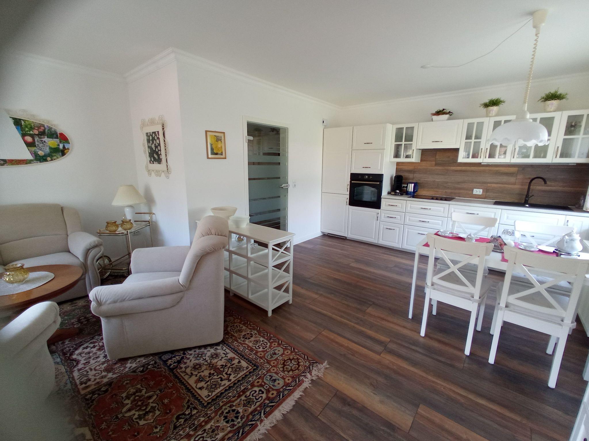 Über einen eigenen Eingang gelangen Sie in die 65qm große, im Erdgeschoss gelegene Wohnung. Der kleine aber feine Eingangsbereich verfügt über eine Garderobe mit Spiegel und führt in die offene Küche mit angeschlossenem Wohnbereich. Die Küche ist neu und mit Herd, Backofen, Dunstabzugshaube, Kühlschrank, Gefrierschrank, Mikrowelle, Wasserkocher und Kaffeemaschine komplett ausgestattet. Die gemütliche Essecke lädt zu einem ausgiebigen Frühstück oder natürlich einer leckeren Tasse Ostfriesentee ein, denn: