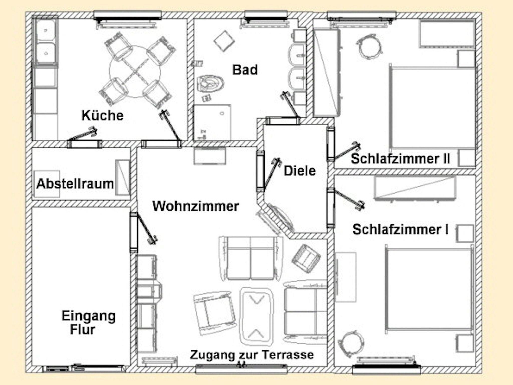 Die Ferienwohnung Typ Norderney ist für bis zu 4 Erwachsene Personen eingerichtet. Ruhe und Erholung ist hier garantiert! In der Wohnung befinden sich zwei große Schlafzimmer mit jeweils einem Doppelbett, sowie einem großen Kleiderschrank.Die Ferienwohnung ist ca. 70 m² groß und mit einer modernen Küche inklusive allem Inventar, wie zum Beispiel Cerankochherd, Backofen, Geschirrspüler, Mikrowelle, Toaster, Kaffeemaschine, Kühlschrank und Geschirr ausgestattet. Das Wohnzimmer hat direkten Zugang zur überdachten Terrasse ( mit Gartenblick ). Telefon, digitaler Satelliten-TV ( LED-Flachbildschirm inkl. Sky-TV ) und einen kostenlosen u. unbegrenzten Zugang ins Internet sind Standard der Wohnung. Im Badezimmer befinden sich zwei Waschbecken, eine ebenerdige Dusche und ein WC.