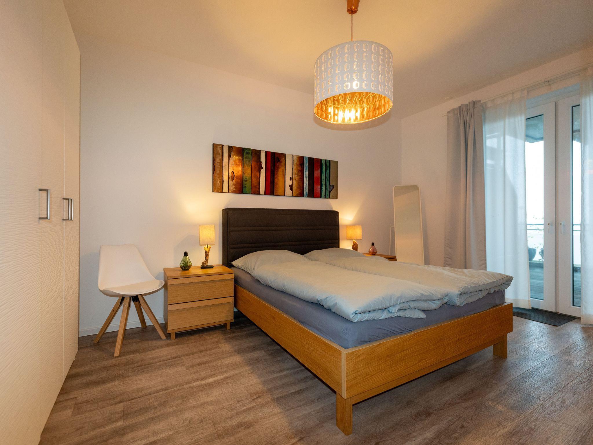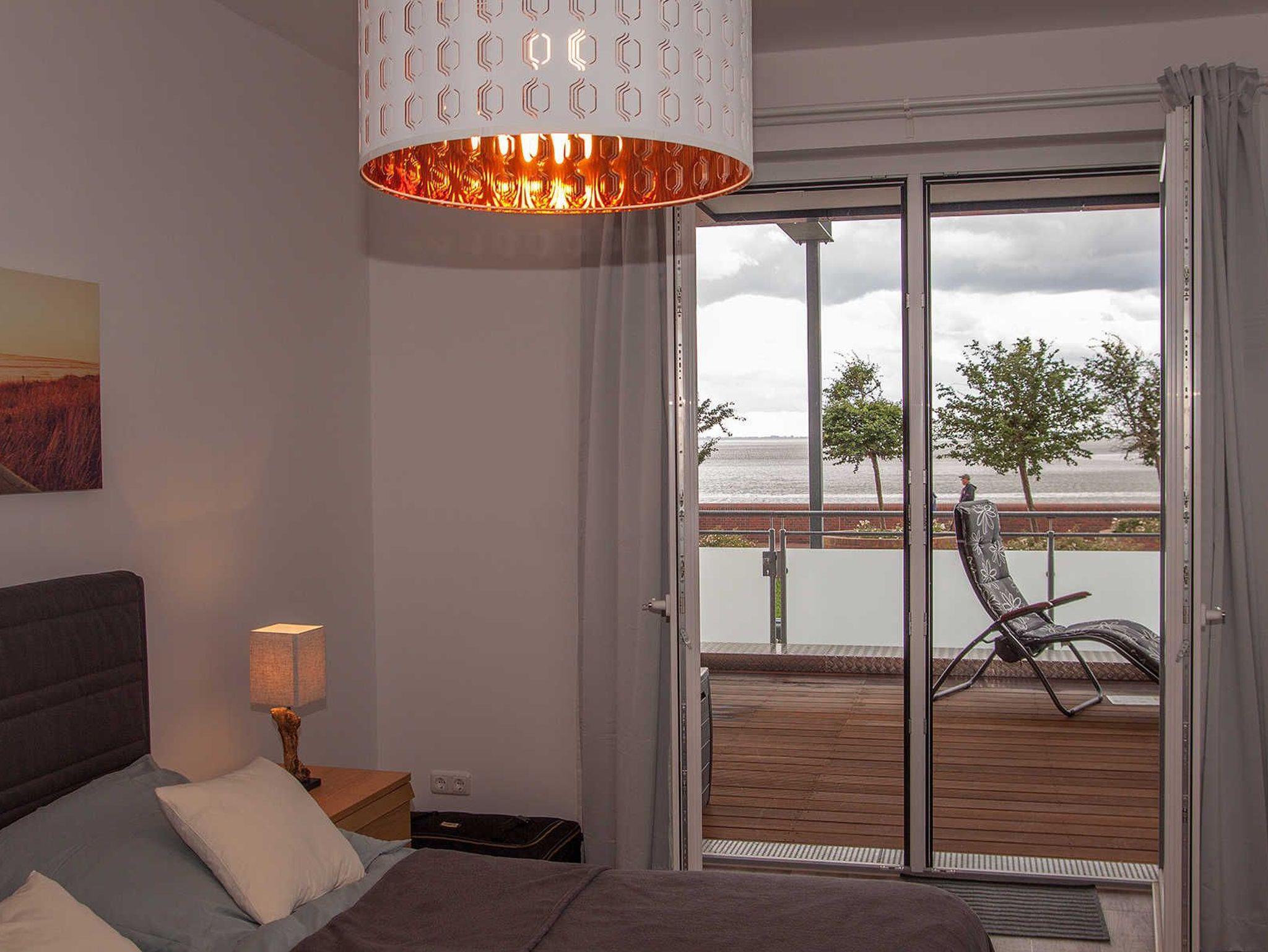 Das Sofa kann zu einer zusätzlichen Schlafgelegenheit umgebaut werden. Im Schlafzimmer befindet ein großes Doppelbett und ein Kleiderschrank. Vom Wohn- und Schlafzimmer gelangen Sie auf den Balkon mit Blick auf die Nordsee bis hin zum Leuchtturm Arngast.