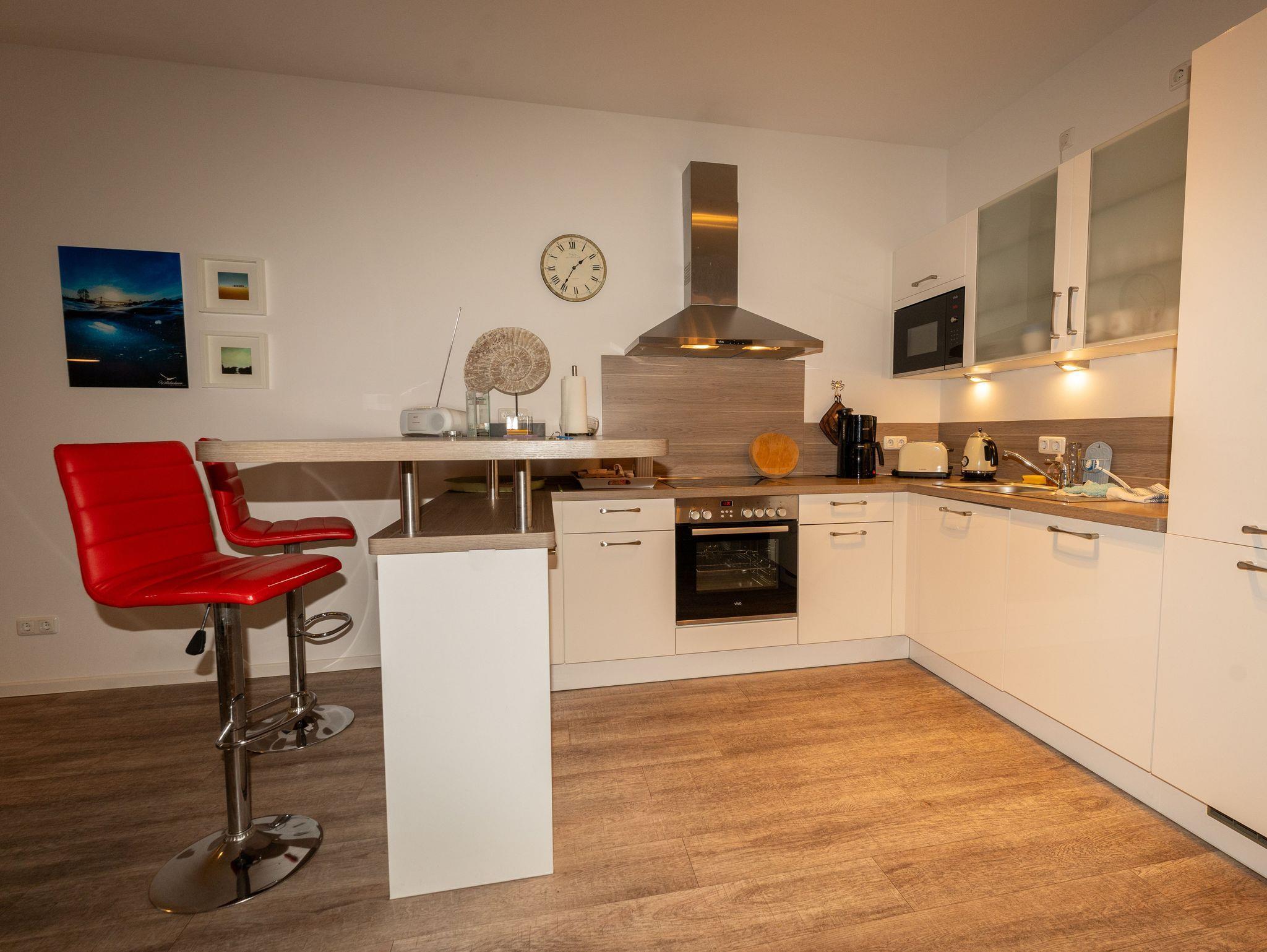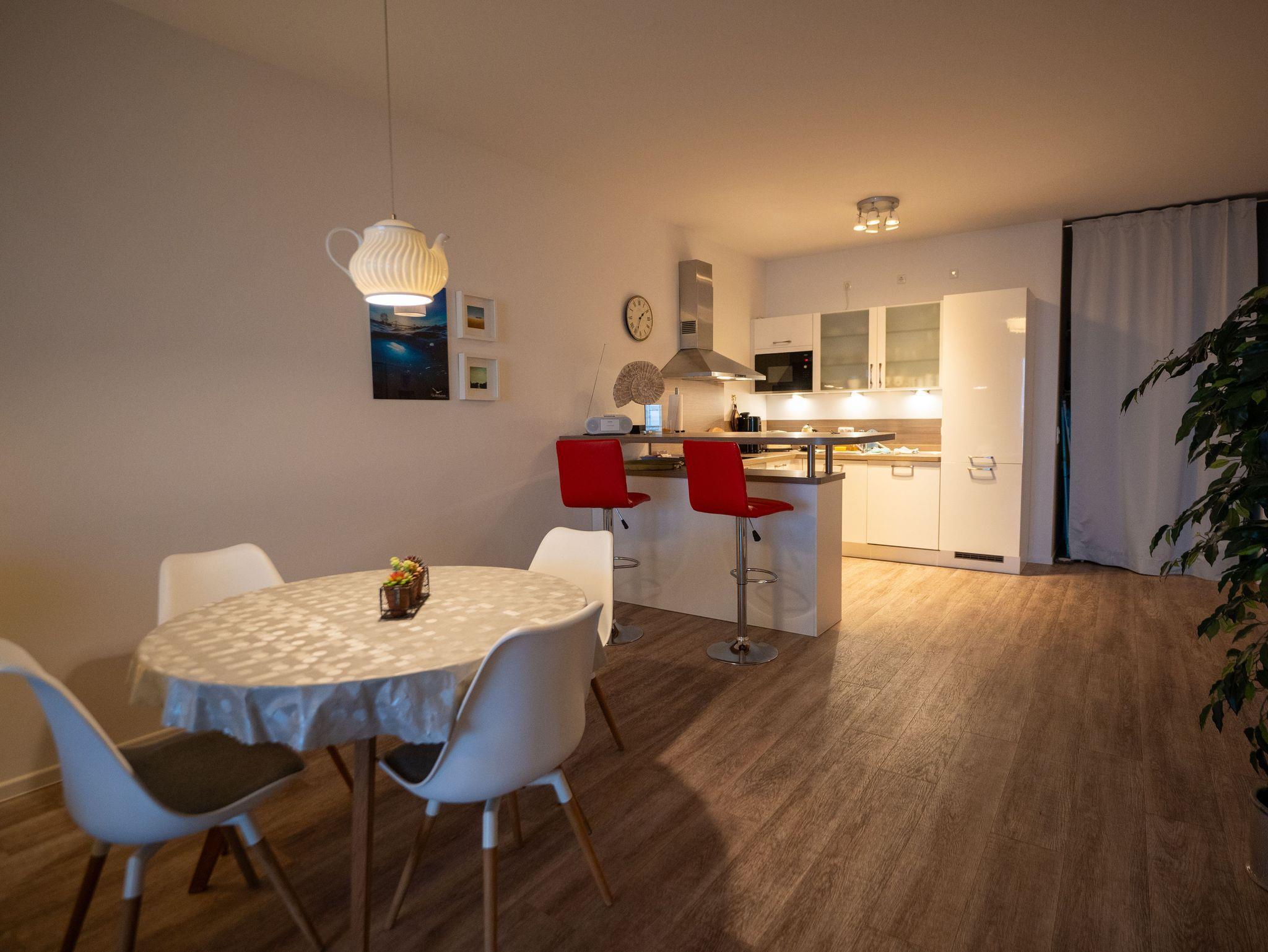 Nach dem Betreten der Wohnung in der 1.Etage gelangt man durch einen Flur in den großzügigen Wohn- und Essbereich, der gemütlich, stilvoll eingerichtet und lichtdurchflutet ist. Die moderne Küche mit einem Esstresen ist umfangreich ausgestattet. Ein Esstisch mit vier Stühlen lädt zum Essen, Spielen oder Arbeiten ein.