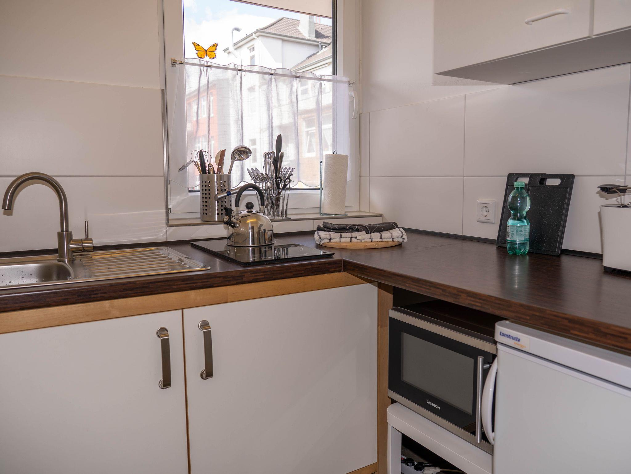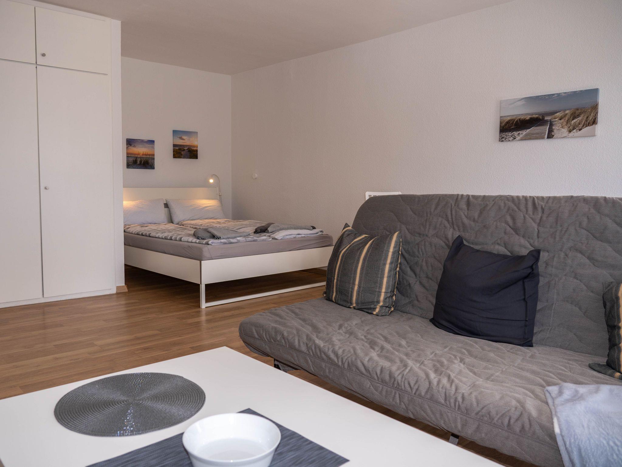 Modernes und geschmackvolles 1-Zimmer-Apartment mit Süd-Balkon und voll ausgestatteter Einbauküche, Duschbad, WLAN sowie Doppelbett und Schlafsofa und modernem Smart-TV.