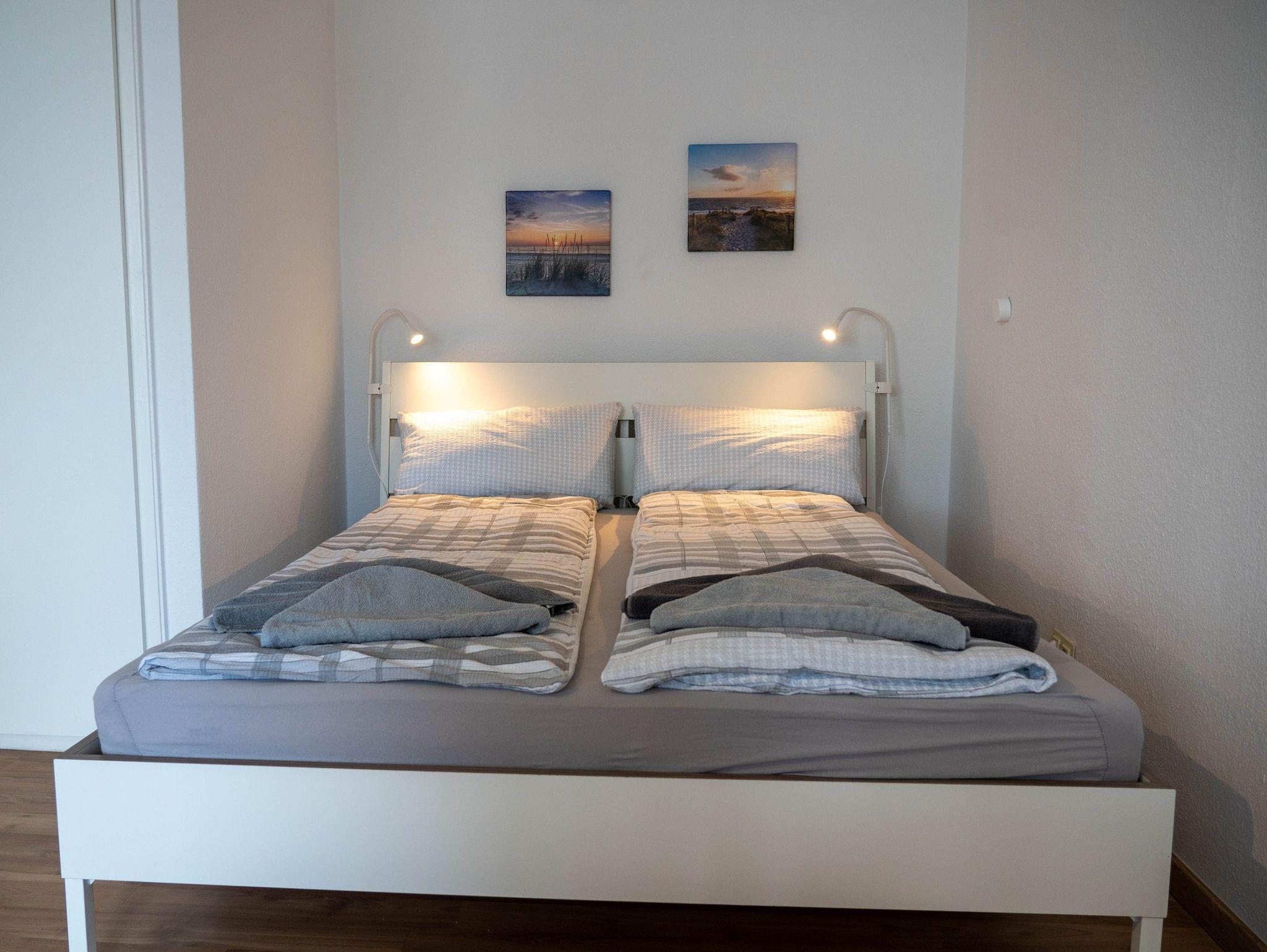 Der großzügige Wohn-/Schlafraum ist ausgestattet mit einem Doppelbett, 1,60m breit, einer gemütlichen Sitzecke mit Smart-TV. Auch ist ein Essplatz mit im Wohnraum untergebracht. Die voll ausgestattete, moderne Küche verfügt über eine Kaffeemaschine, einen Ceranfeldherd mit Backofen, Wasserkocher und Toaster sowie einem Kühlschrank mit Gefrierfach.