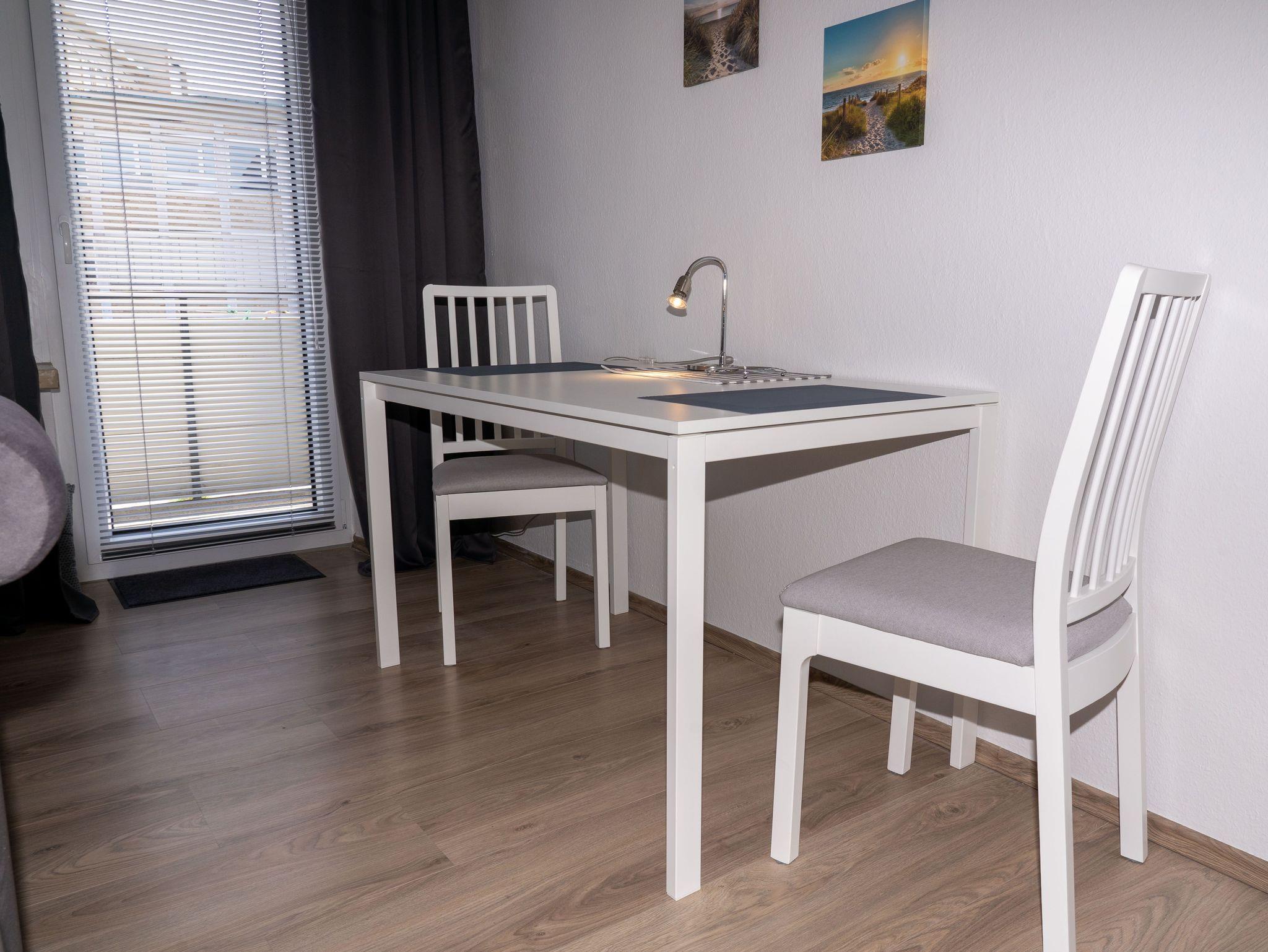 Der großzügige Wohn-/Schlafraum ist ausgestattet mit einem Doppelbett, 1,60m breit, einer gemütlichen Sitzecke mit Smart-TV. Auch ist ein Essplatz mit im Wohnraum untergebracht. Die voll ausgestattete, moderne Küche verfügt über eine Kaffeemaschine, einen Ceranfeldherd mit Backofen, Wasserkocher und Toaster sowie einem Kühlschrank mit Gefrierfach.