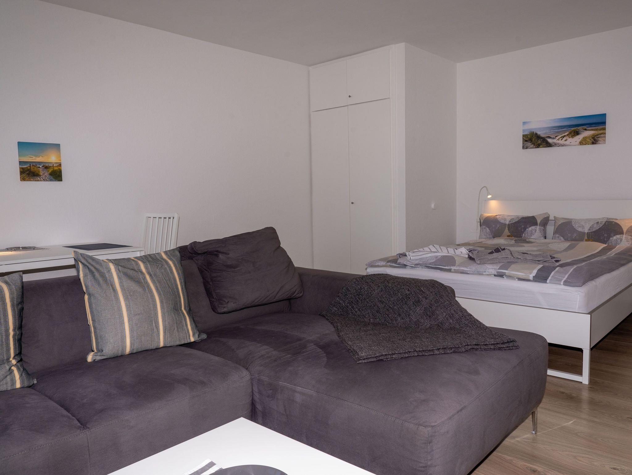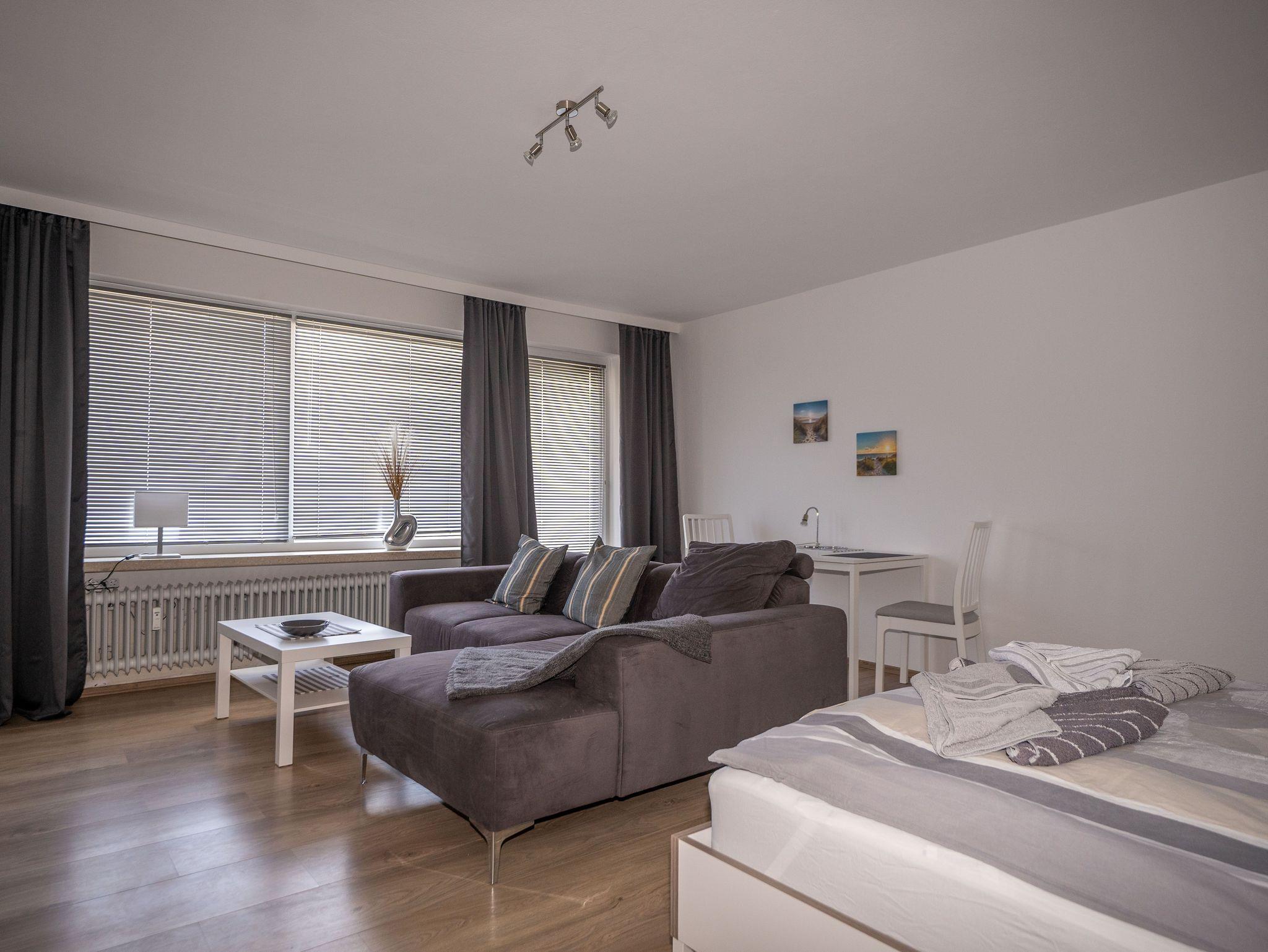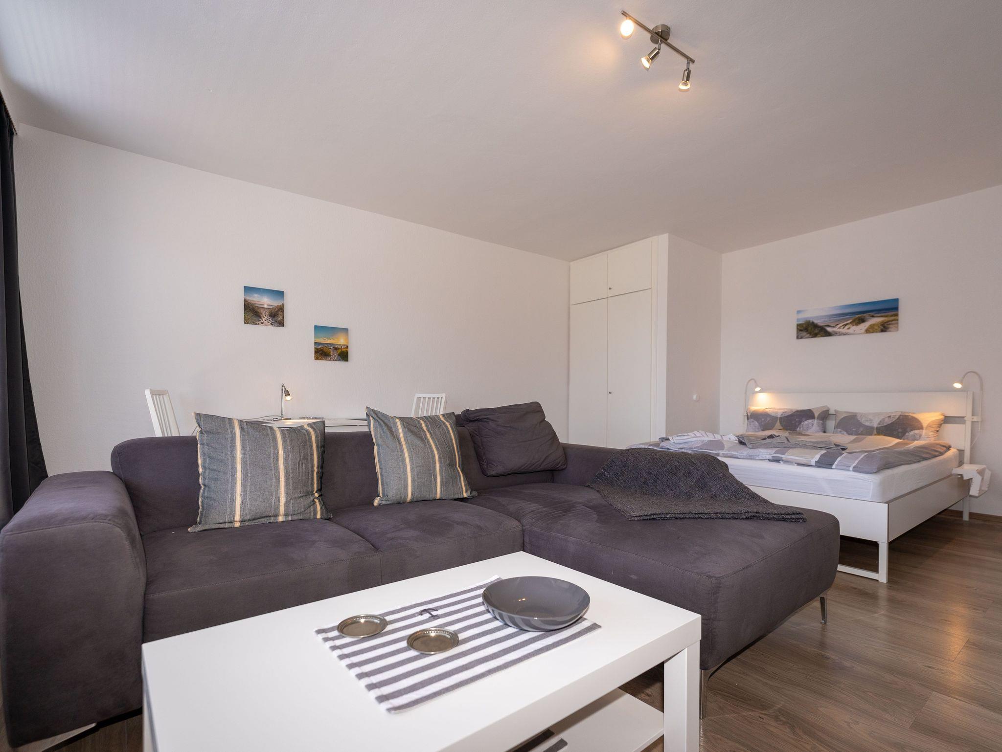 Modernes und geschmackvolles 1-Zimmer-Apartment mit Süd-Balkon und voll ausgestatteter Einbauküche, Duschbad, WLAN sowie Doppelbett und Schlafsofa und modernem Smart-TV.