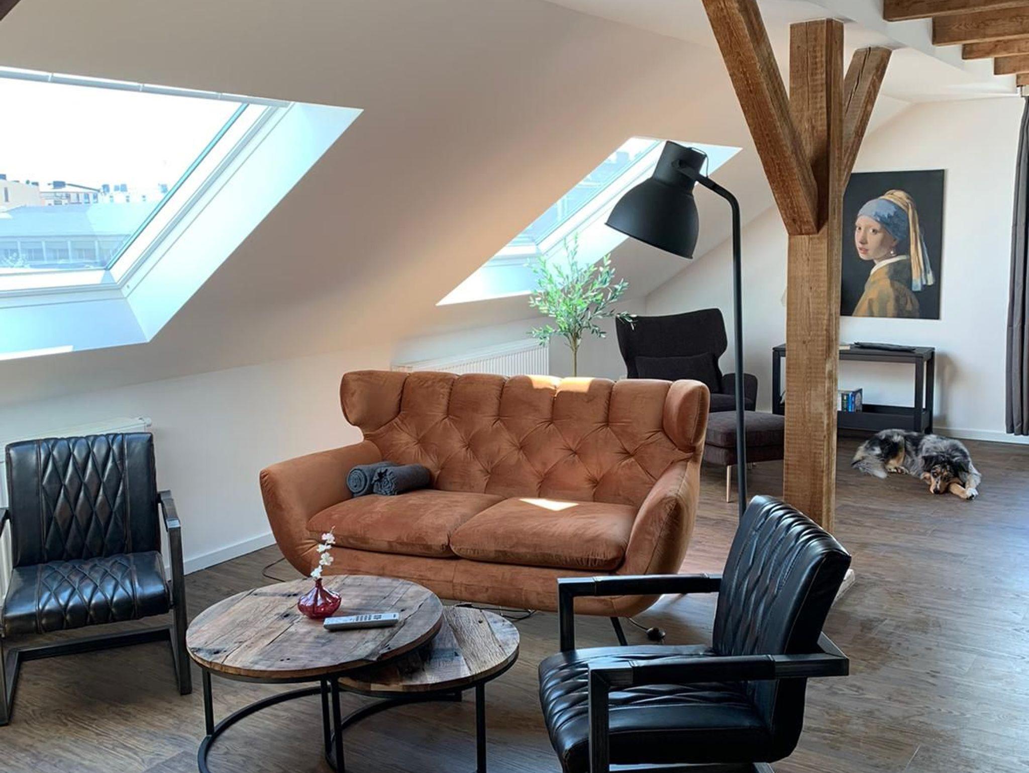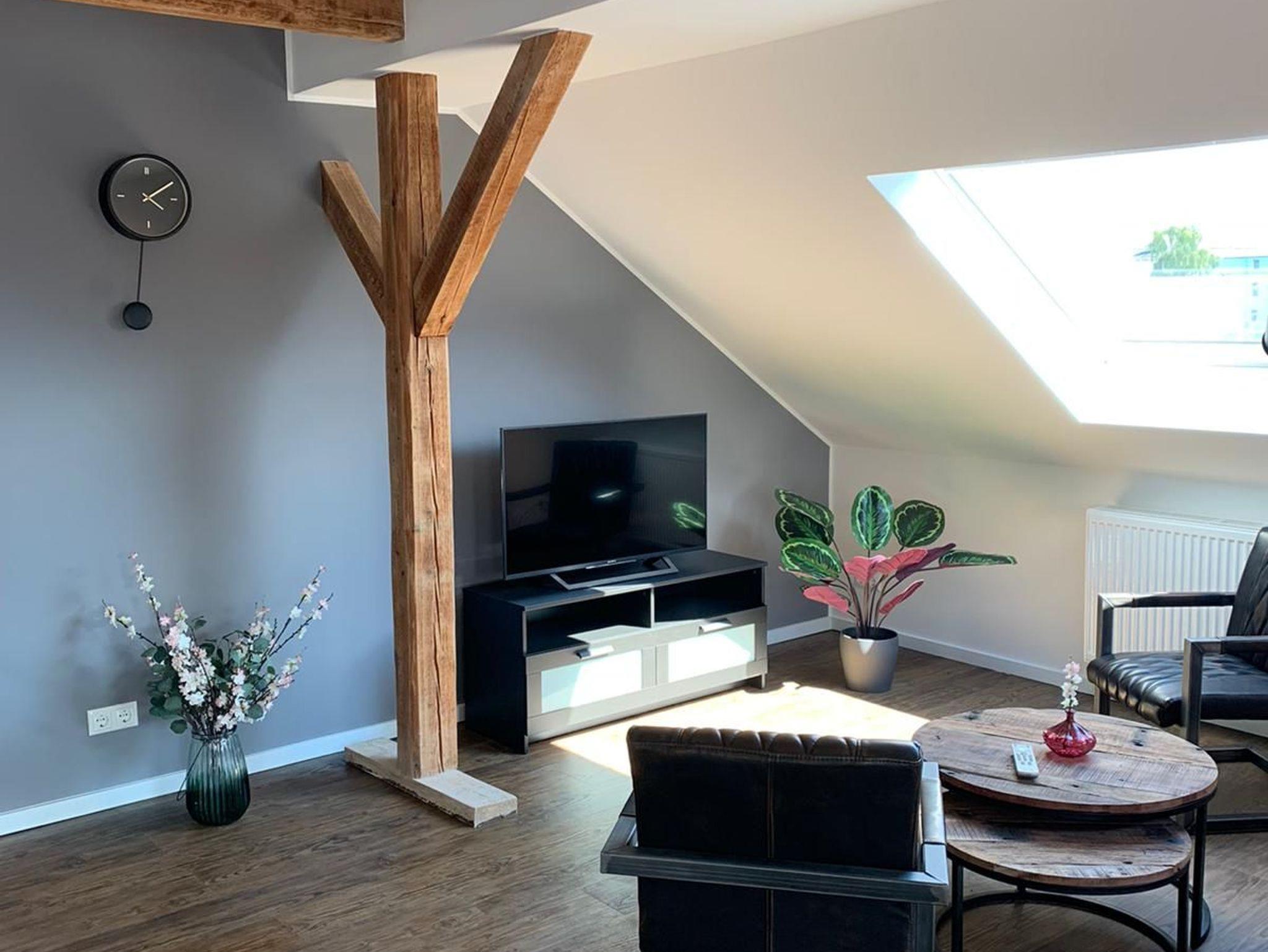 Unter der Dachschrägen befindet sich eine Wohnung mit drei Schlafzimmern, ein gemütlicher Wohnbereich mit offener Küche, eine Couch mit gemütlichen Sesseln sowie einem modernen Bad mit Dusche.