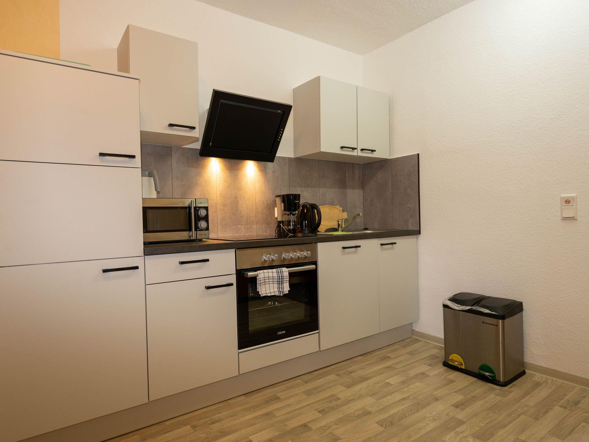 Die Küche ist komplett ausgestattet mit einer Einbauküche. Wasserkocher, Kaffeemaschine, Herd , Kühlschrank und eine Mikrowelle sind vorhanden. Ein gemütlicher Essplatz gehörtz ebenfalls mit zur Küche.
