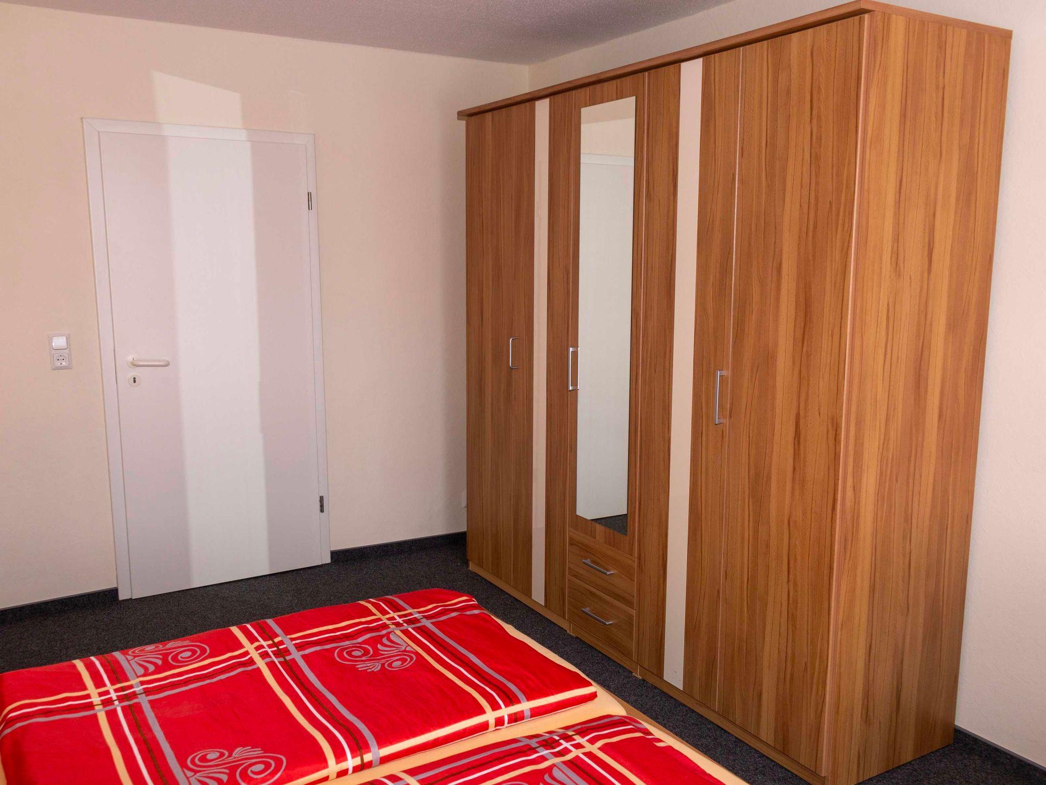 Das Schlafzimmer ist mit einem Dopelbett und Kleiderschrank ausgestattet.