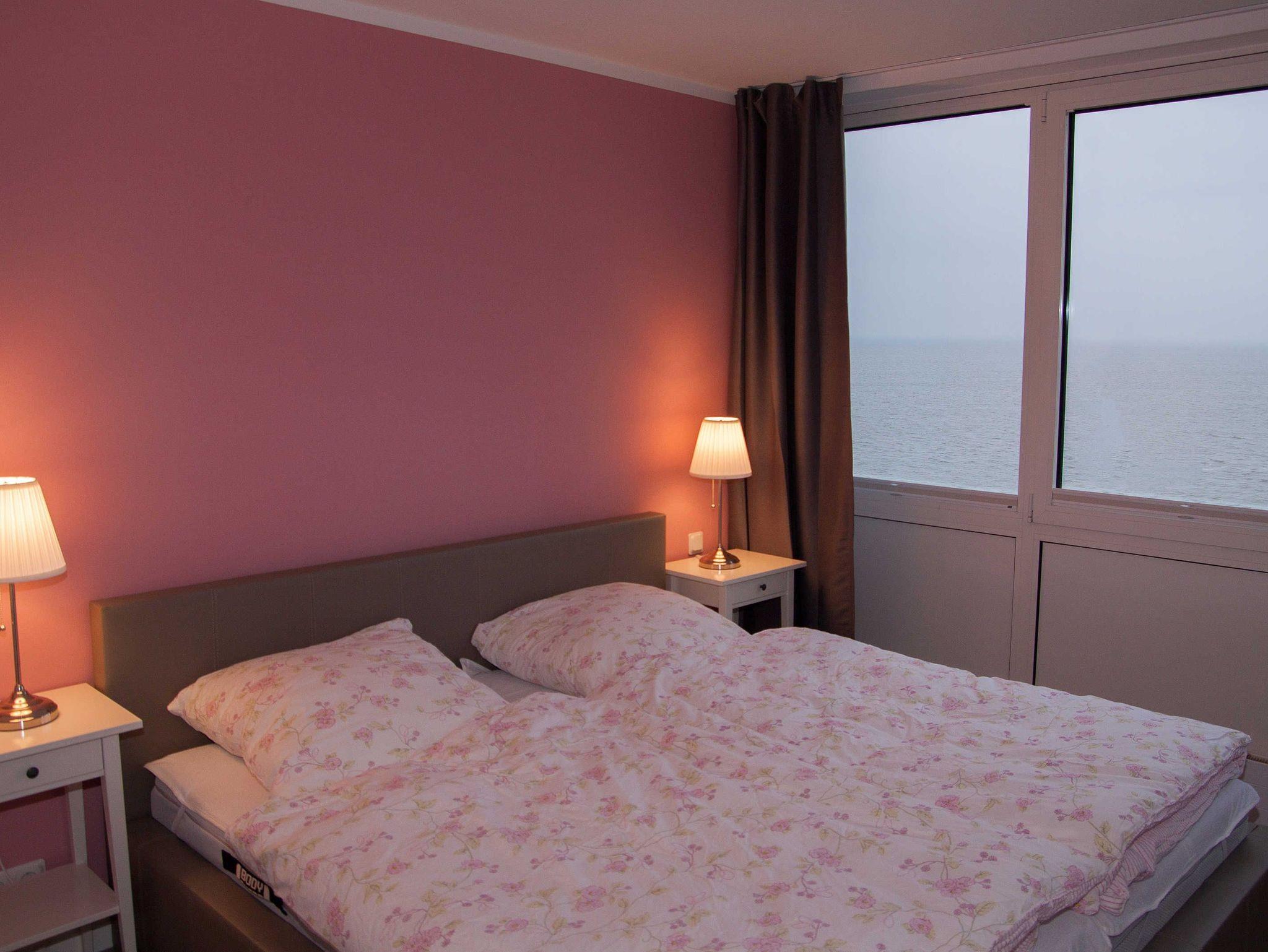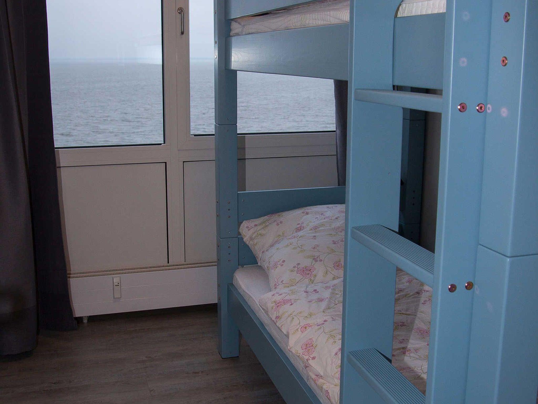 Diese große Ferienwohnung ist für maximal vier Personen ausgelegt. Sie verfügt über einen großen, offenen Wohn-, und Kochbereich, zwei Schlafzimmer, einem Bad und einem Flur. Die Küche ist umfangreich ausgestattet. Über den Geschirrspüler, einer Kaffemaschine für die Kaffeezubereitung, einer Mikrowelle, einem Wasserkocher, dem Ceranfeld-Herd mit Backofen bis hin zum Kühlschrank mit Eisfach ist alles vorhanden. Ein moderner Fernseher, ein DVD-Player lädt zum Verweilen auf dem Sofa ein. Das Schlafzimmer verfügt über ein großes Doppelbett, das zweite Schlafzimmer ist kleiner und mit einem Etagenbett ausgestattet. Beide Schlafzimmer bieten ebenfalls den grandiosen Blick auf die Nordsee. Diese Wohnung bietet den Gästen WLAN an.