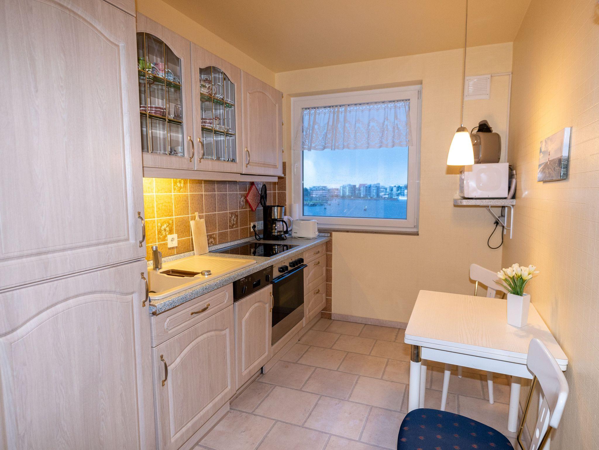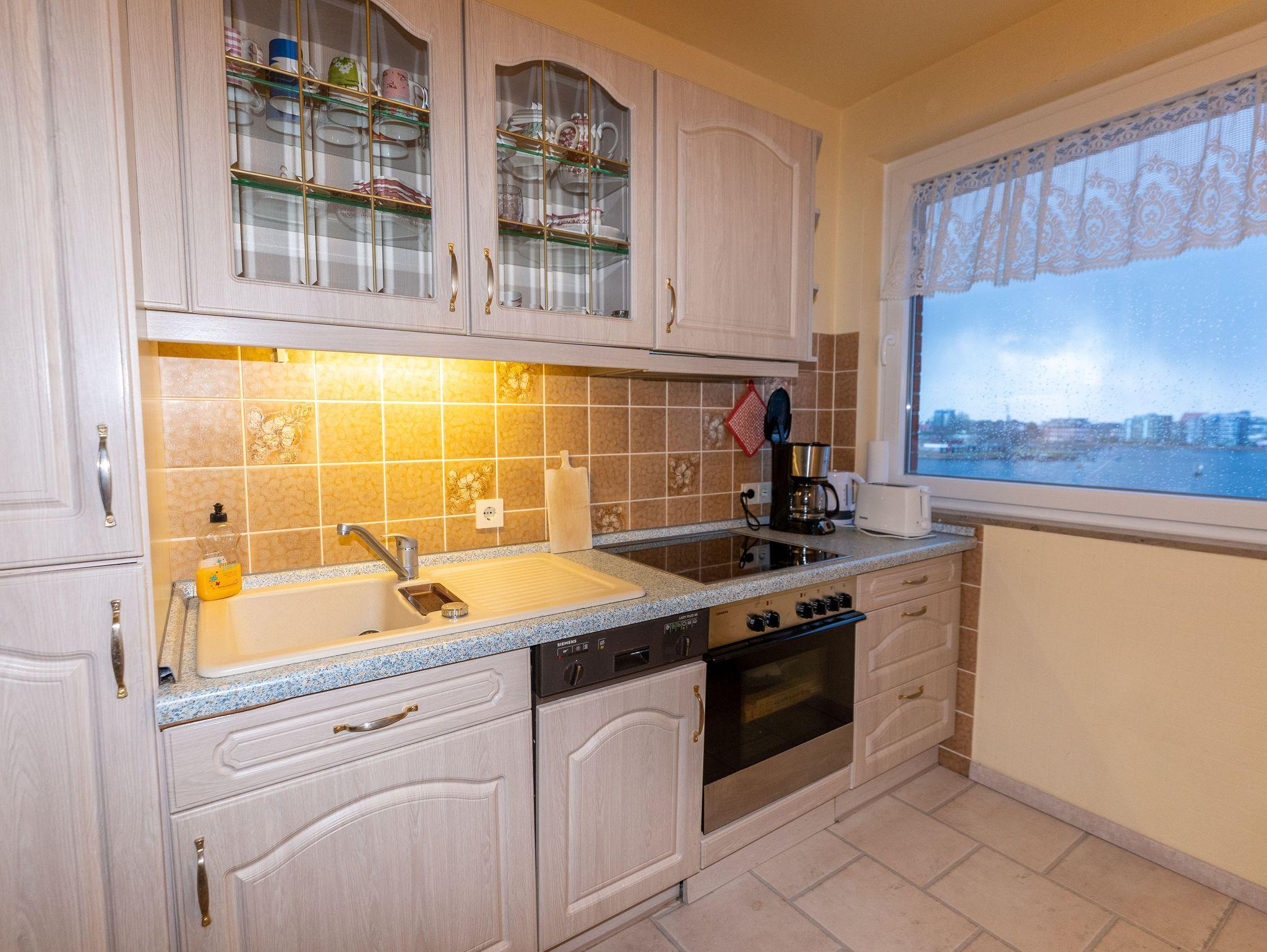 Die Küche bietet dem Gast alles, was er braucht, um kulinarisch zu zaubern. Mikrowelle, E-Herd, Kaffeemaschine, Geschirrspüler, Toaster, Kühlschrank finden Platz in der Einbauküche.