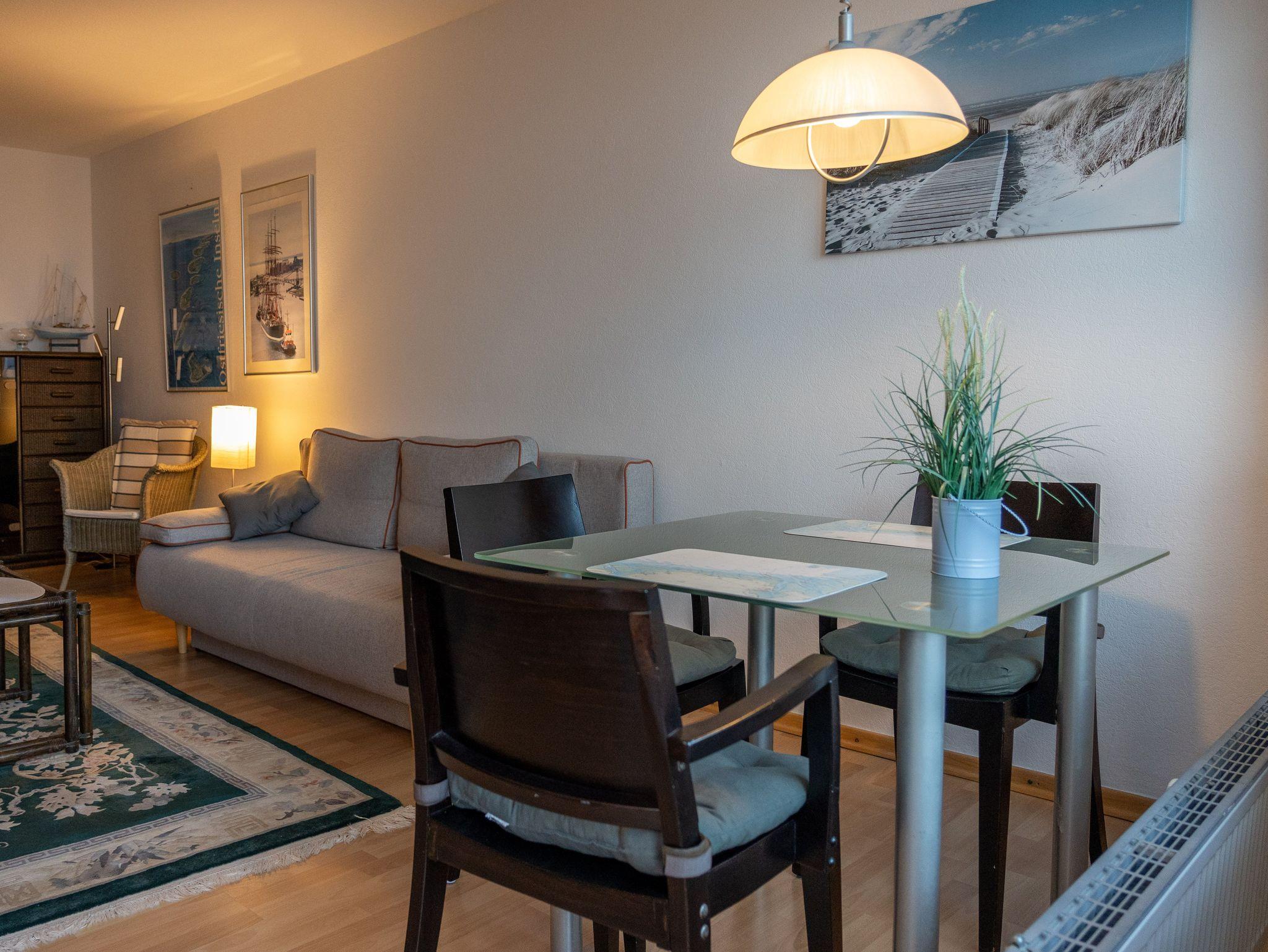 Im Schlafzimmer befindet sich ein Doppelbett mit großem Kleiderschrank. Das Wohnzimmer ist mit einer Schlafcouch ausgestattet und lässt sich bei Bedarf in ein weiteres Bett für eine weitere Person verwandeln. Ein Esstisch mit Stühlen ist direkt am großen Fenster untergebracht. Genießen Sie den weiten Blick aufs Meer. Über den modernen Flachbildschirm können Sie fernsehen. WLAN ist selbstverständlich vorhanden.