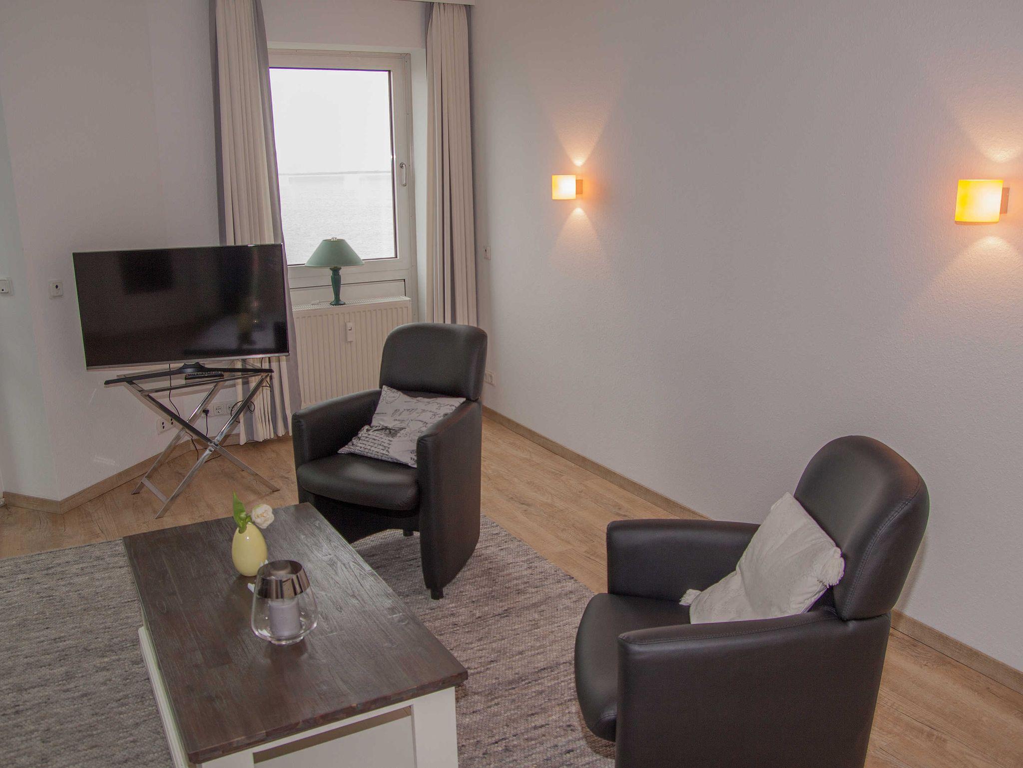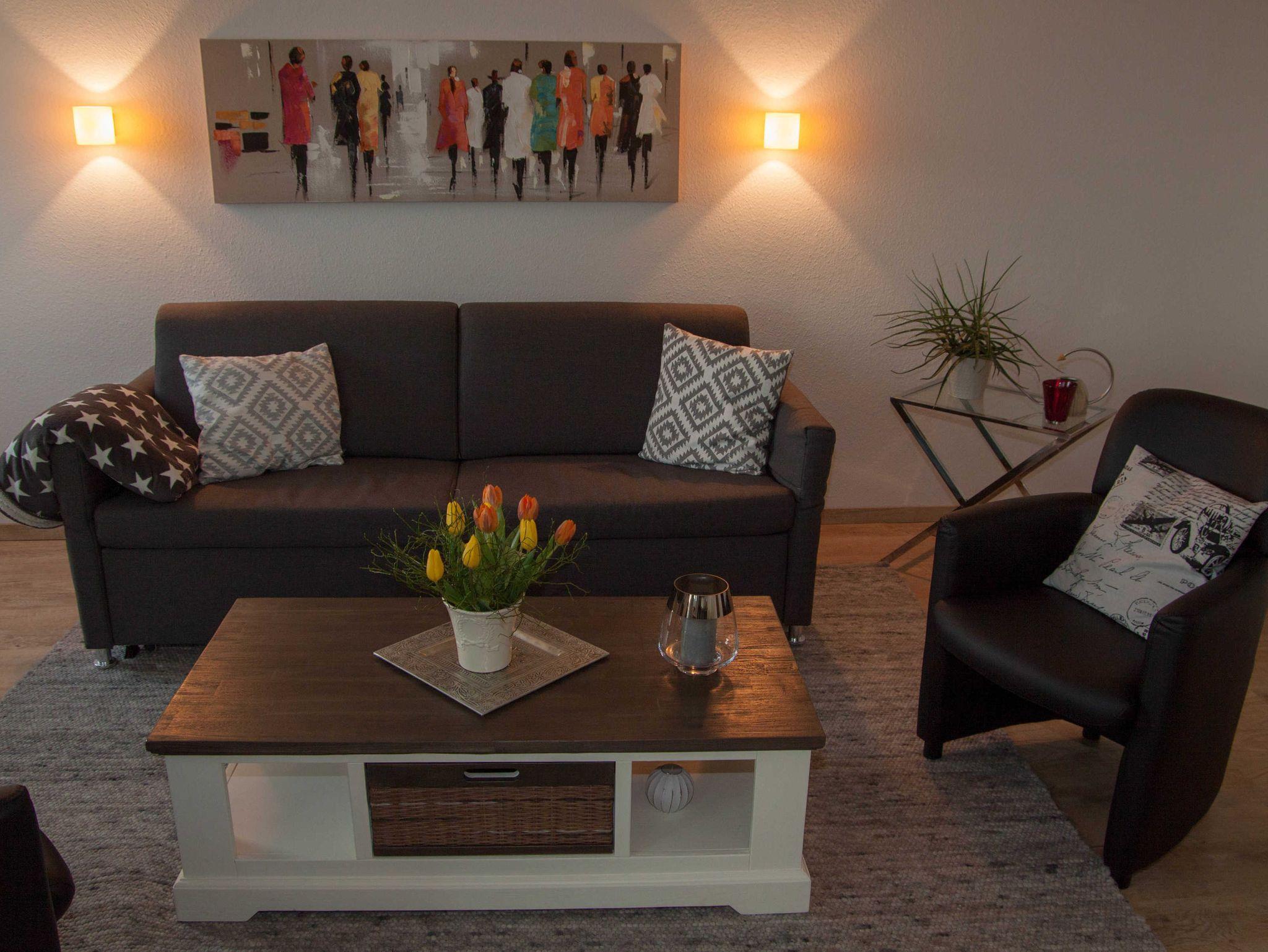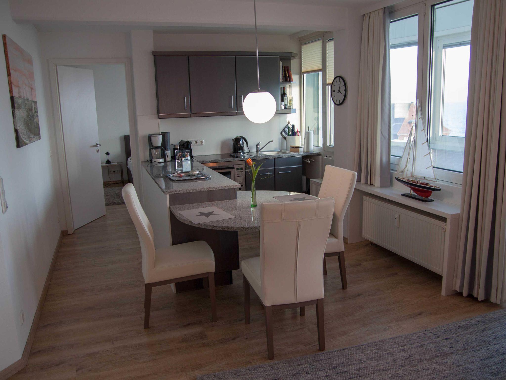 Exklusiv ausgestattete Ferienwohnung auf einer Ebene ohne Treppen mit einem Schlafzimmer, offener Wohn-Essbereich inkl. Pkw-Stellplatz in der Tiefgarage, WLAN und Handtüchern und Bettwäsche.
