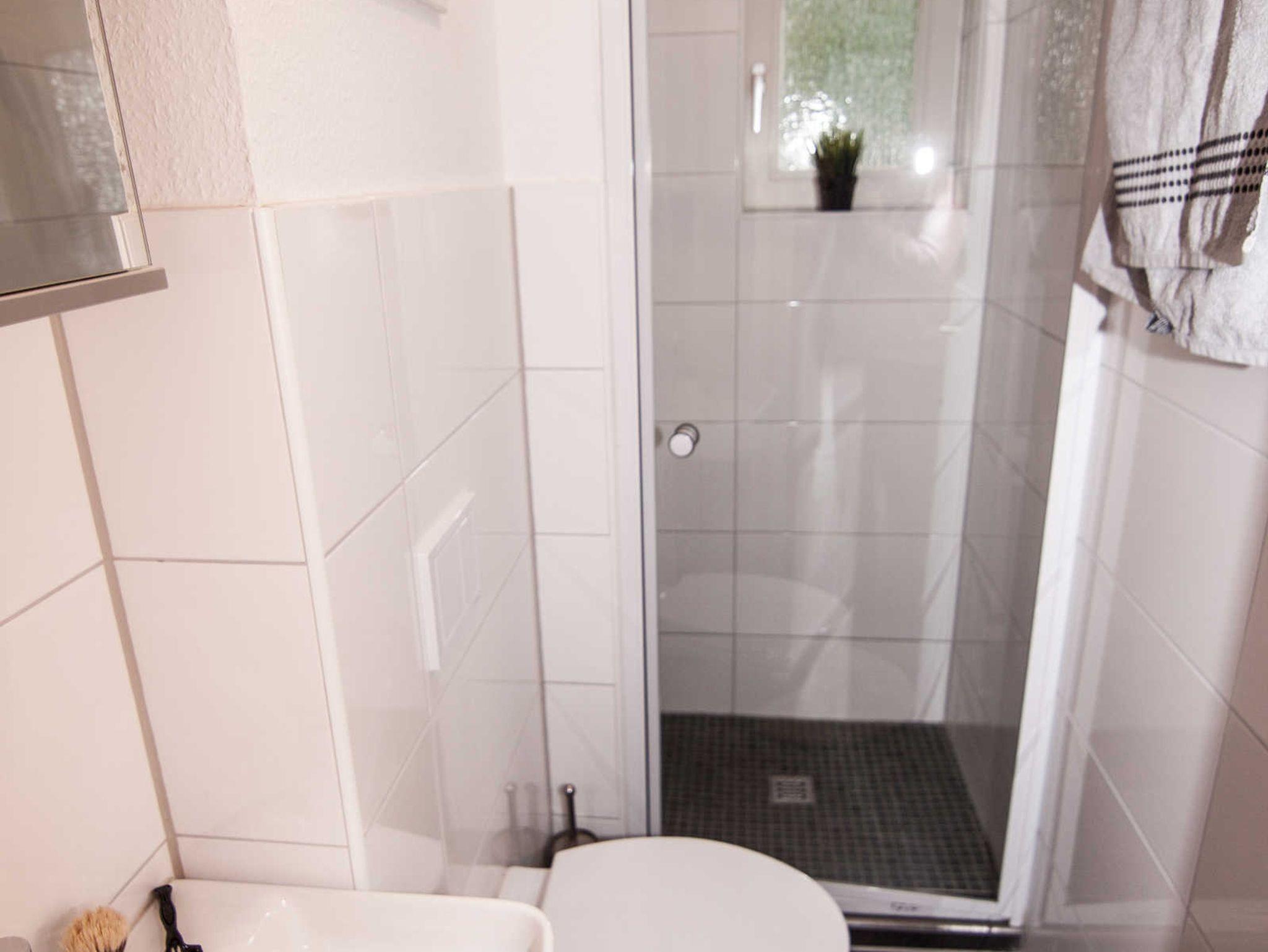Das Tageslichtbad ist im modernen Stil renoviert worden und bietet Ihnen eine Dusche nahezu ohne Barrieren.