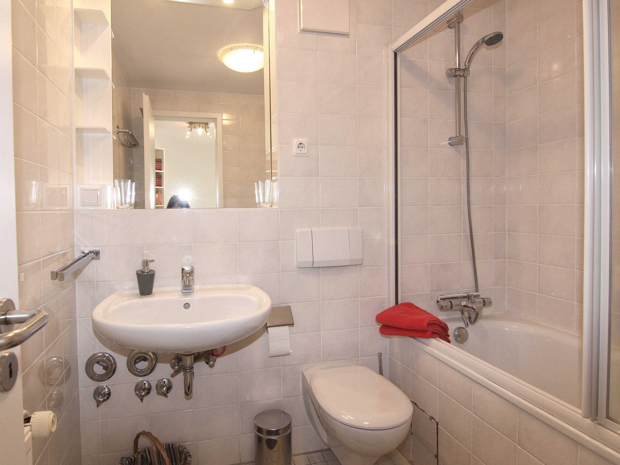 Waschmaschinen und Trockner sind in einem Waschraum im Keller untergebracht und sind über Münzen zu bedienen. Ein schmaler Garagenstellplatz, Einfahrtsbreite 2,35m, gehören ebenfalls zur Ausstattung dieser Wohnung. Ein Lift ist vorhanden.