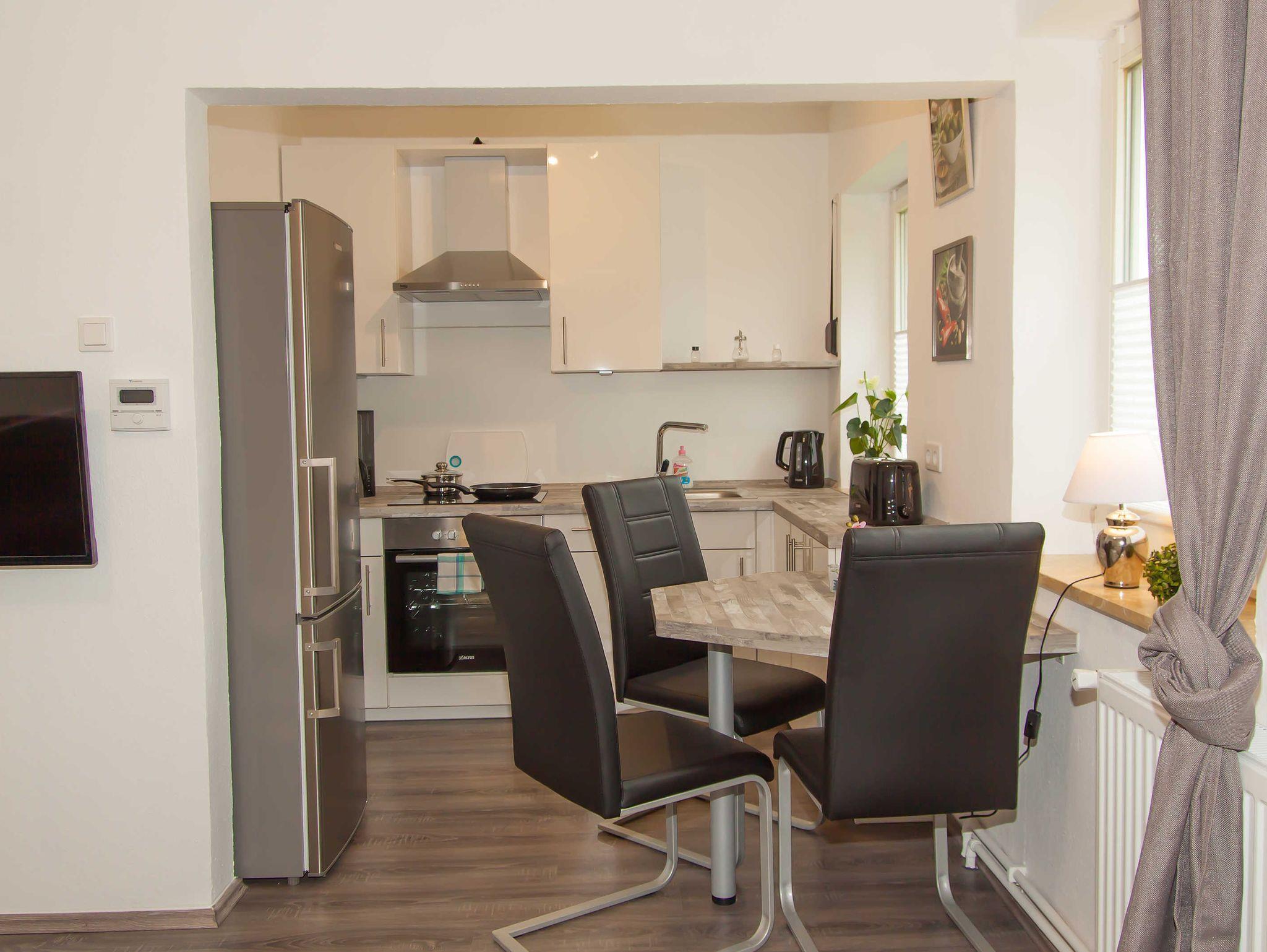 Die Küche ist komplett ausgestattet mit Kaffeemaschine, Wasserkocher, Kühl-Gefrierkombination, Ceranfeldherd . Ein Esstisch mit sehr bequemen Stühlen laden zum Speisen ein.