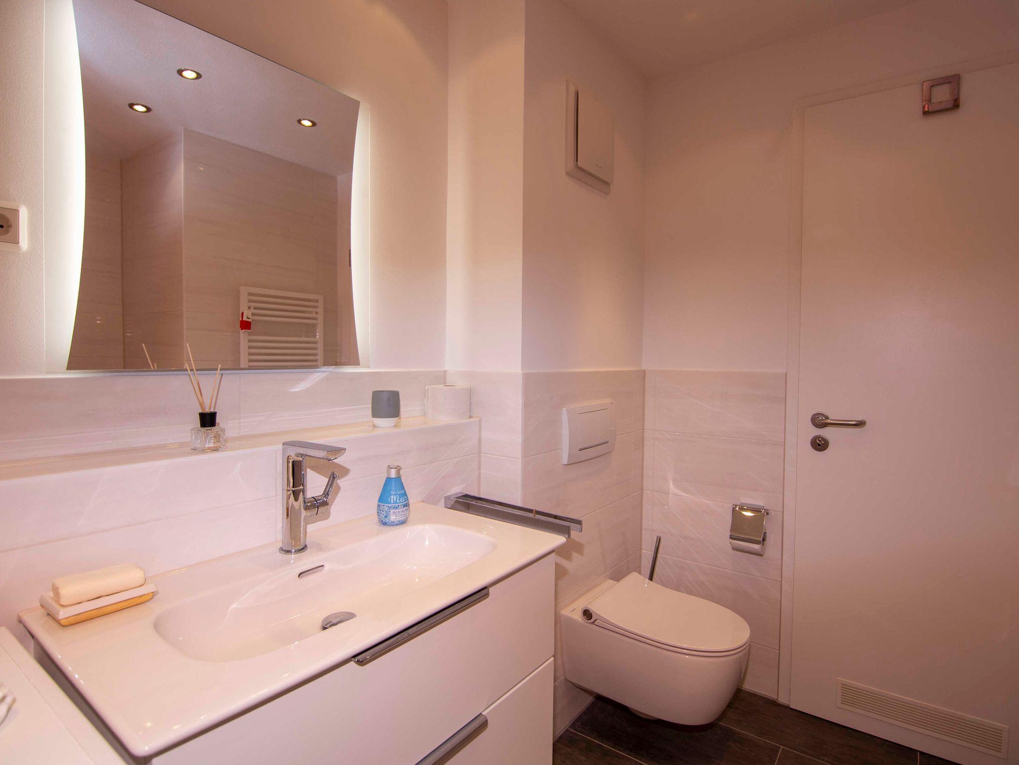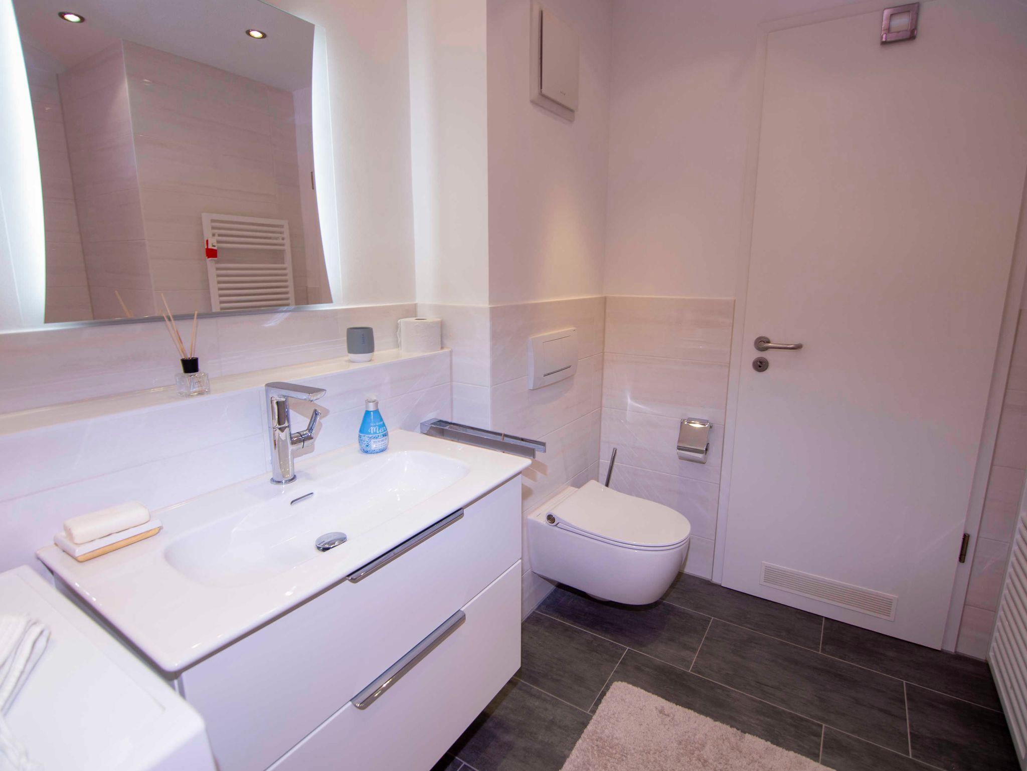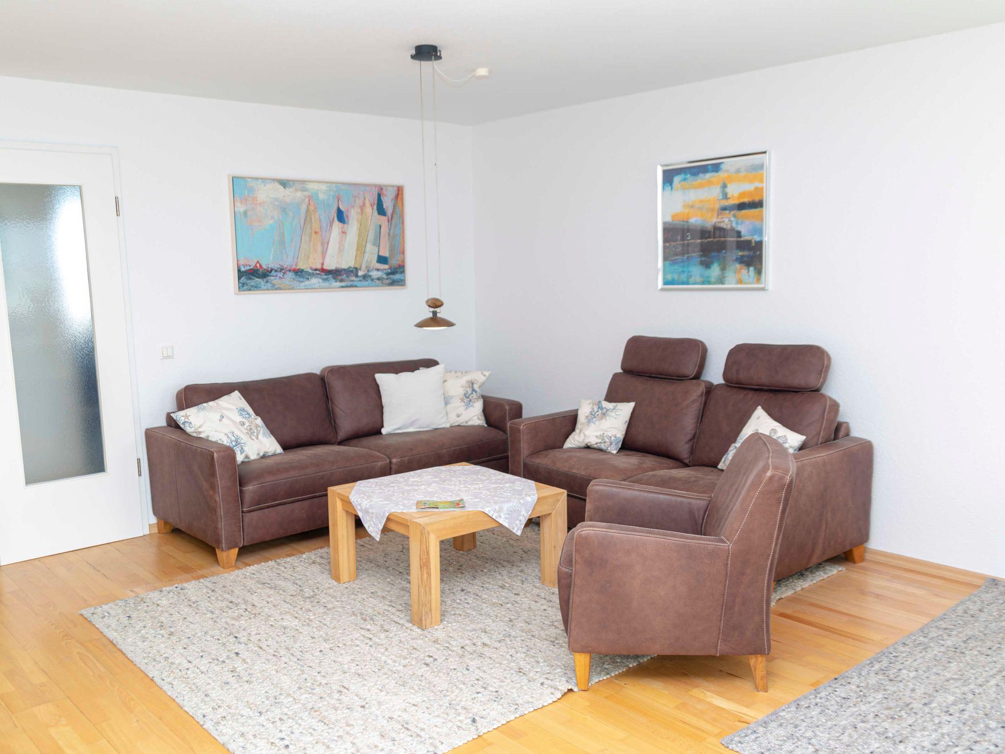 Exklusiv ausgestattete Ferienwohnung auf einer Ebene ohne Treppen mit zwei Schlafzimmern, Wohnzimmer, Küche, Abstellraum, inkl. Pkw-Außen-Stellplatz, Lift, WLAN und Handtüchern und Bettwäsche.