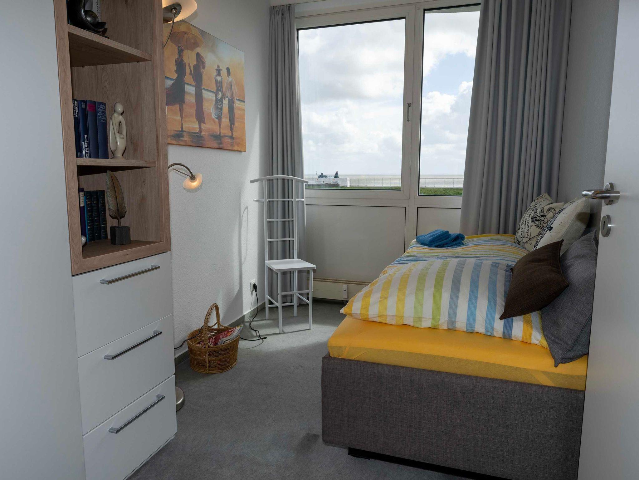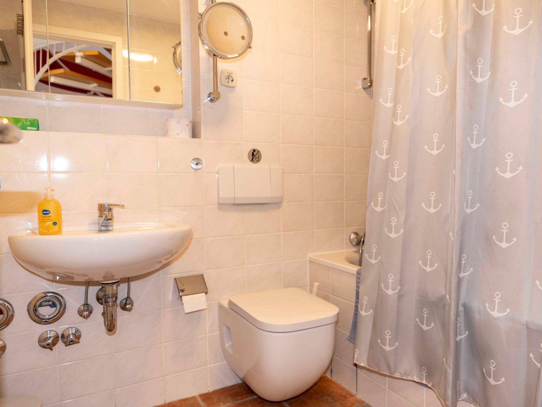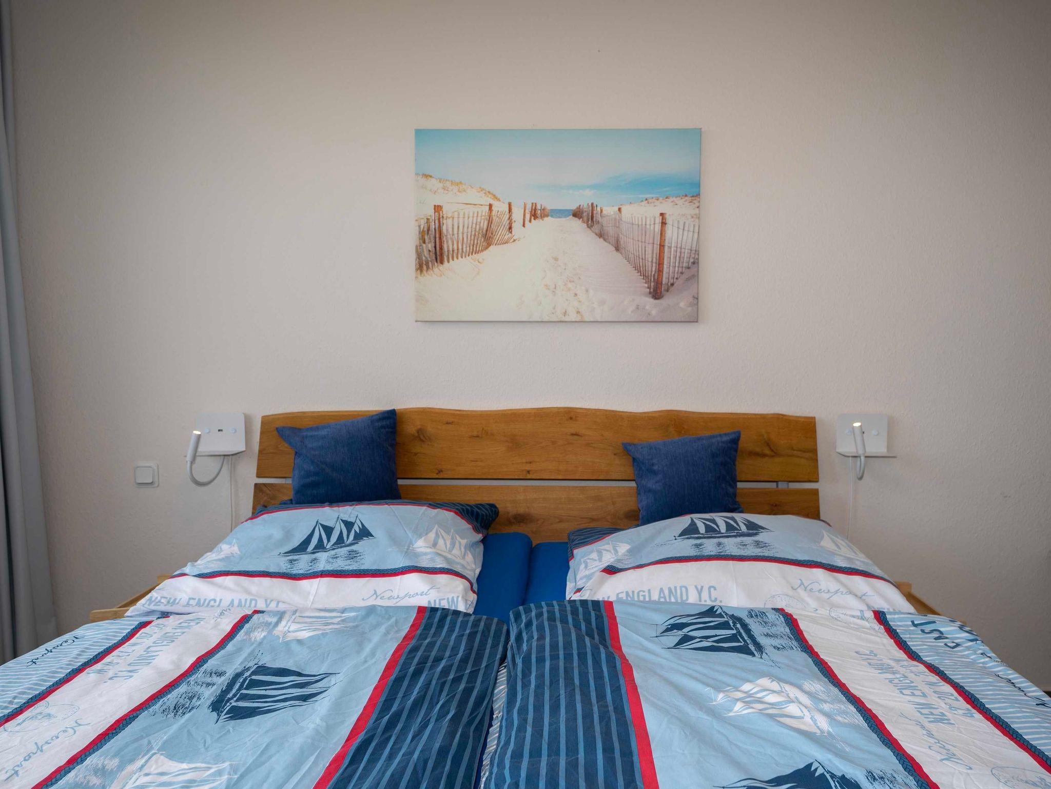 Im Untergeschoss erwarten Sie zwei sehr schön dekorierte Schlafräume mit Doppel- bzw. Einzelbett und einem Bad (WC und Badewanne mit Duschmöglichkeit), die Ihren Aufenthalt in dieser Wohnung zu einem Urlaubserlebnis der besonderen Art werden lassen - Schlafen mit Meerblick! Das Doppelbett (zwei Einzelmatratzen 90x200cm) wurde in 2016 angeschafft und ist mit einem Motorrahmen ausgestattet, der mit einer Fernbedienung mühelos die Höhe des Kopf- und Fußteil einstellt.