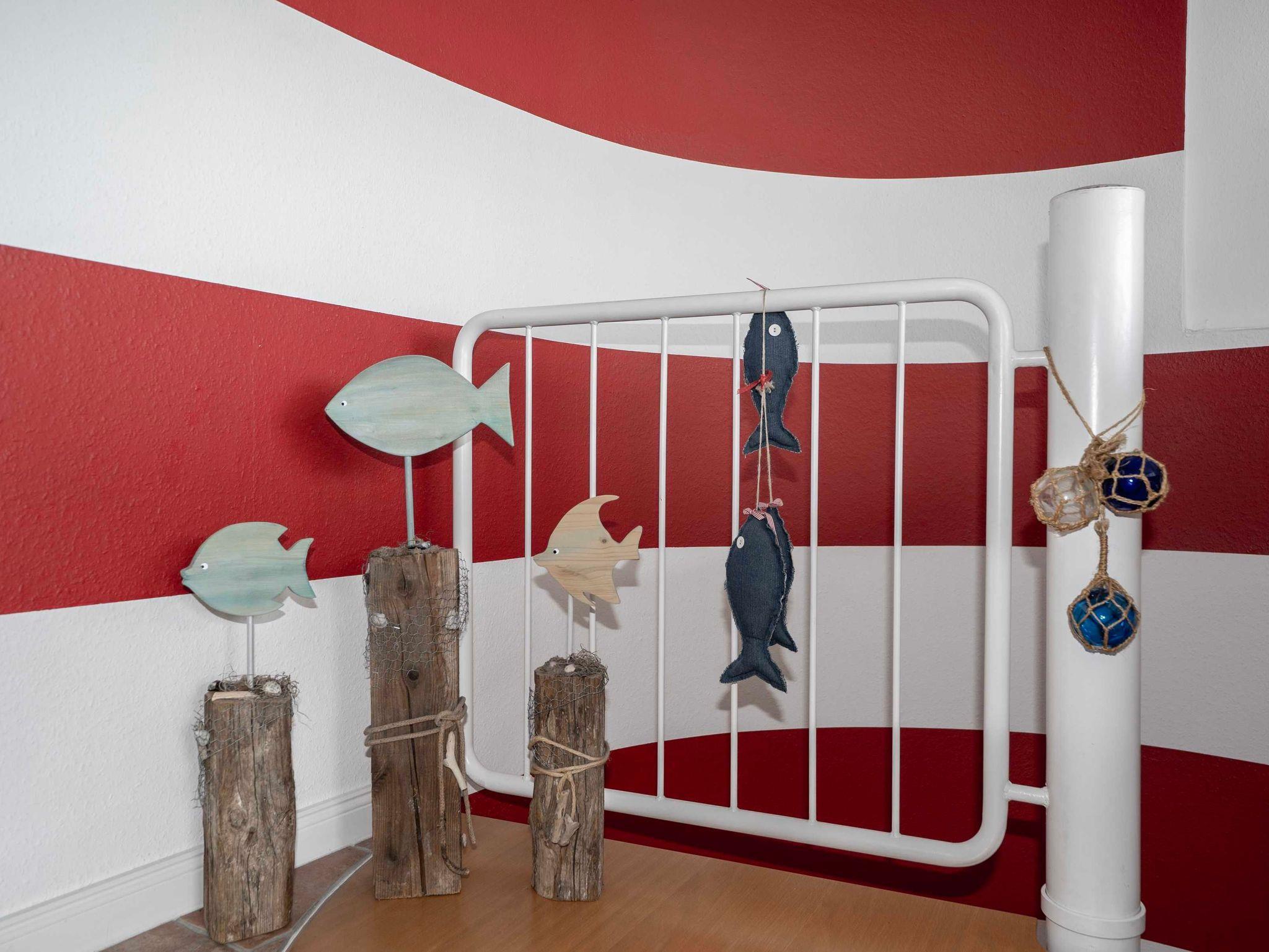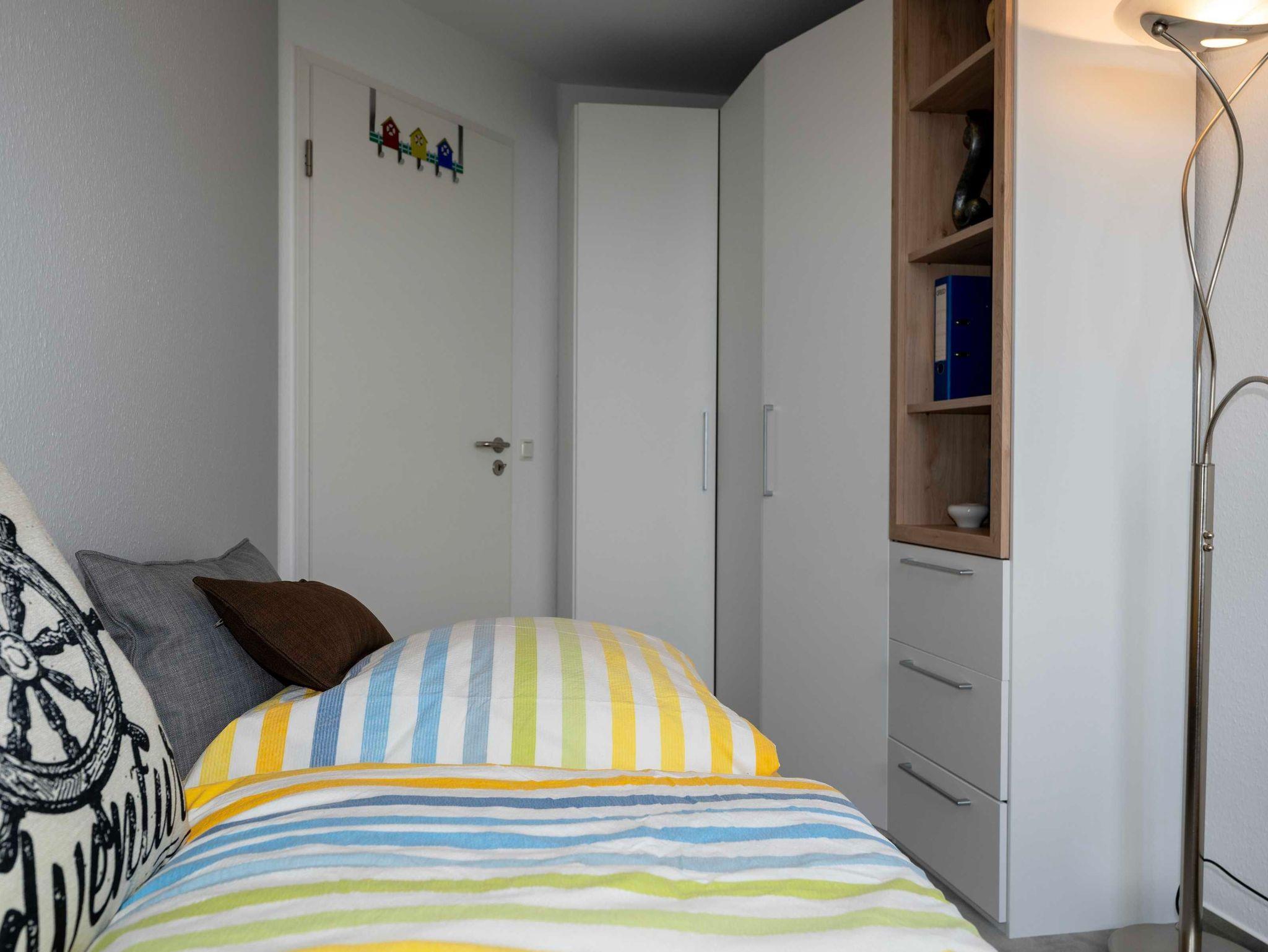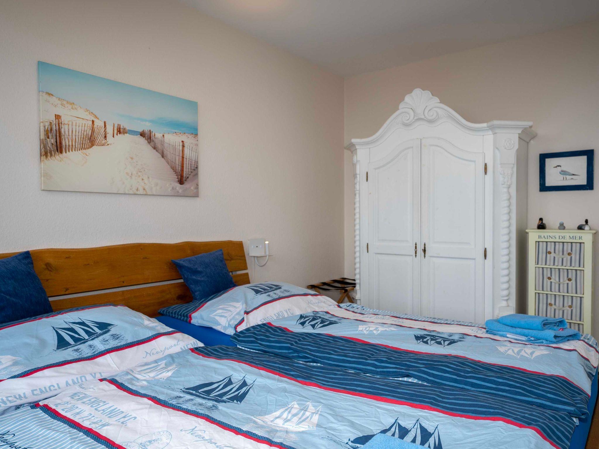 Im Untergeschoss erwarten Sie zwei sehr schön dekorierte Schlafräume mit Doppel- bzw. Einzelbett und einem Bad (WC und Badewanne mit Duschmöglichkeit), die Ihren Aufenthalt in dieser Wohnung zu einem Urlaubserlebnis der besonderen Art werden lassen - Schlafen mit Meerblick! Das Doppelbett (zwei Einzelmatratzen 90x200cm) wurde in 2016 angeschafft und ist mit einem Motorrahmen ausgestattet, der mit einer Fernbedienung mühelos die Höhe des Kopf- und Fußteil einstellt.