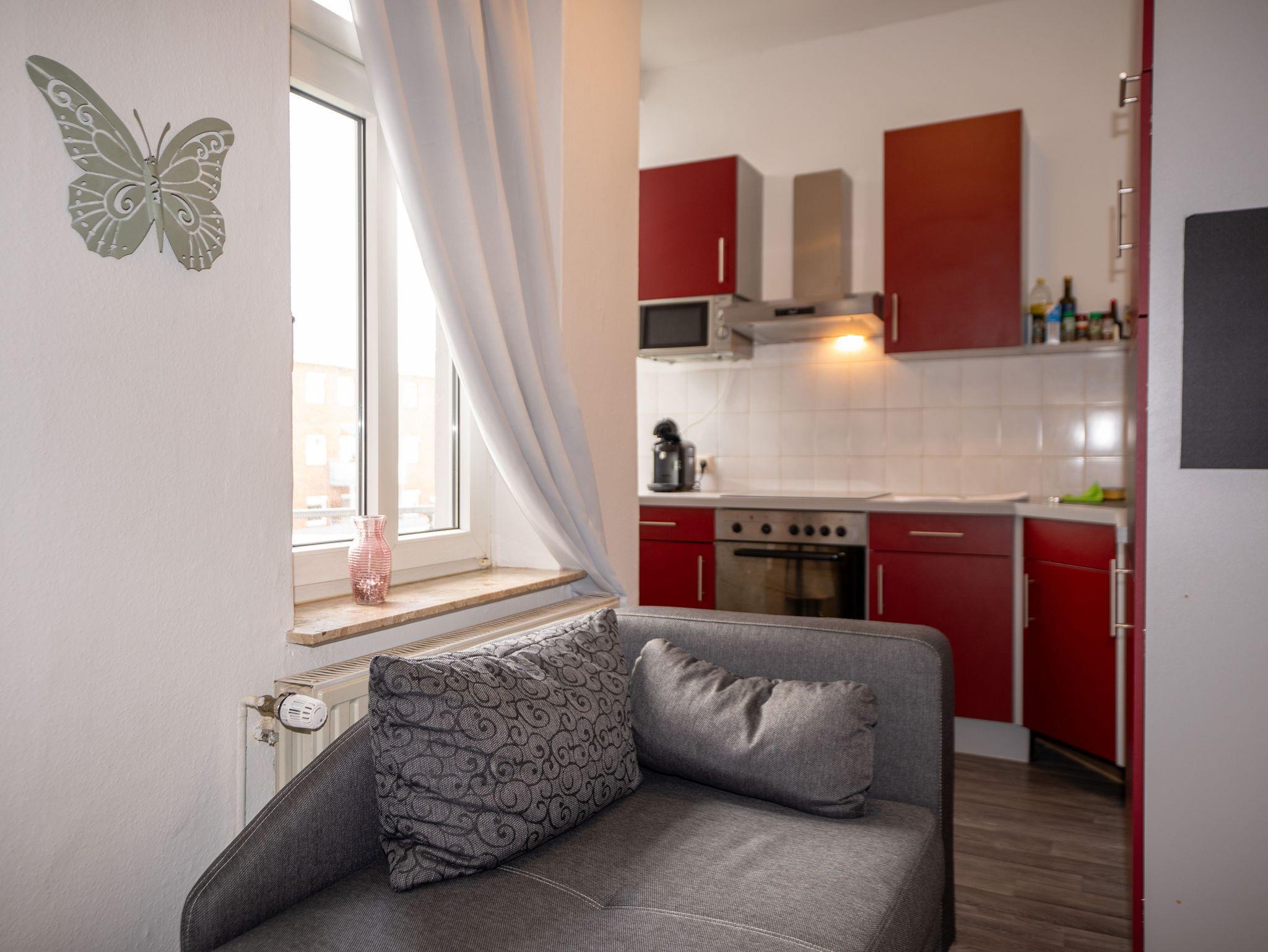Die Wohnung ist mit einem großen Wohn/Schlafraum ausgestattet. Die Sofalandschaft lässt sich problemlos zu einem großen, bequemen Doppelbett zusammenschieben. Ein Kinderreisebett ohne weitere Ausstattung ist ebenfalls vorhanden. Eine kleine Leseecke hat in diesem großzügigen Wohnraum ebenfalls einen Platz gefunden. Kabel-TV, Apple-TV und WLAN stehen Ihnen zur Verfügung.