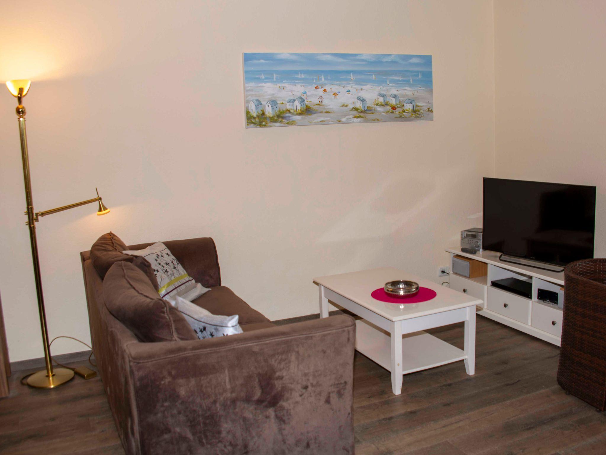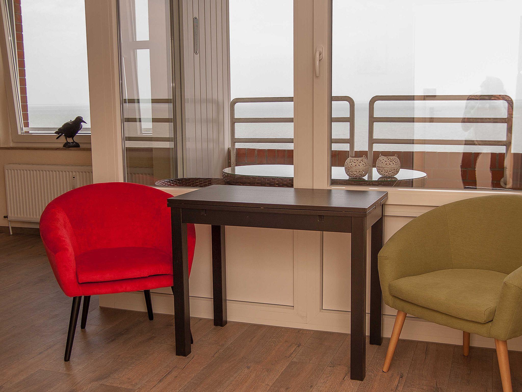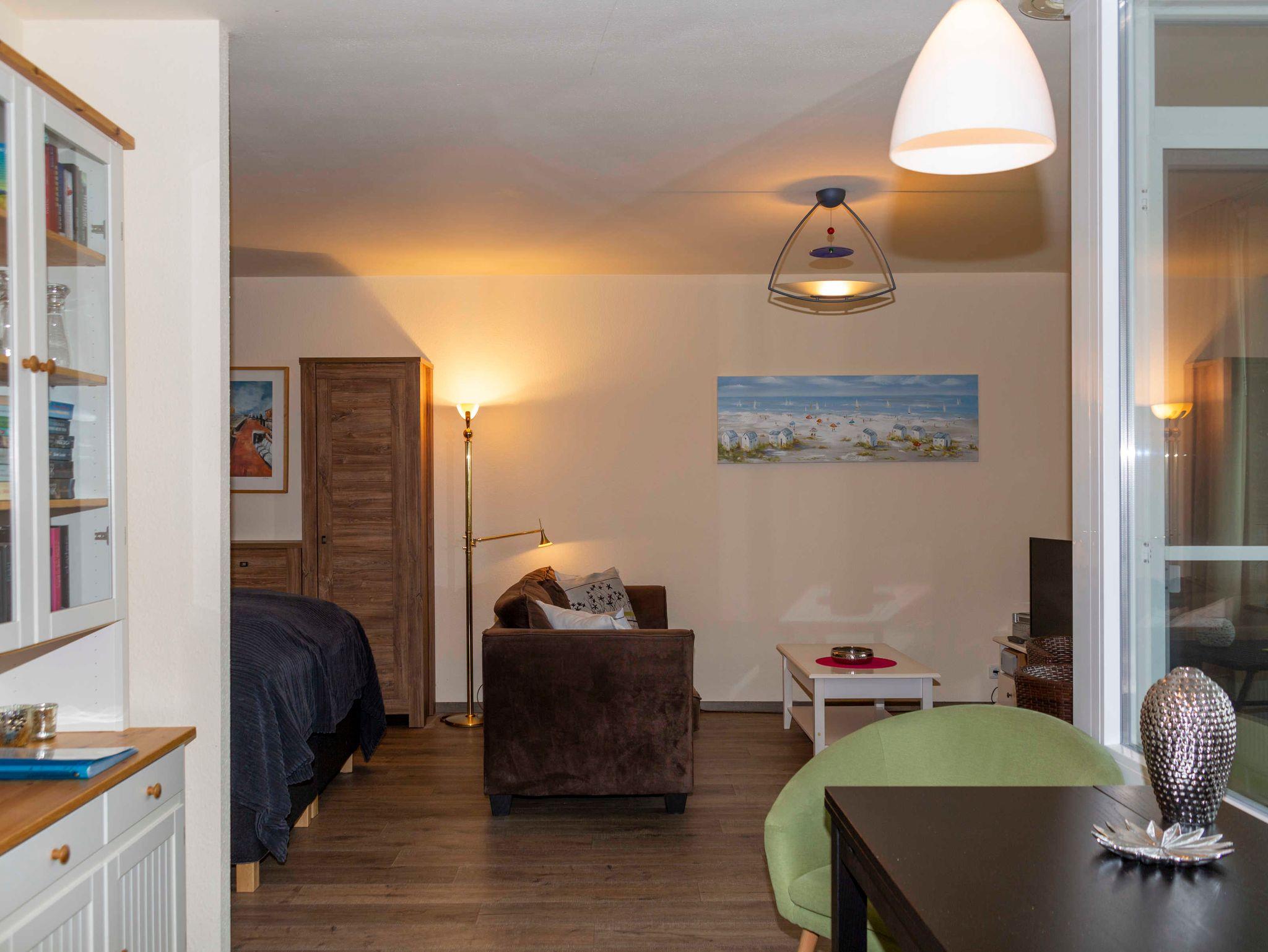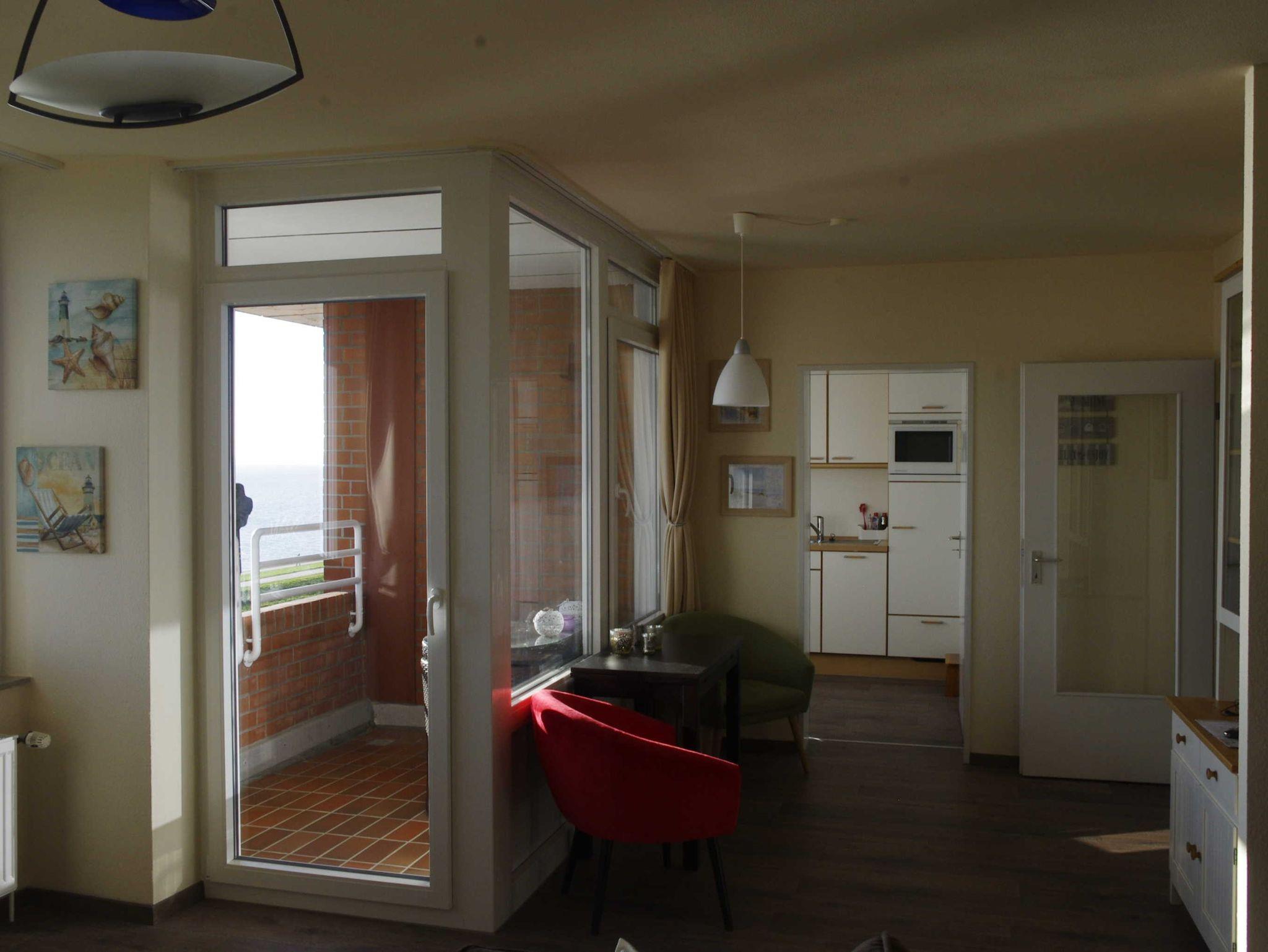 Der in hellen und warmen Farben gestaltete Wohn-/ Schlafraum lädt zum Wohlfühlen ein. Der vorgelagerte und überdachte Balkon bringt einem die Nordsee noch näher, Meereserleben hautnah!