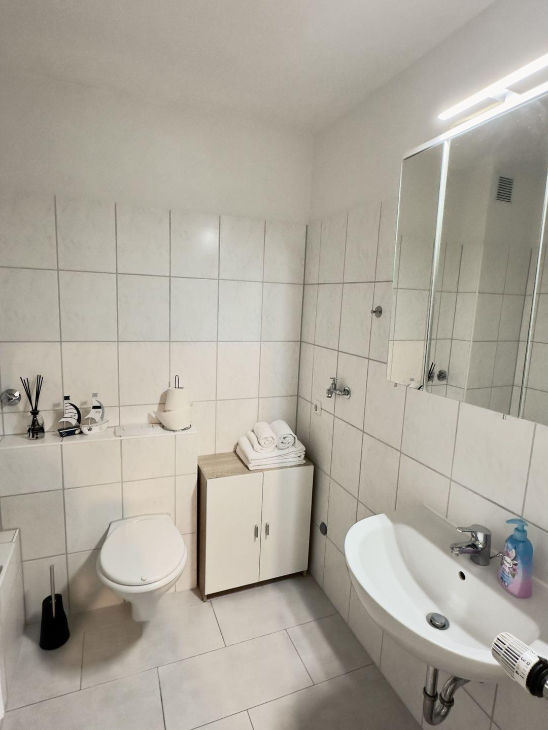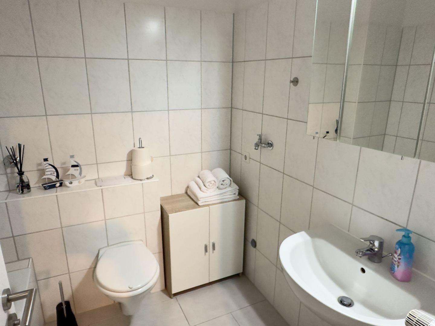 Das kleine, aber feine Badezimmer ist ein Highlight der Wohnung. An kalten, stürmischen Tagen an der Nordsee können Sie hier in der Badewanne entspannen und zur Ruhe kommen. Eine Glasabtrennung ermöglicht auch eine erfrischende Dusche. Ein Spiegelschrank bietet ausreichend Platz für Ihre Pflegeprodukte.