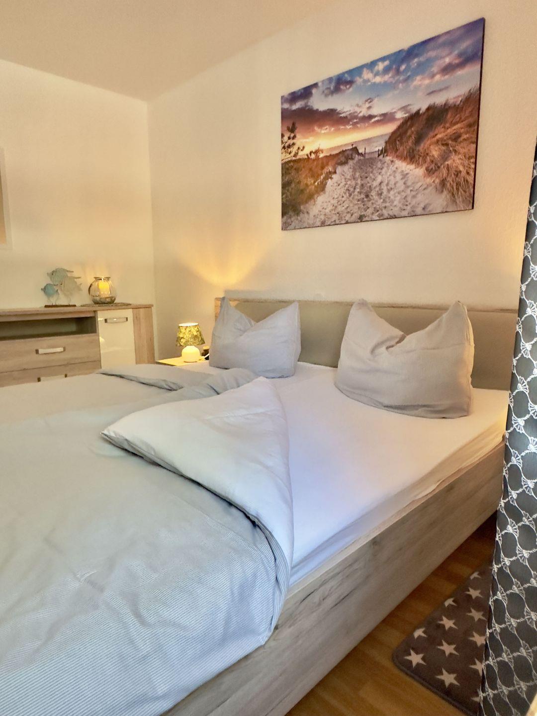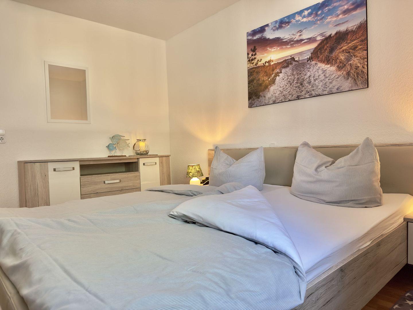 Im geräumigen Schlafzimmer sorgt ein gemütliches Doppelbett für erholsame Nächte, und der große Kleiderschrank bietet genügend Platz für Ihre Kleidung.