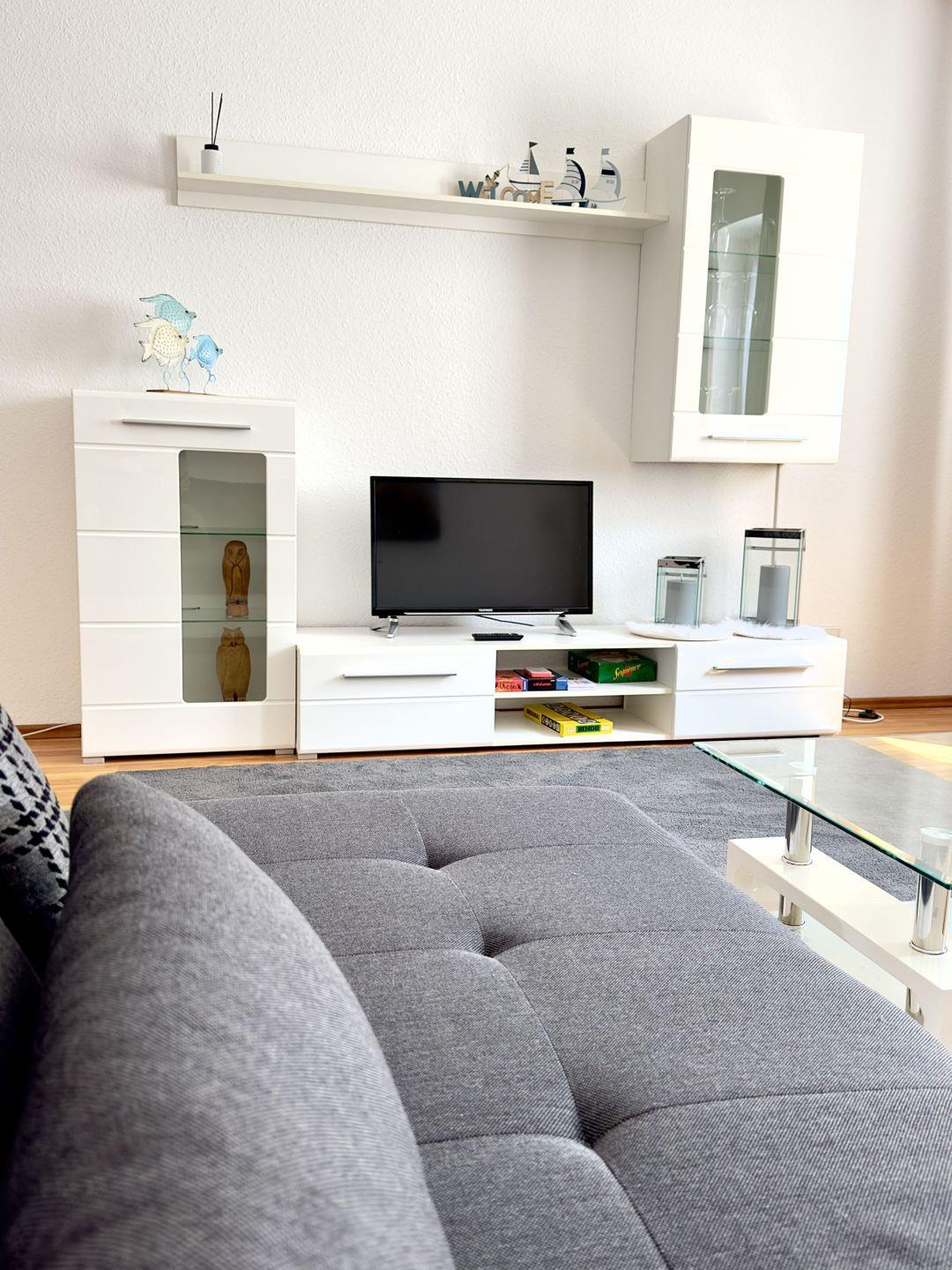 Das geräumige und helle Wohnzimmer ist mit einer komfortablen Sofalandschaft und modernen Möbeln ausgestattet, die Ihnen einen wunderbaren Ort der Entspannung und Erholung bieten. Das Sofa verfügt über eine Schlaffunktion und bietet so eine zusätzliche Schlafmöglichkeit.