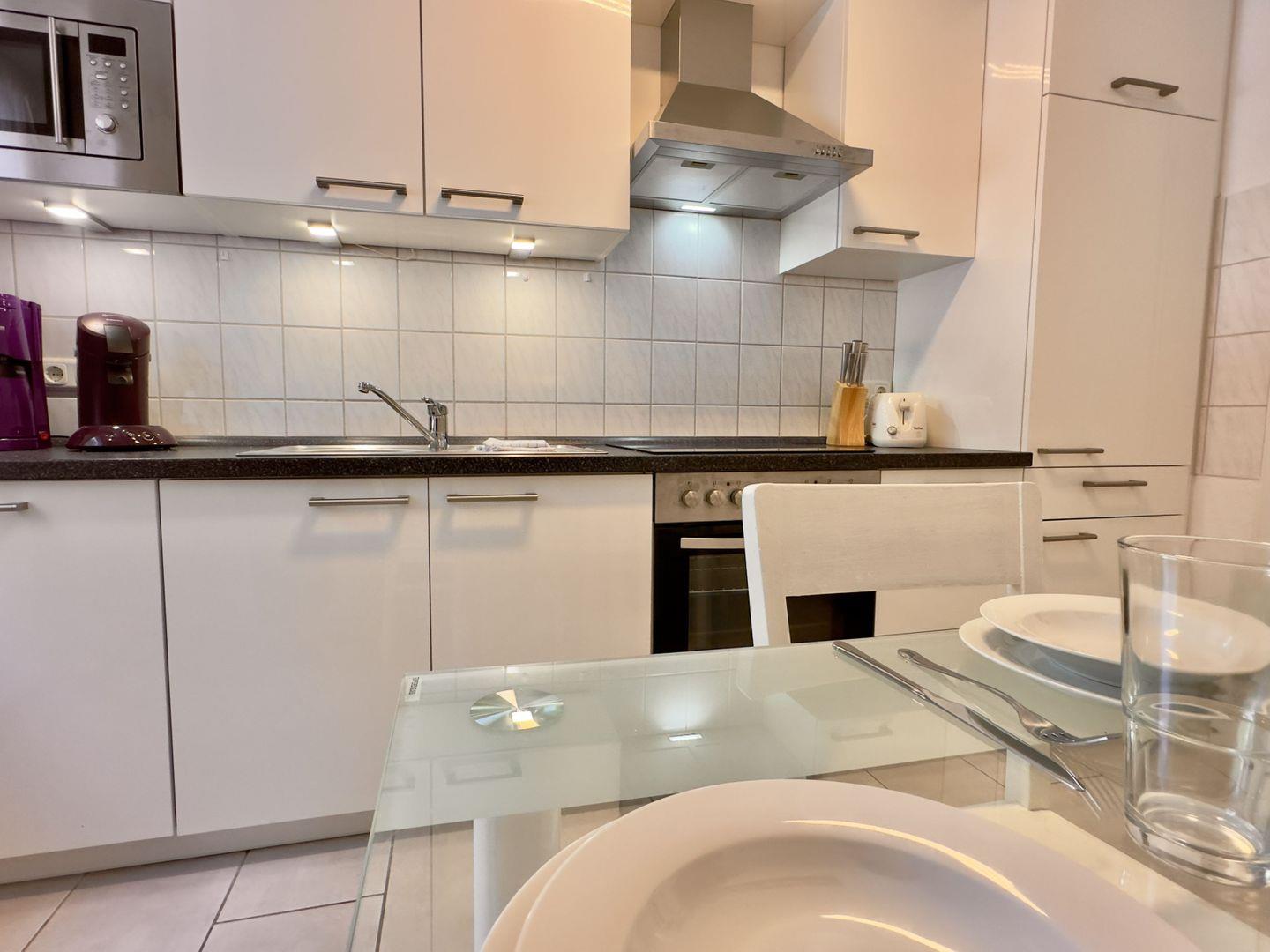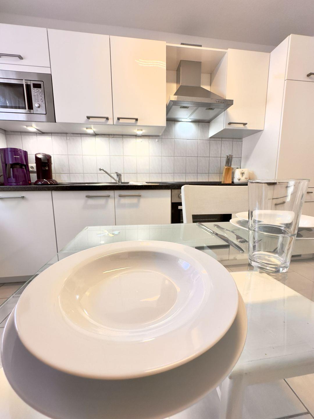 Von hier aus gelangen Sie in die moderne Küche, die perfekt für die Selbstversorgung ausgestattet ist. Eine gemütliche Essgruppe lädt zu gemeinsamen Mahlzeiten ein und schafft eine einladende Atmosphäre.