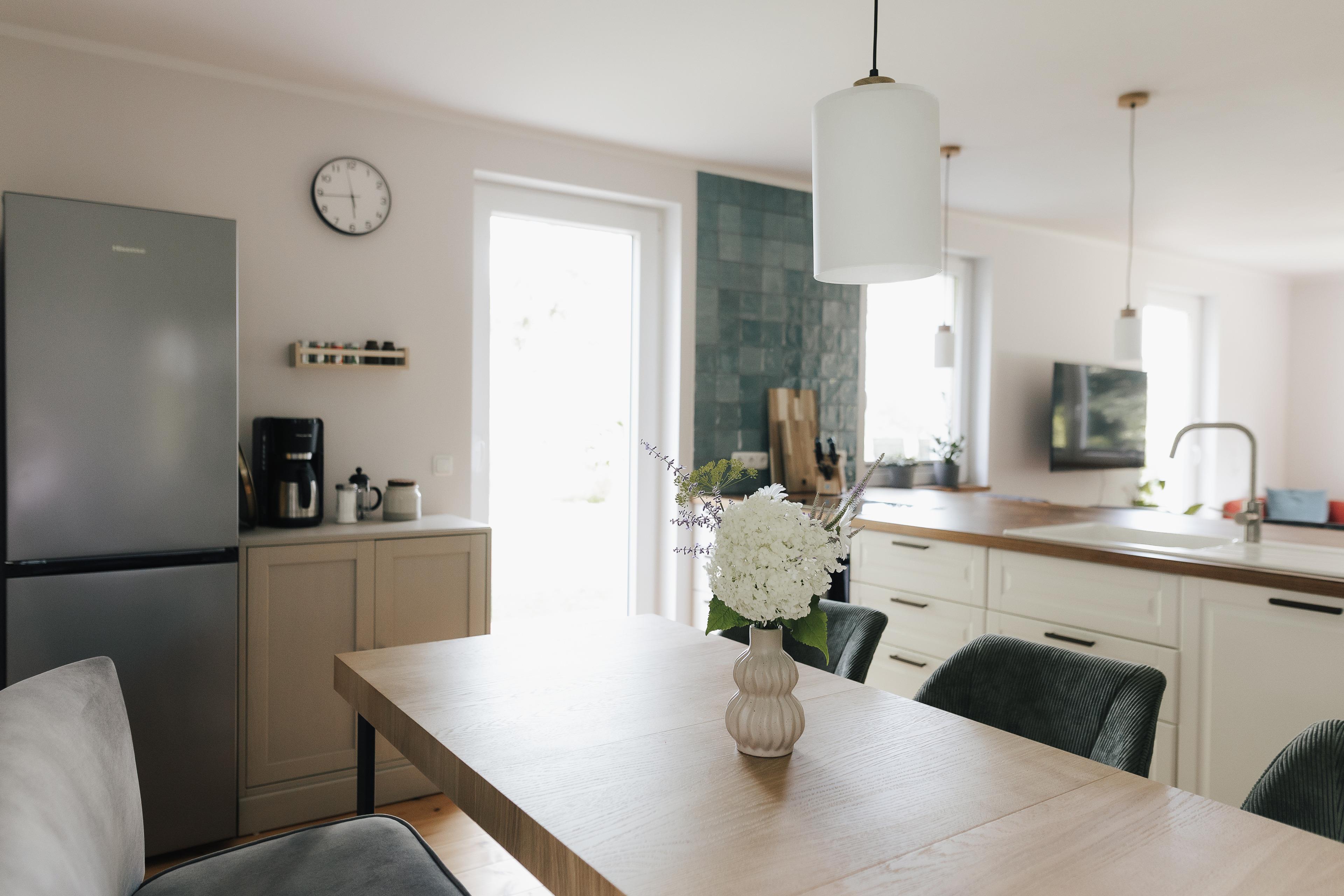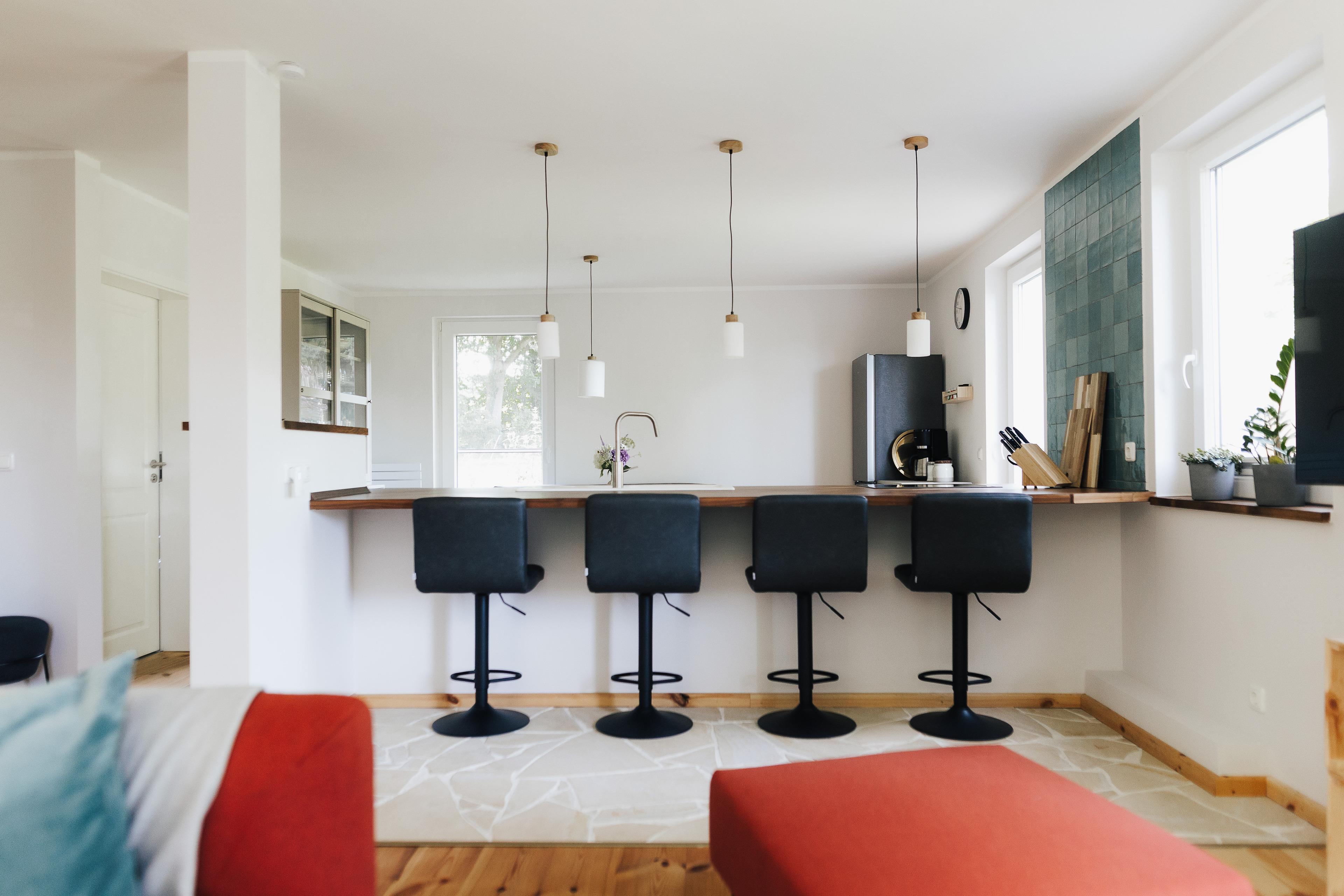 Die moderne und offene Küche ist der Mittelpinkt des Ferienhauses. Sie ist komplett und mit hochwertigen Materialien ausgestattet und bietet alles, was Du für Deine Urlaubsküche benötigst. Die Küche ist das Herzstück zwischen dem Essbereich auf der einen und dem Wohnbereich auf der anderen Seite. Auf der Wohnbereichsseite können 4 Gäste gemütlich am Tresen sitzen und sich mit den Kochenden unterhalten.