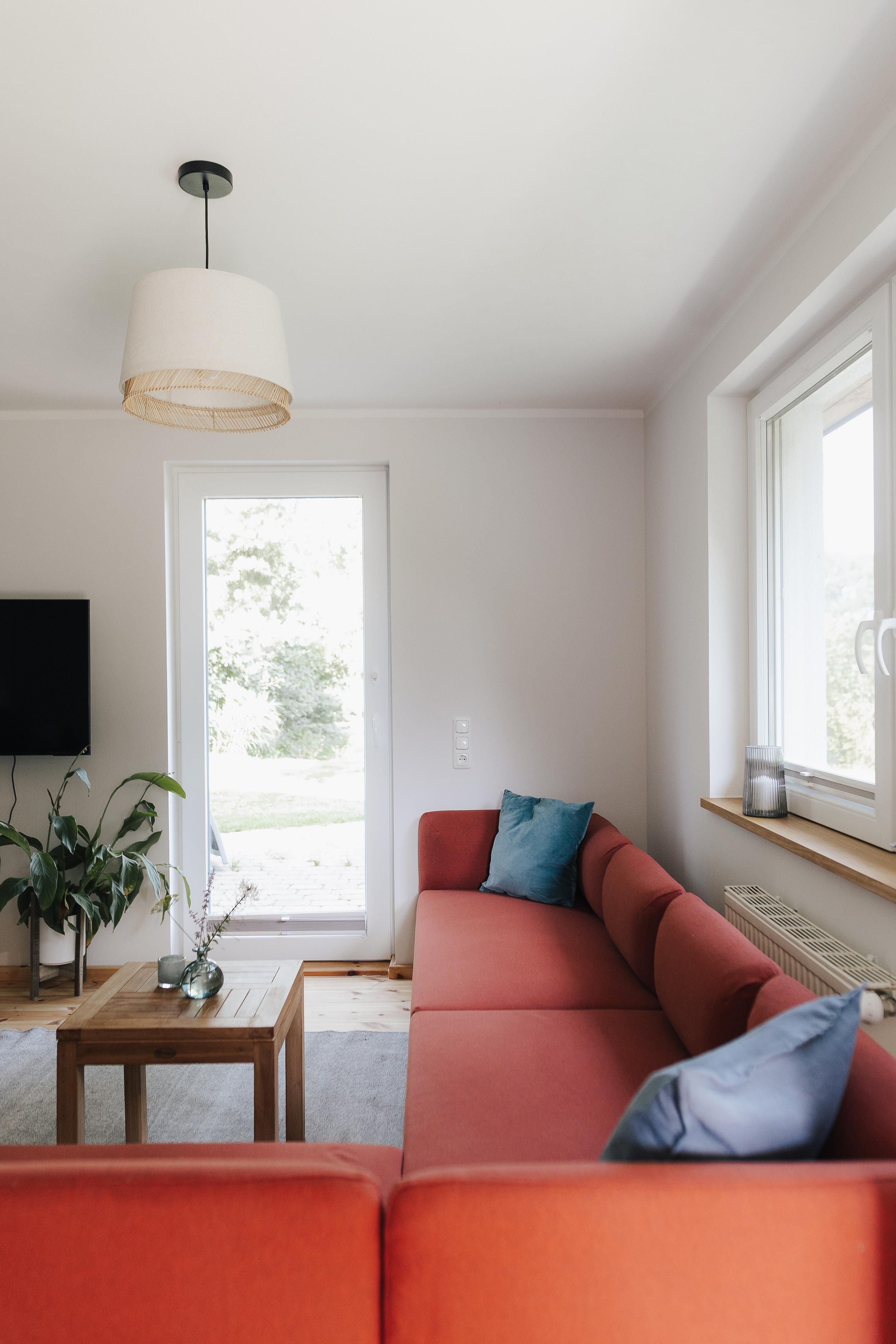 Der helle Wohn- und Essbereich unserer Blauen Hytte ist komfortabel und geschmackvoll ausgestattet. Durch die vielen Fenster in den großen Garten, hast du einen einmaligen Blick in die unverbaute Natur und über die Felder und vielleicht siehst du sogar ein Reh.