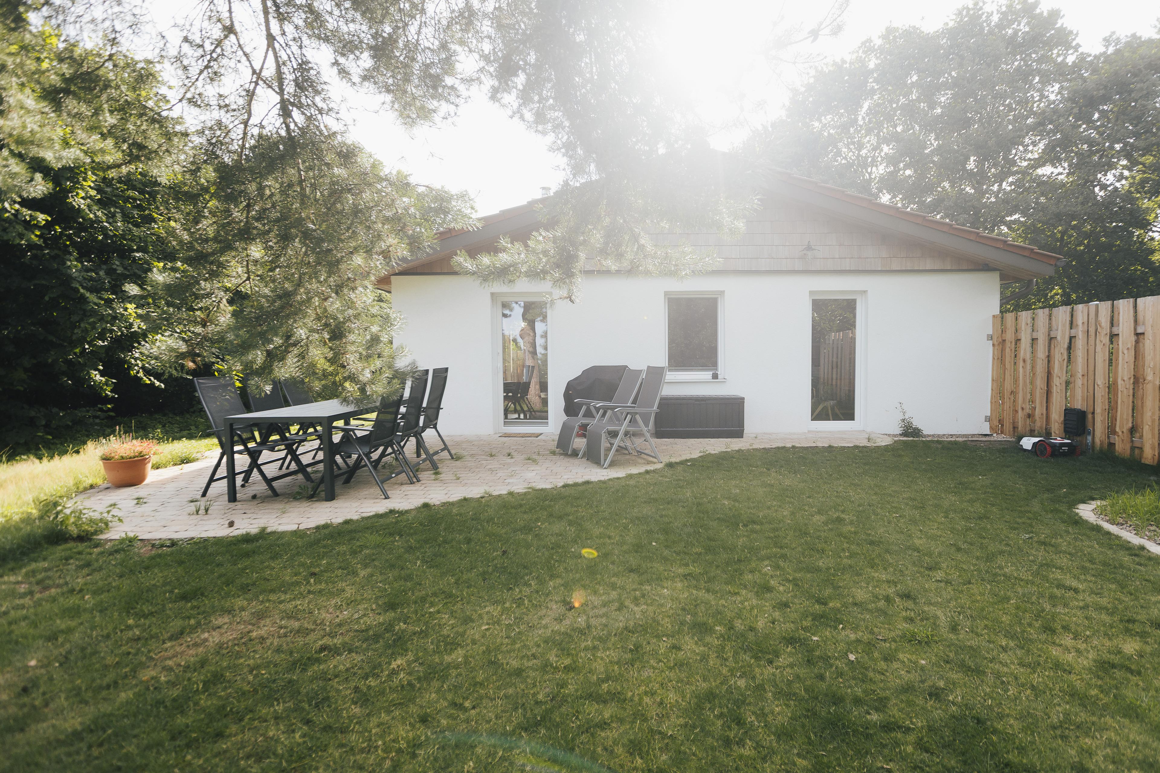 Das Ferienhaus verfügt über eine großzügige Sonnenterrasse (25qm) gen Osten mit Sitzmöglichkeiten und Gartenmöbeln. Ideal für das Ausklingen nach erlebnisreichen Ausflügen, für den Grillabend und eine unvergessliche gemeinsame Zeit. Hinter dem Haus habt Ihr einen unverbauten Blick in die Natur und komplette Privatsphäre, da der Außenbereich nicht direkt einsehbar ist.