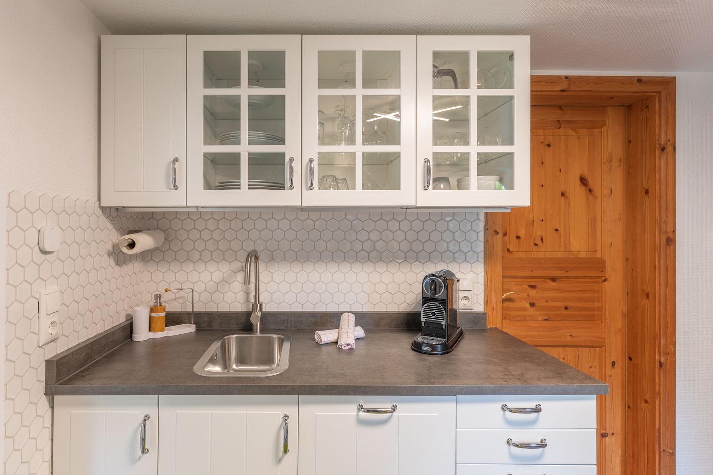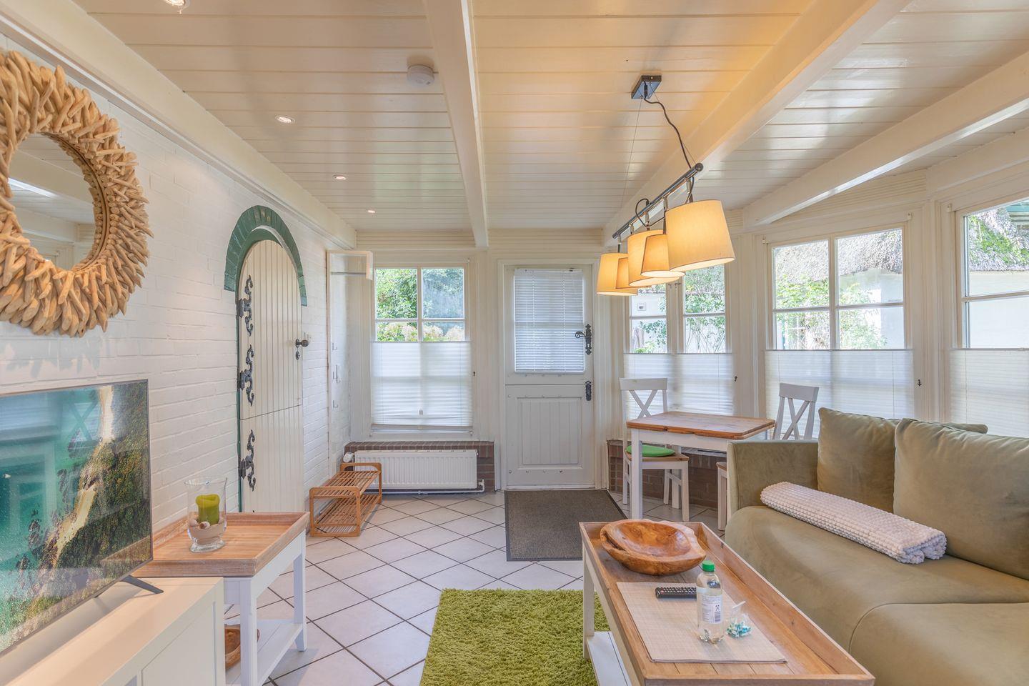 Das Apartment für 2 Personen erstreckt sich über 2 Etagen: im großen Wohnbereich im hellen Wintergarten finden Sie eine gemütliche Sitzecke mit Sofa, Sessel und großem Flachbildschirm. Die separate Küche ist mit einem Herd mit Backofen, einer Mikrowelle, Nespressomaschine, Kaffeemaschine (Filtergröße 4) eingerichtet. Das Duschbad im Erdgeschoss rundet das Bild ab.