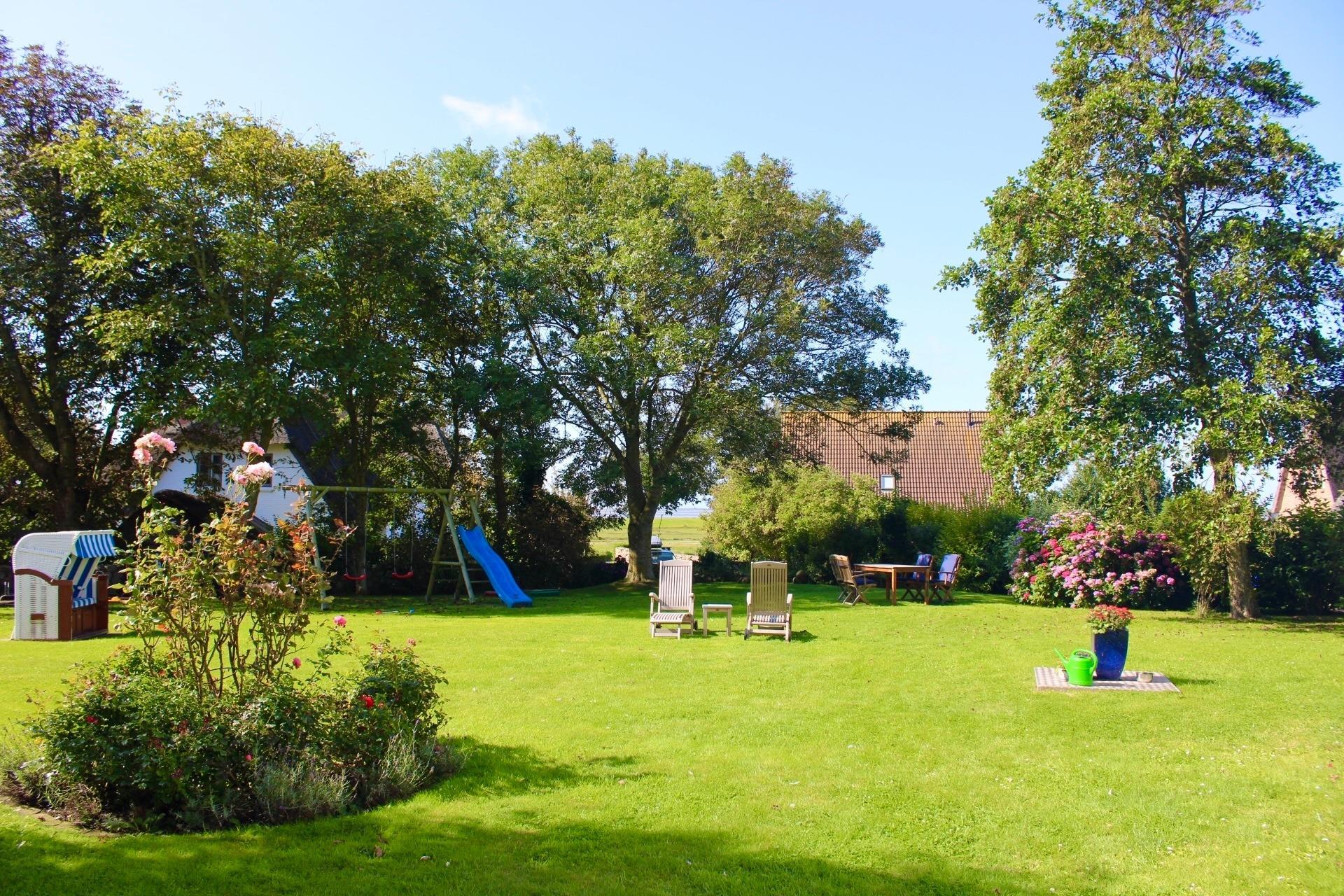 Das Haus umgibt ein großzügiger Gemeinschaftsgarten mit Sitzgelegenheit. Hier sind Sie der Natur ganz nah. Auch Rehe und Fasane sind manchmal aus dem Fenster zu beobachten. Traumhaft ist natürlich der Blick über das Föhrer Naturschutzgebiet auf die Nordsee und zur Insel Amrum.