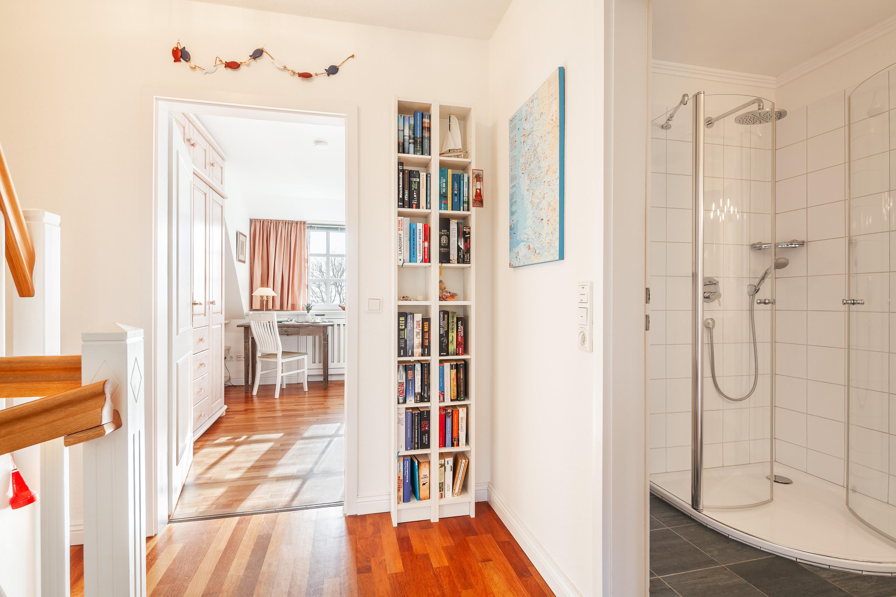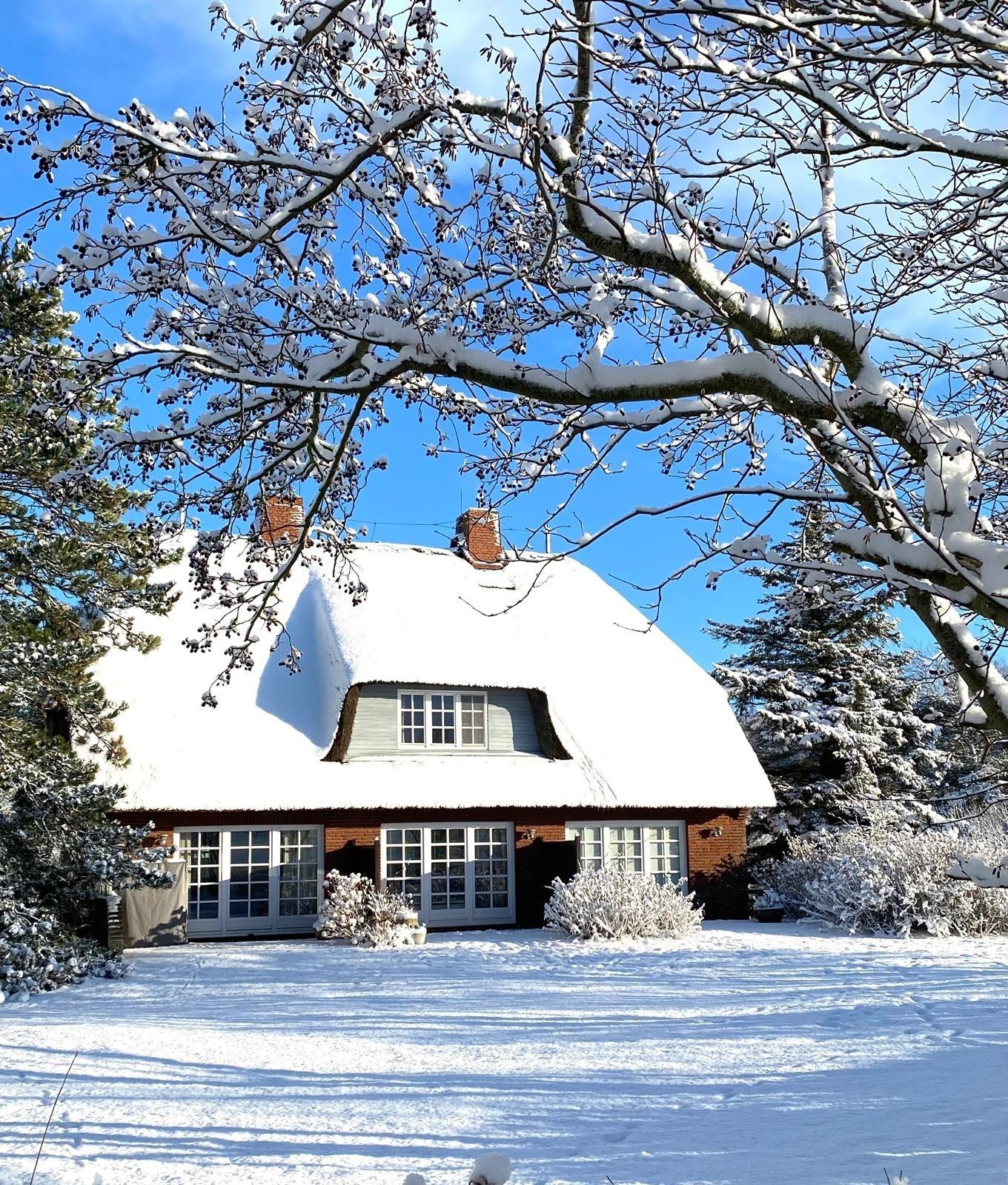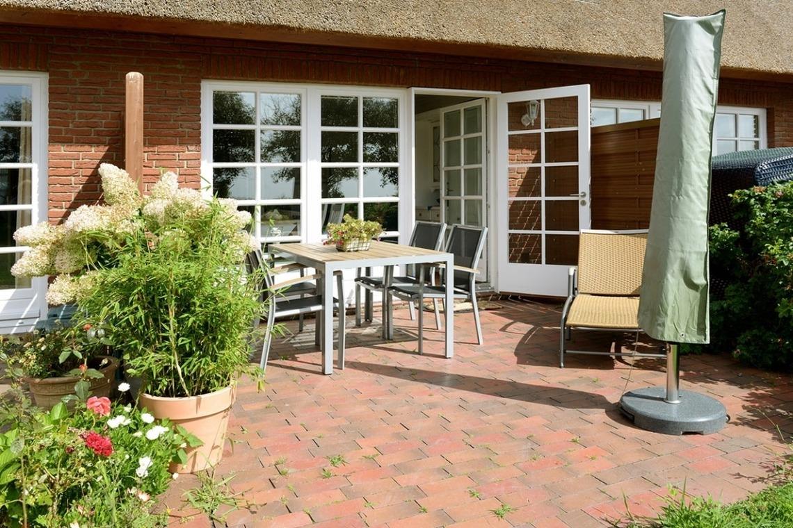Der Keller des Hauses bietet reichlich Abstellmöglichkeiten. Außerdem steht hier den Gästen eine Waschmaschine[nbsp] zur Verfügung. Vom Esstisch über die Südterrasse können Sie direkt in den weitläufigen Garten blicken und weiter über die Godelniederung bis zum Meer und nach Amrum.