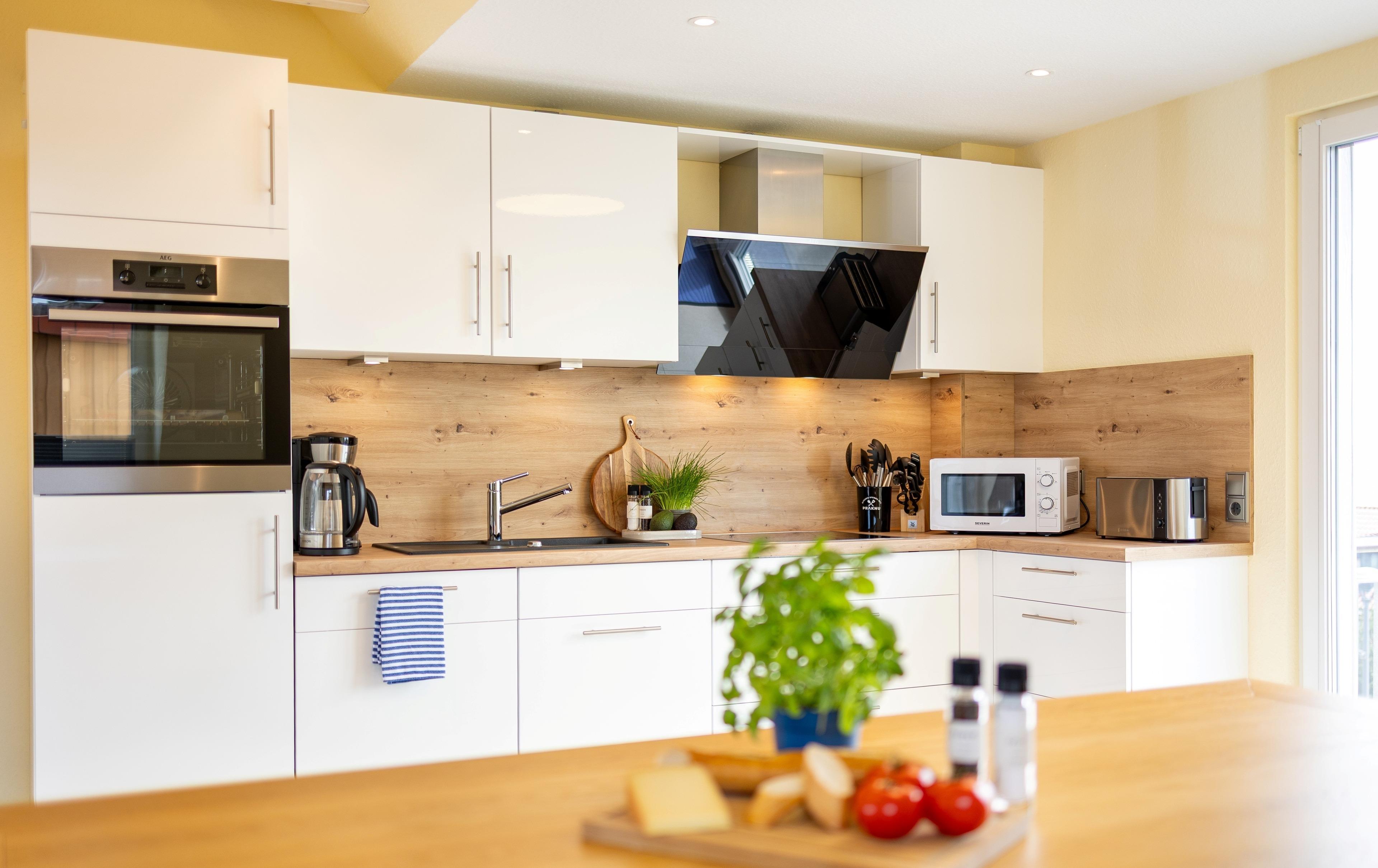 Die moderene Küche bietet genug Platz zum entspannten Kochen und zusätzlich den Zugang zum zweiten Balkon, der einen herrlichen Blick auf Amrums traumhaftes Naturschutzgebiet am Kniephaken bereithält.