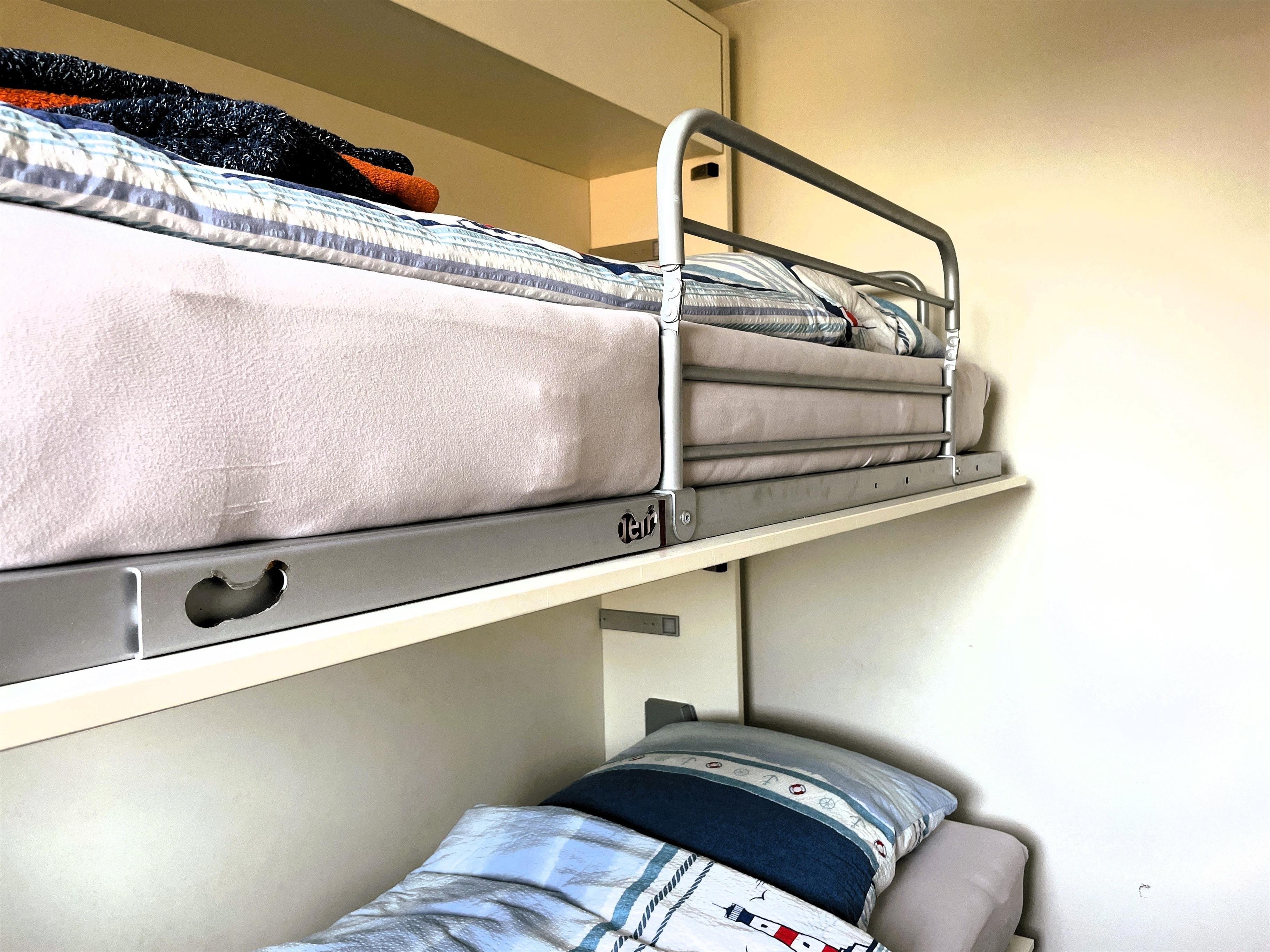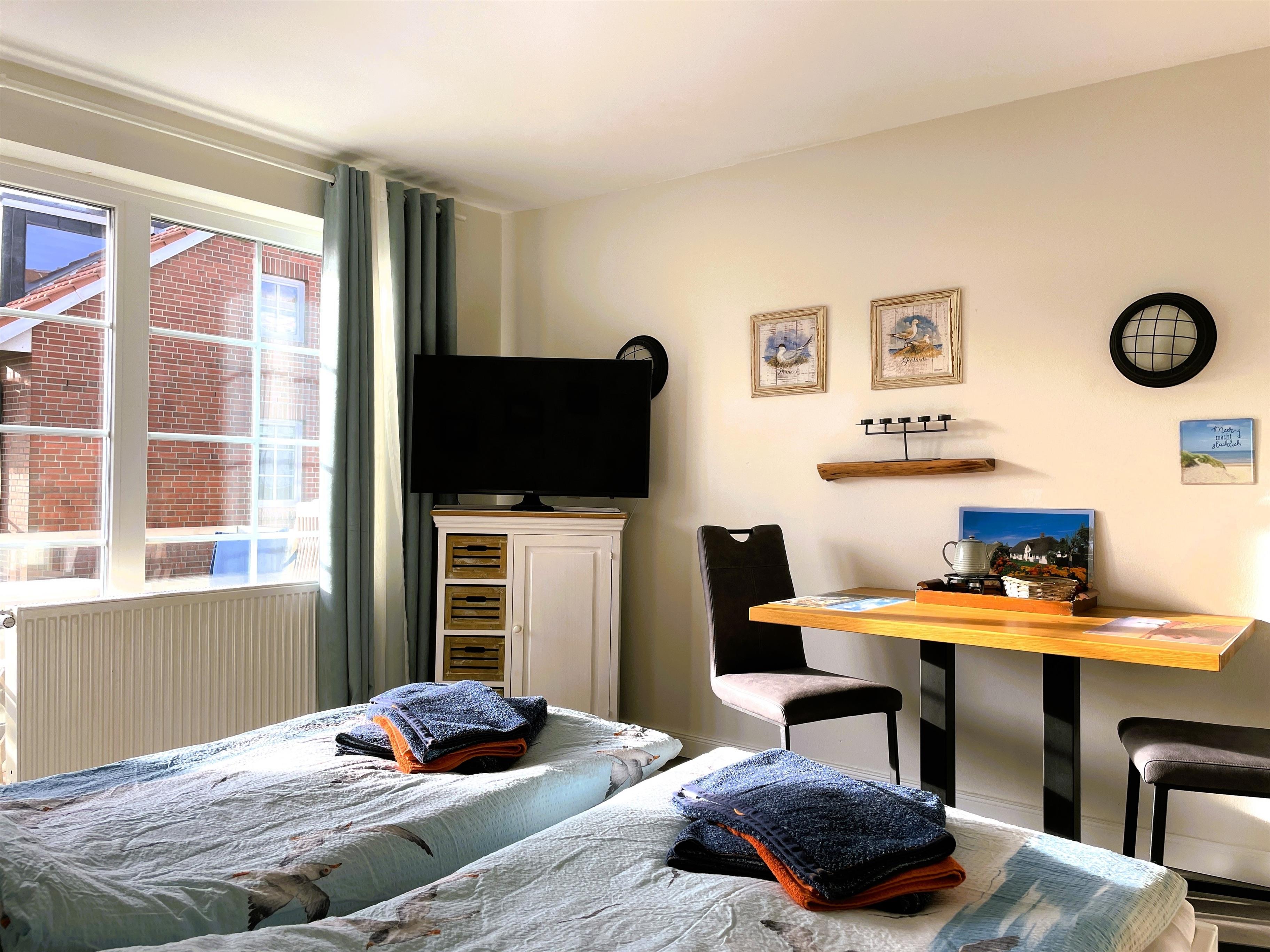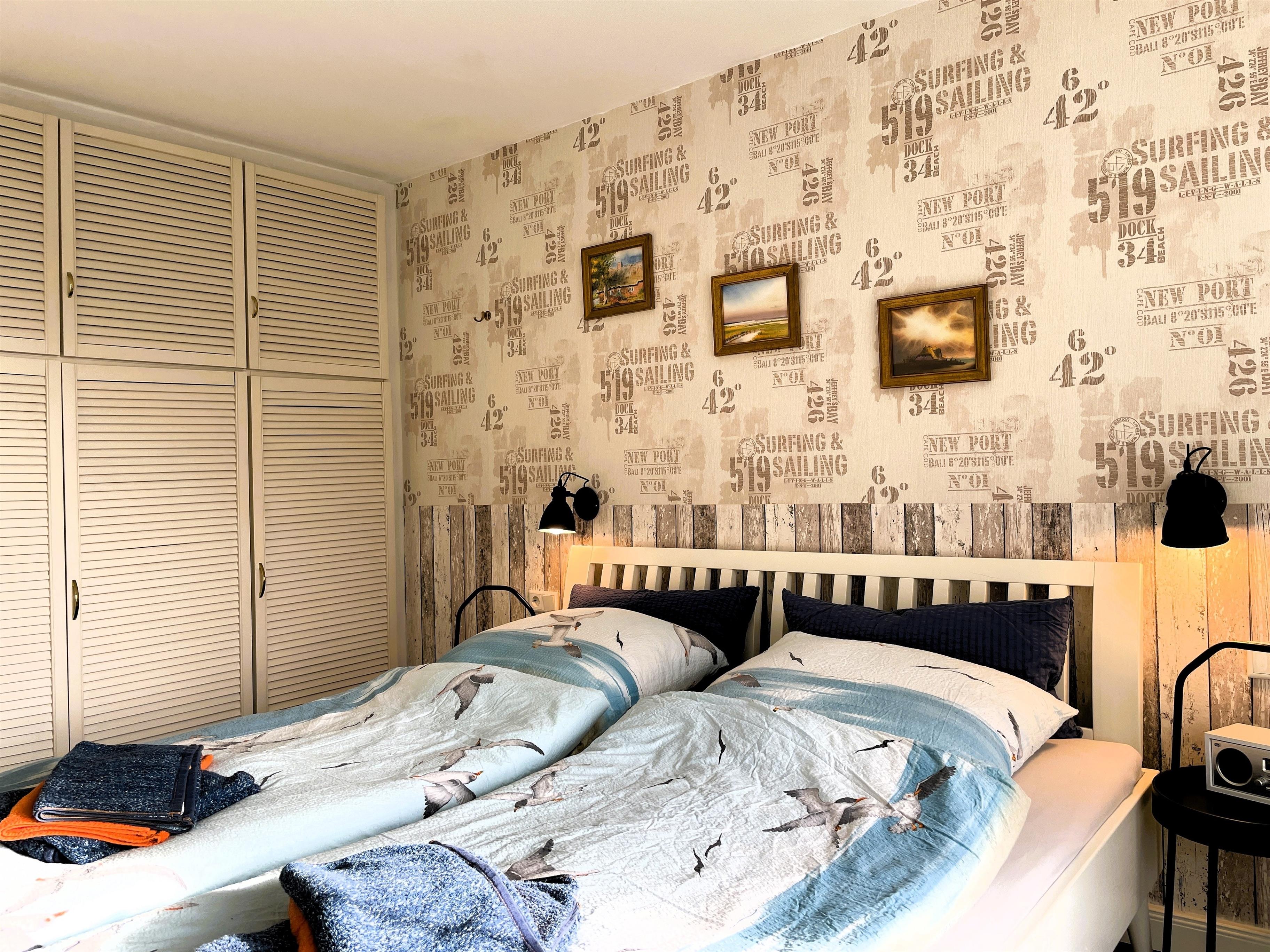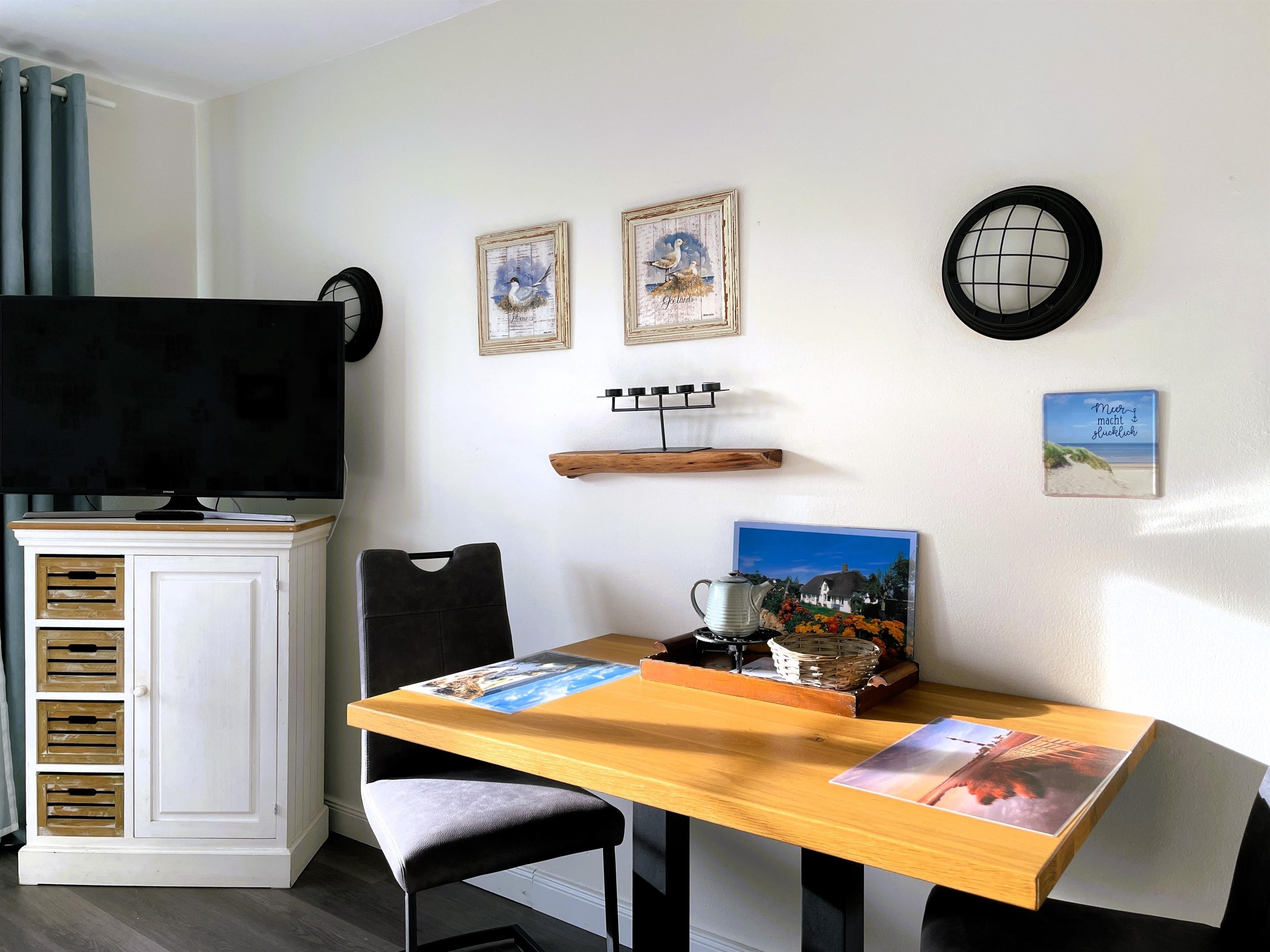 Willkommen in der charmanten Ferienwohnung Huus Waterkant 04. Diese kompakte, aber durchdachte Wohnung bietet alles, was Sie für einen erholsamen Aufenthalt benötigen. Das Herzstück der Wohnung ist das kombinierte Wohn- und Schlafzimmer. Hier finden Sie ein komfortables Doppelbett für zwei Personen, einen geräumigen Schrank für Ihre Kleidung sowie eine praktische Küchenzeile. Ein Esstisch mit Stühlen lädt zum gemeinsamen Essen oder gemütlichen Beisammensein ein. Für zusätzliche Schlafmöglichkeiten sorgt ein separates Schlafzimmer mit einem Etagenbett, das auch für Erwachsene geeignet ist - ideal für Familien oder kleine Gruppen. Das helle Badezimmer, ausgestattet mit Dusche und WC, grenzt an den Eingangsbereich und verfügt über ein Fenster für natürliche Belüftung. Ein besonderes Highlight der Wohnung ist der Balkon, der vom Wohn-/Schlafzimmer aus zugänglich ist. Hier können Sie auf den bereitgestellten Sitzgelegenheiten entspannen und Relaxen. Die Südwest-Ausrichtung verspricht sonnige Stunden und schöne Abende.