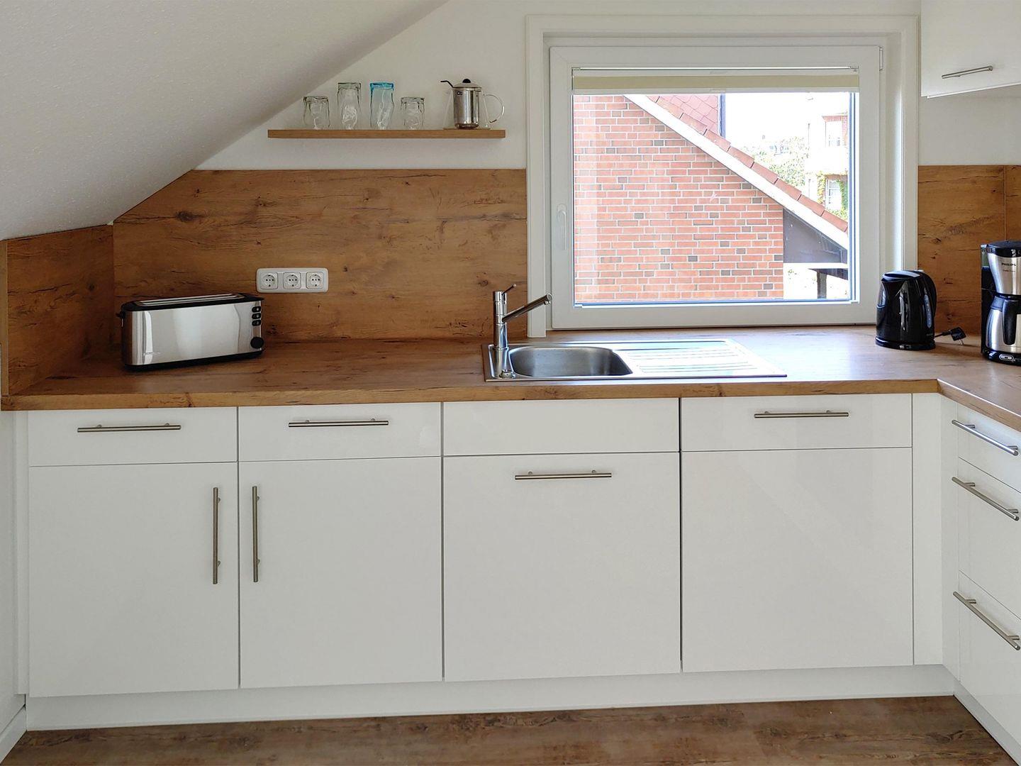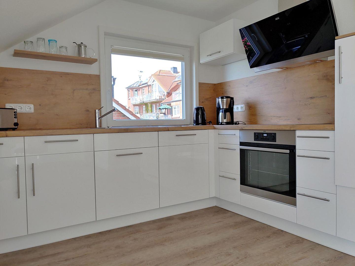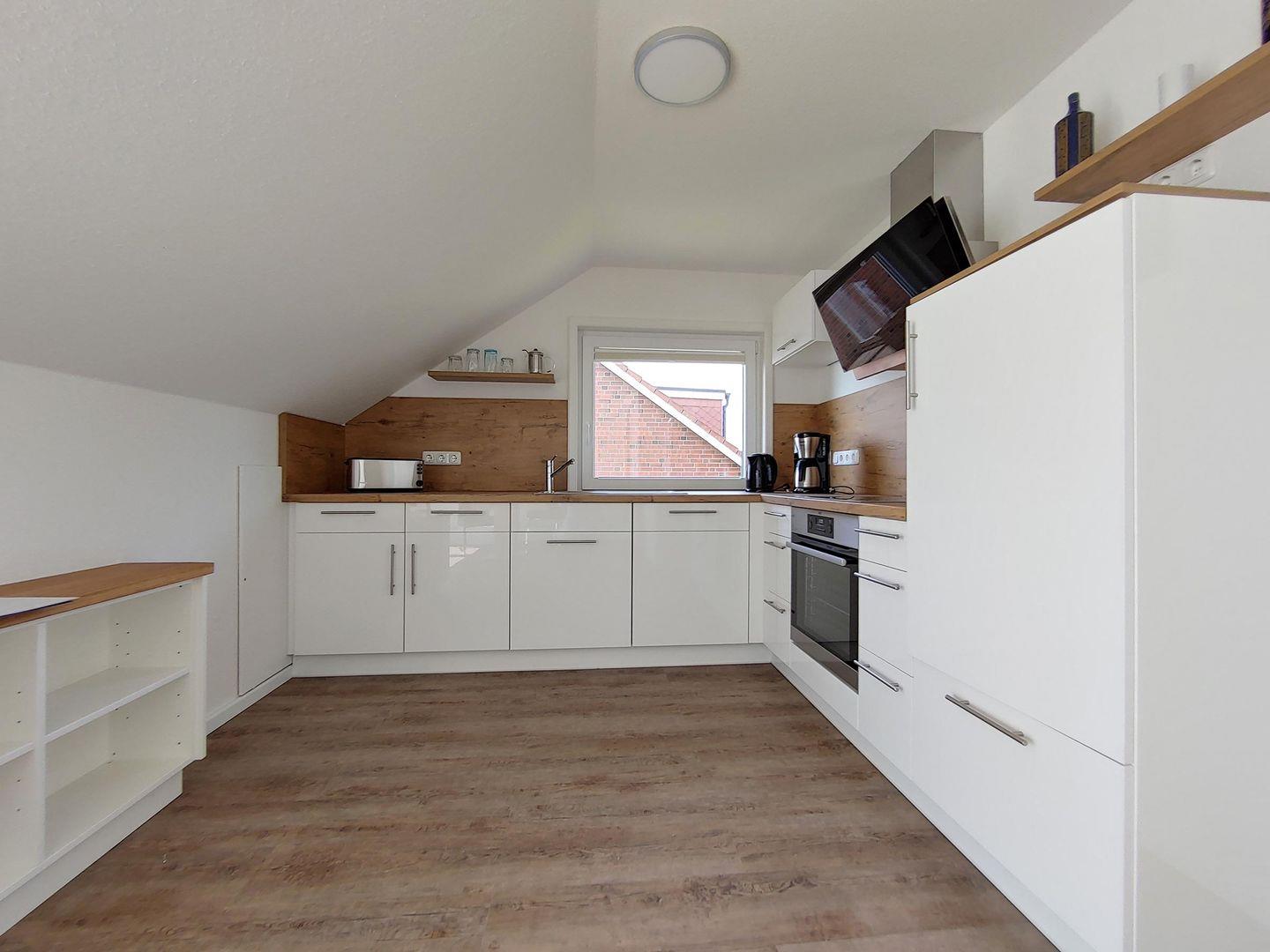 Die Wohnung verfügt über 1 Wohnraum mit Meerblick, 1 Zweisitzer-Couch, 1 Sessel, WLAN, Sat-TV und offener Küche, 1 Schlafzimmer, 1 Badezimmer mit Dusche und WC, Waschmaschine und Trockner zur Gemeinschaftsnutzung, Südbalkon mit Balkonmöbeln (April - Oktober), PKW-Stellplatz.