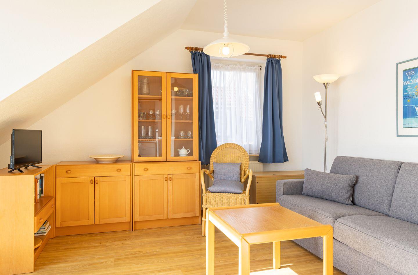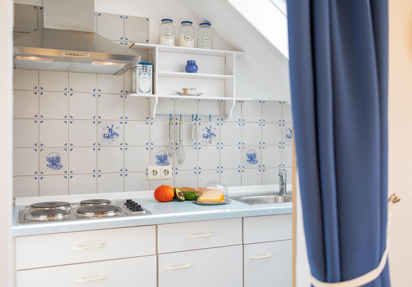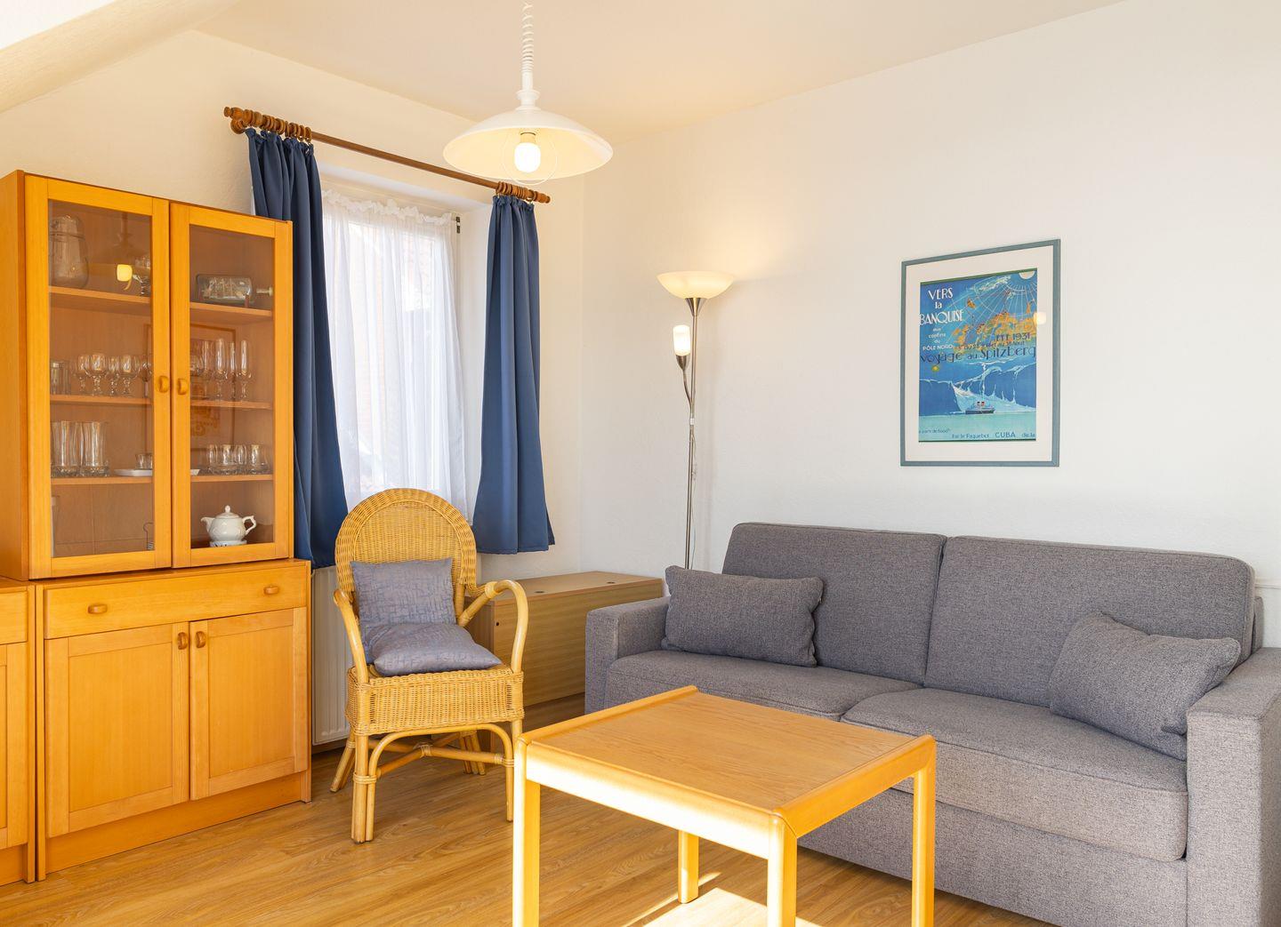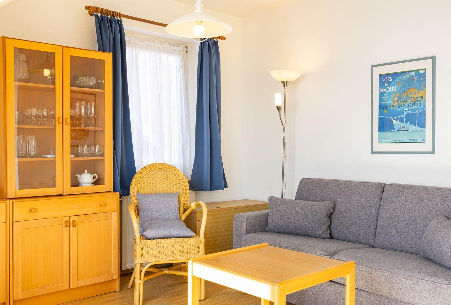 Die Wohnung Steuerbord ist gemütlich eingerichtet. Sie bietet ein geräumiges Schlafzimmer mit einem Einzelbett und einem Wohnzimmer mit einer Schlafcouch, von der aus Sie auf den Kniepsand schauen können. Mit dem zur Seeseite ausgerichteten Balkon haben Sie einen unvergleichlichen Blick auf den Kniephaken und somit auf die Vogelwelt Amrums. Die Küche ist optisch vom Wohnbereich getrennt und mit allen Utensilien ausgestattet.