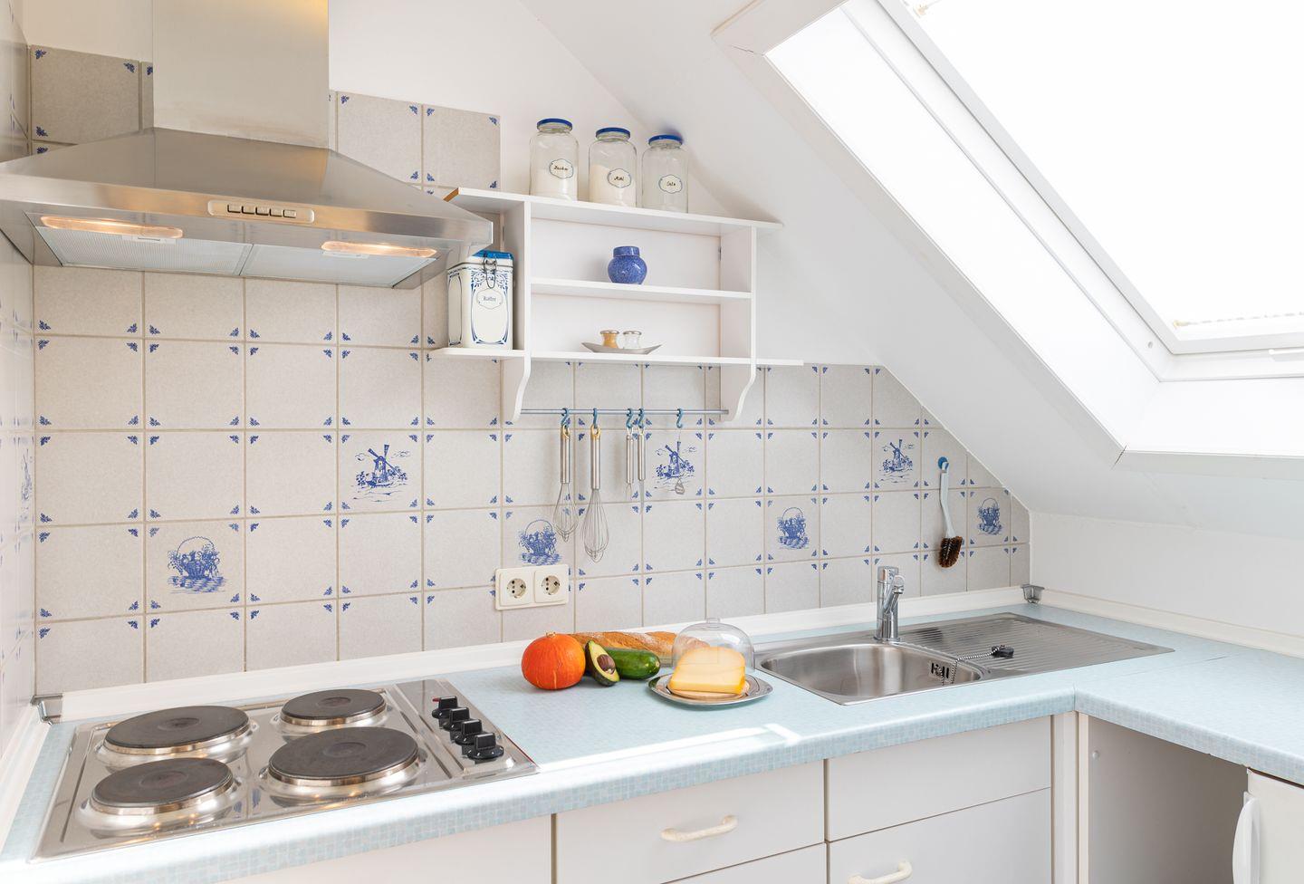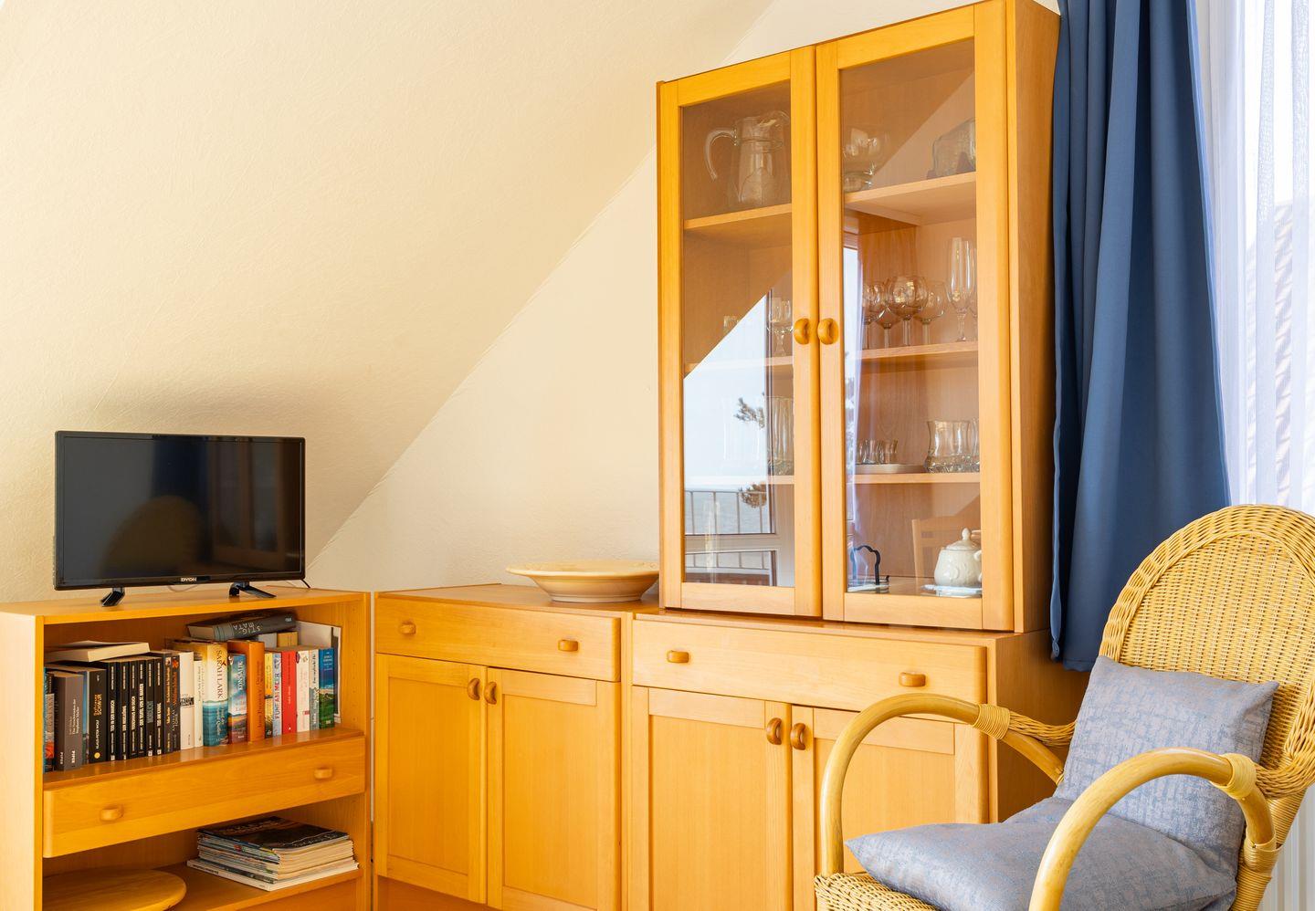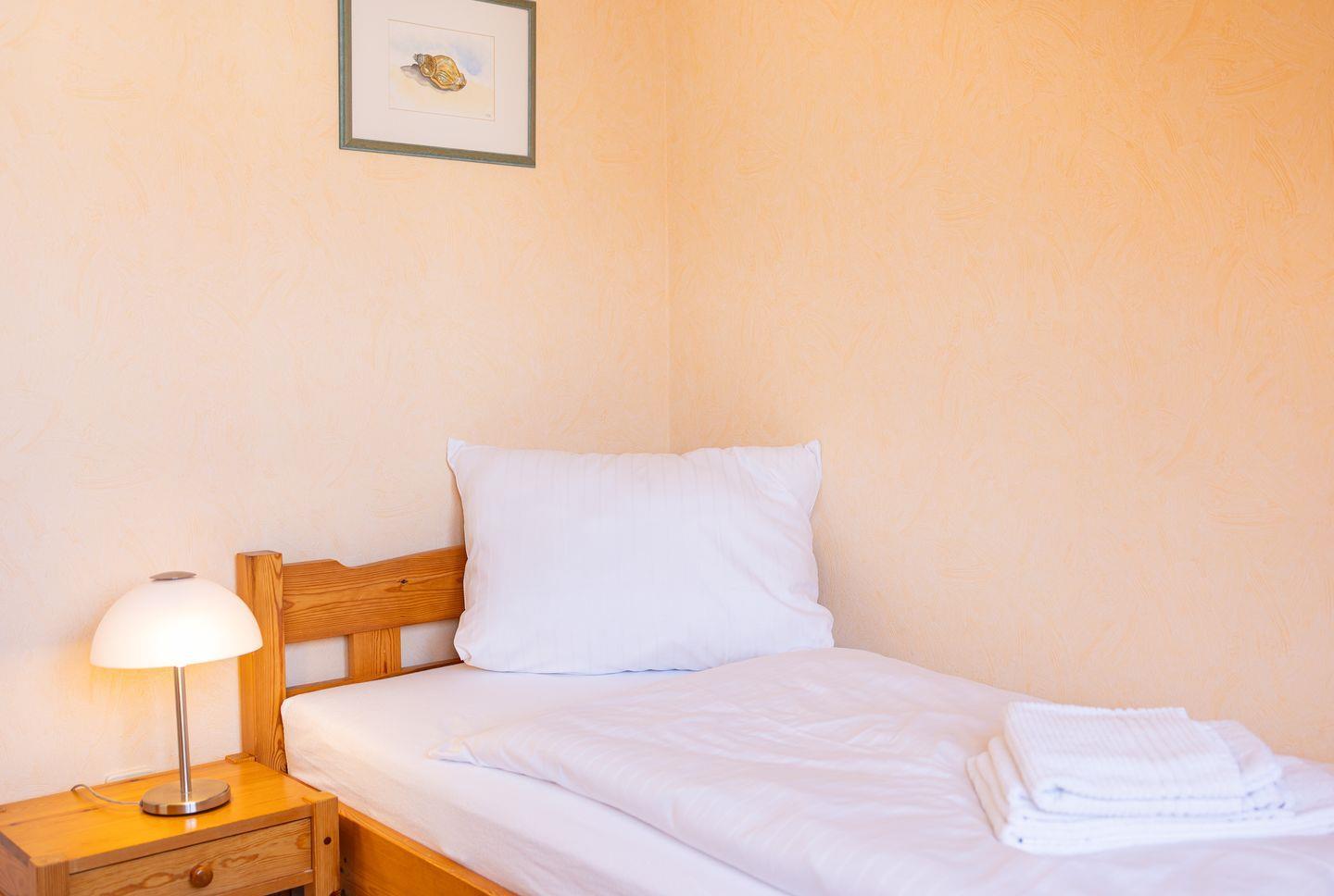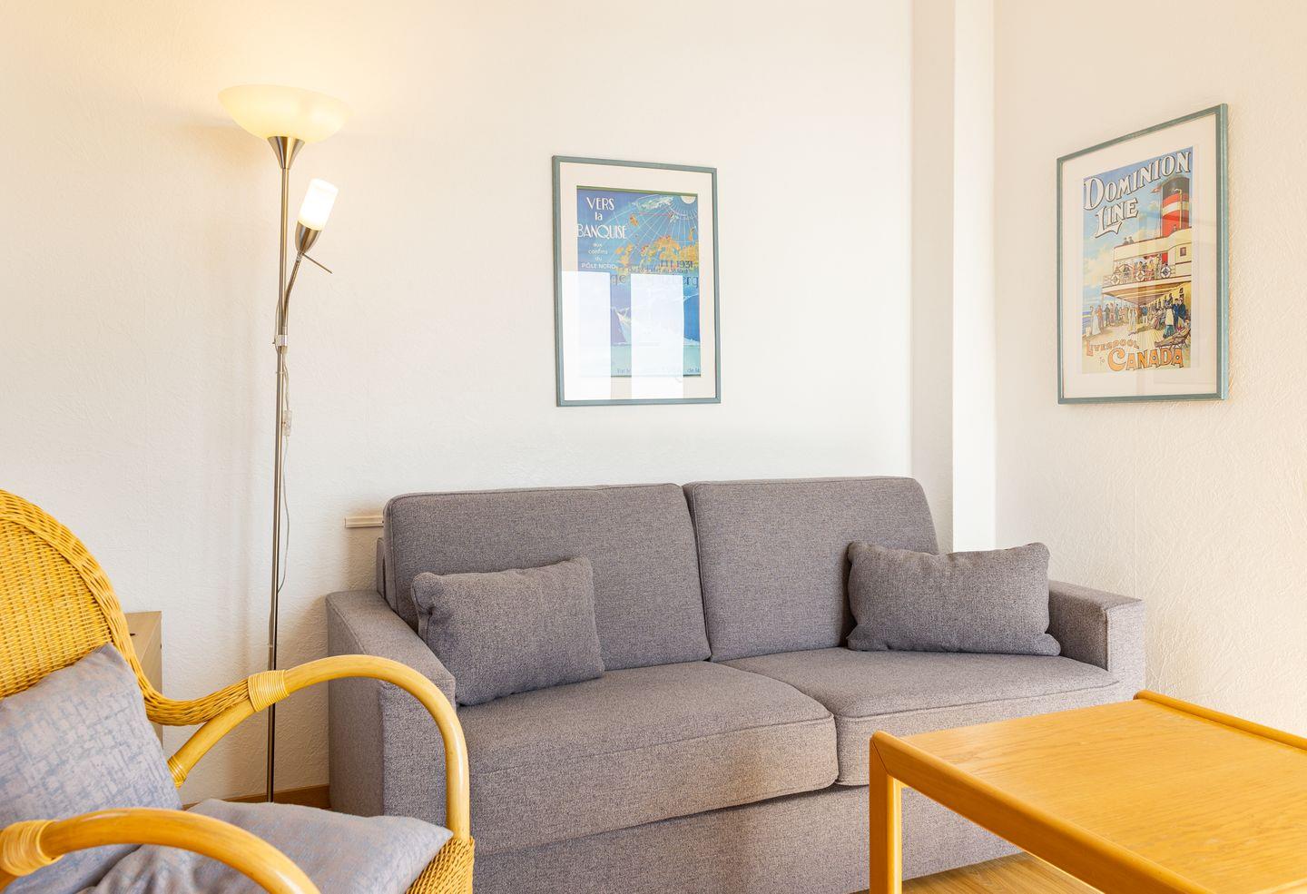 Die Wohnung Steuerbord ist gemütlich eingerichtet. Sie bietet ein geräumiges Schlafzimmer mit einem Einzelbett und einem Wohnzimmer mit einer Schlafcouch, von der aus Sie auf den Kniepsand schauen können. Mit dem zur Seeseite ausgerichteten Balkon haben Sie einen unvergleichlichen Blick auf den Kniephaken und somit auf die Vogelwelt Amrums. Die Küche ist optisch vom Wohnbereich getrennt und mit allen Utensilien ausgestattet.