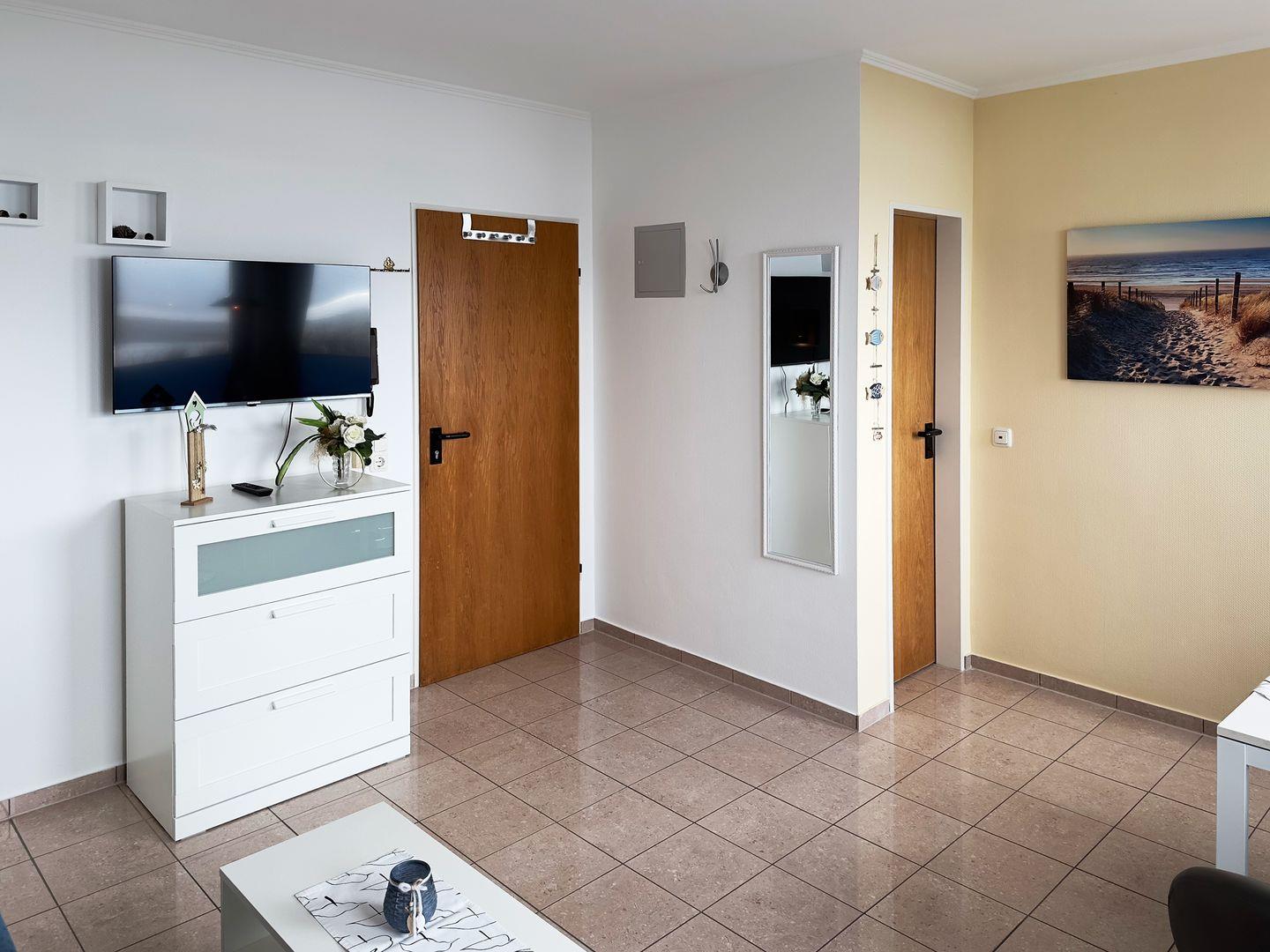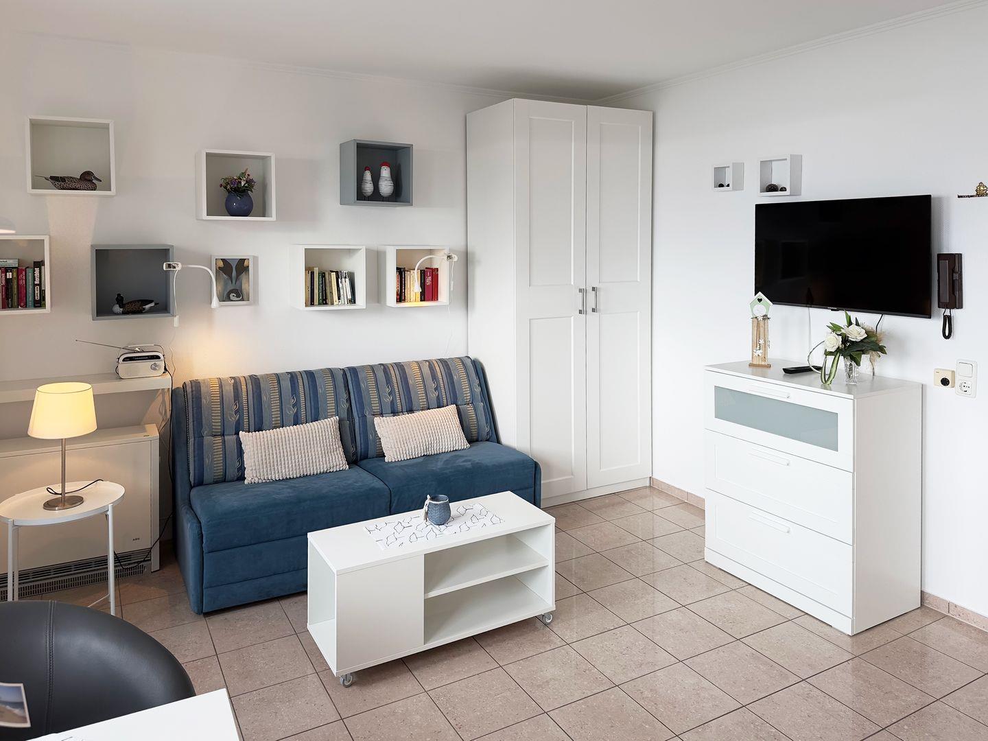 Die Wohnung verfügt über 1 Wohnraum mit Schlafcouch, WLAN, Sat-TV und offener Küche, 1 Badezimmer mit Dusche und WC; eine Süd-Terrasse mit Gartenmöbeln (April bis Oktober) und Meerblick, PKW-Stellplatz.