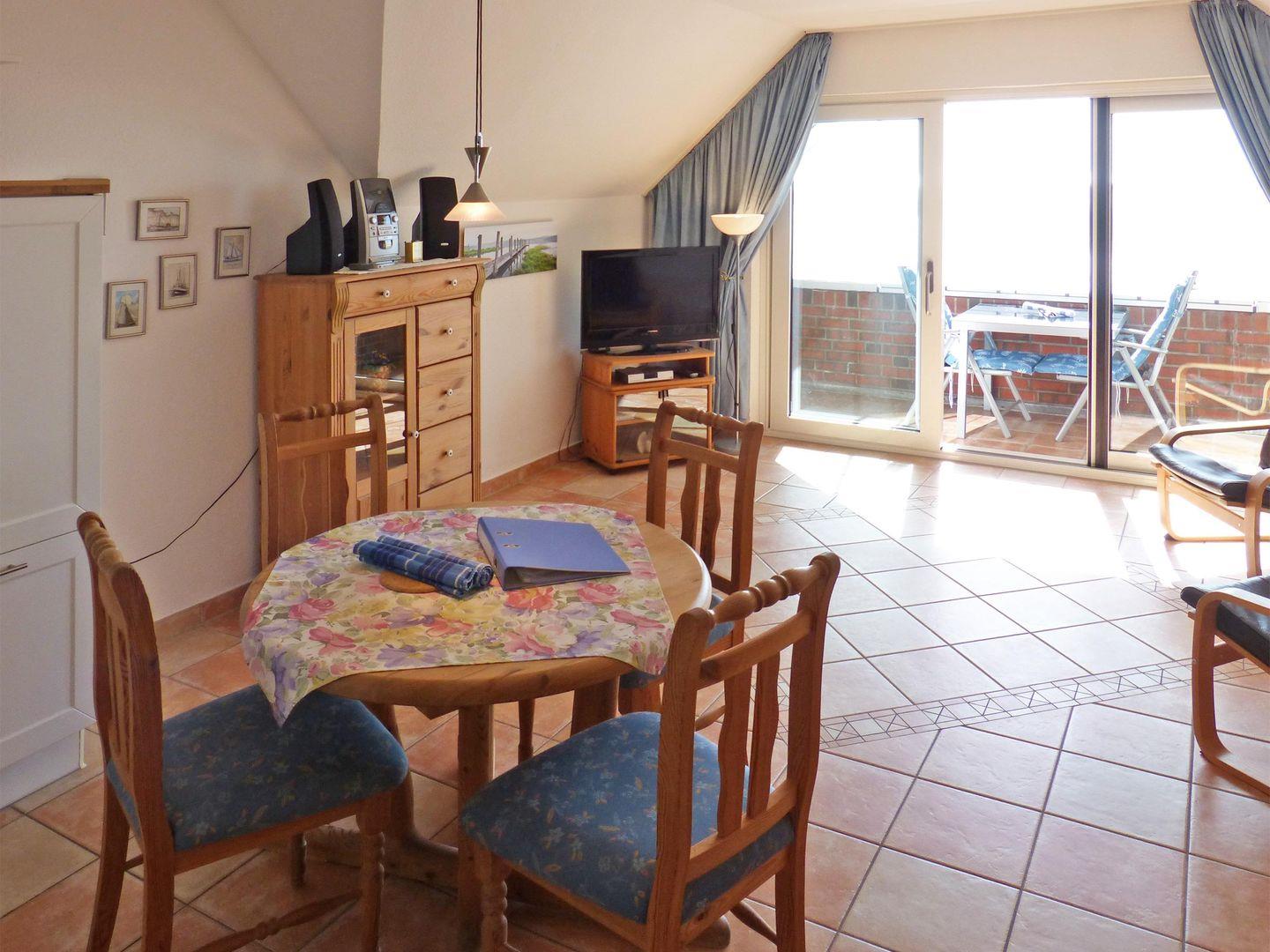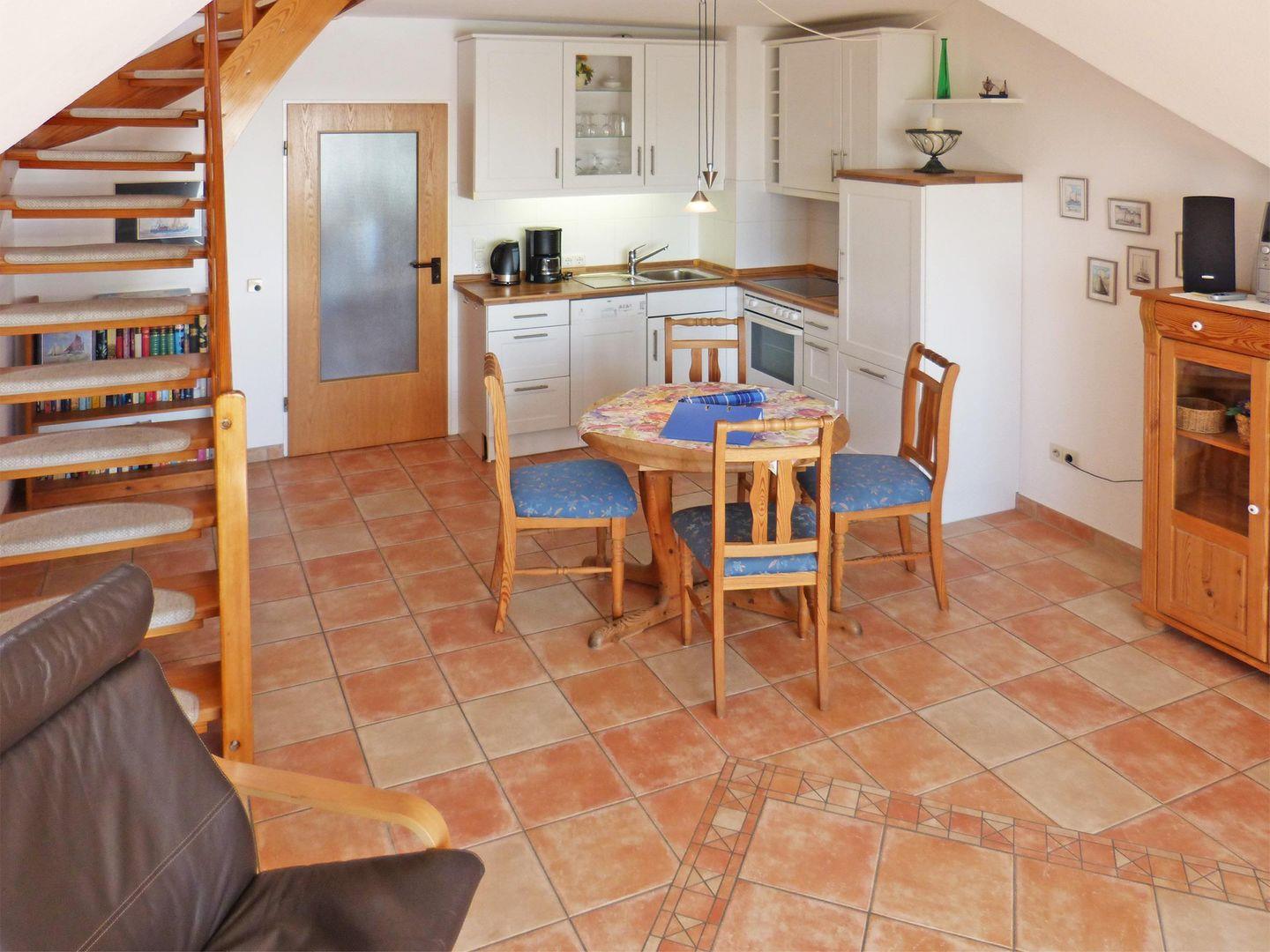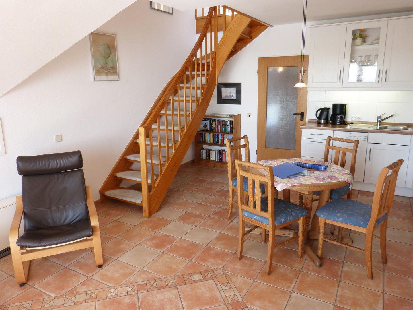Die Ferienwohnung „Obere Wandelbahn 15/8" im 2. Ober- und Dachgeschoss des Hauses „Obere Wandelbahn 15b" in Wittdün auf Amrum ist eine 2-Zimmer-Maisonette-Ferienwohnung (ca. 55 qm Grundfläche) mit Schlafmöglichkeiten für 1 bis 2 Personen.