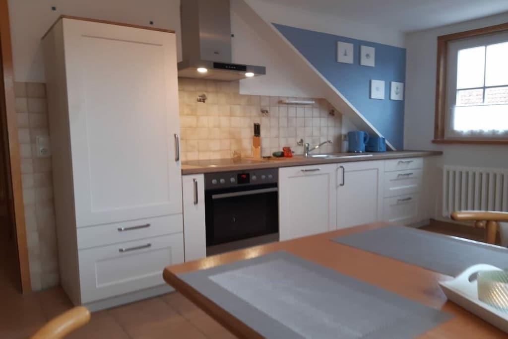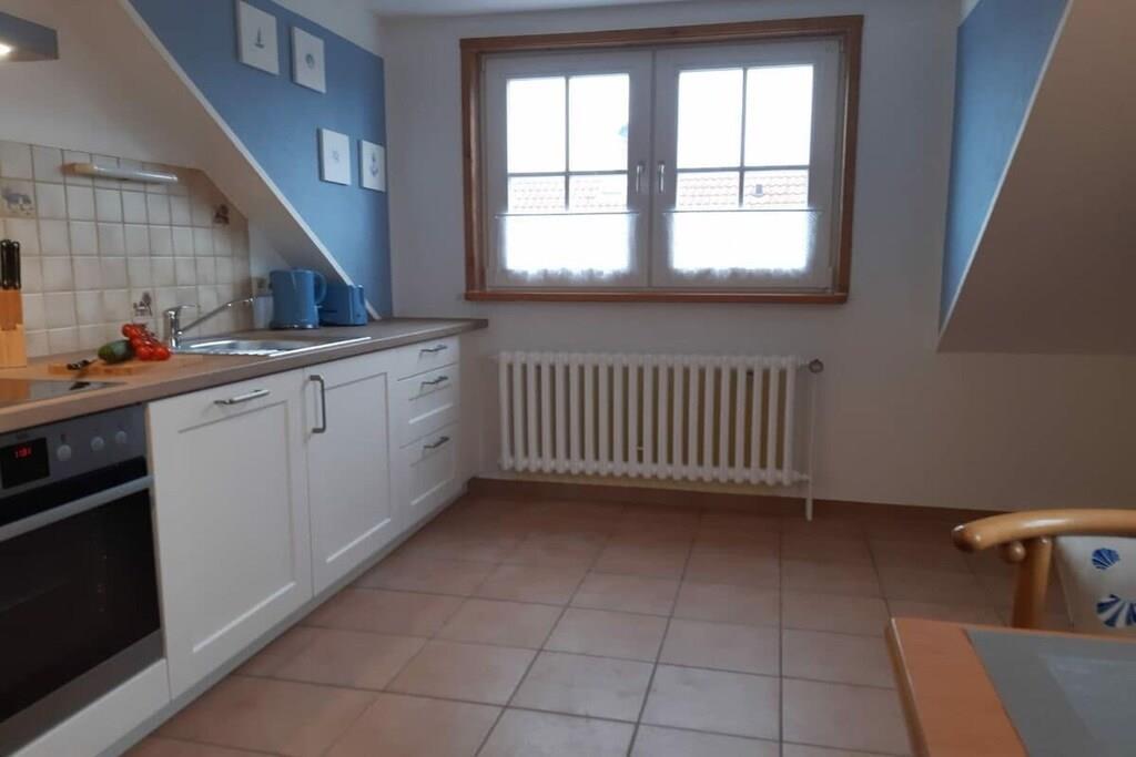Die 80 qm große Ferienwohnung "Kormoran" empfängt 2 bis 4 Personen in der Nachbarschaft eines kleinen Naturschutzgebiets mit teilweise Blick aufs Meer. Das Zentrum der Wohnung ist das große, gemütliche Wohnzimmer mit Couchgarnitur, Musikanlage und einem Fernseher. Von hier aus gelangen Sie auf den überdachten Balkon mit Sitzbank. In der Wohnung stehen Ihnen ein großes Schlafzimmer mit Doppelbett und ein kleineres Schlafzimmer mit zwei Einzelbetten zu Verfügung. Die separate Küche wurde 2021 erneuert - nun finden Sie neben einem Geschirrspüler auch einen Backofen mit Ceranfeld vor, um sich im Urlaub komplett selbst versorgen zu können.