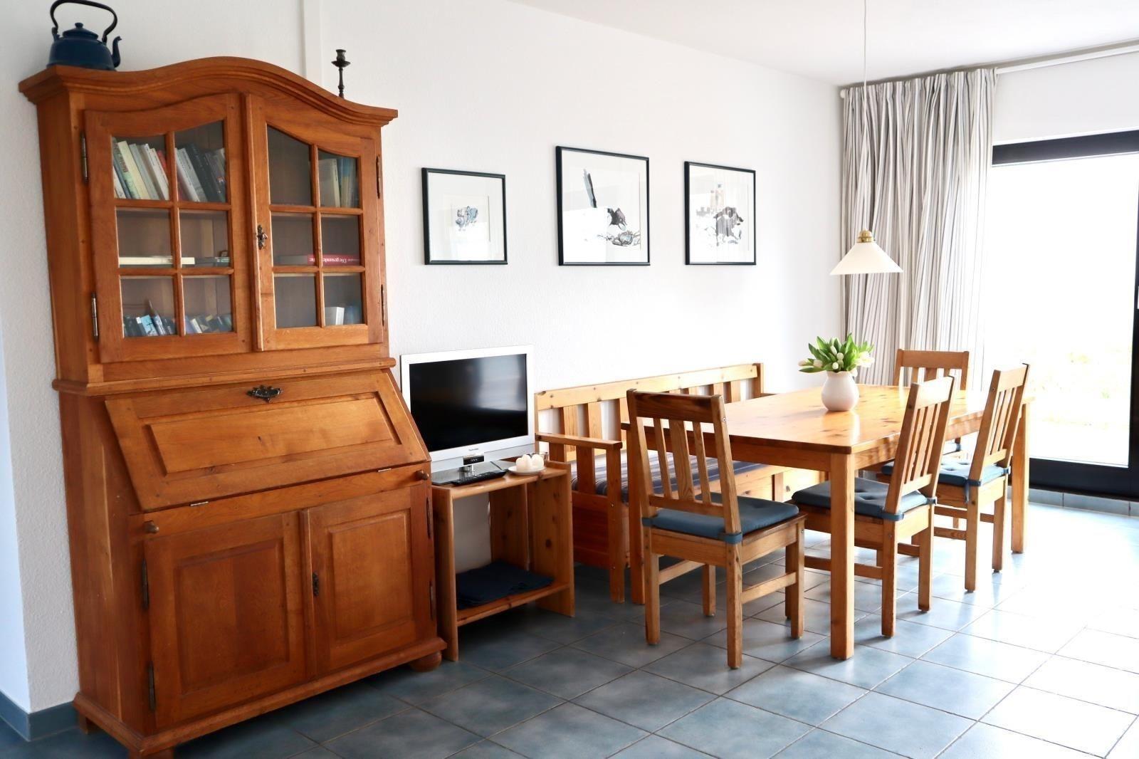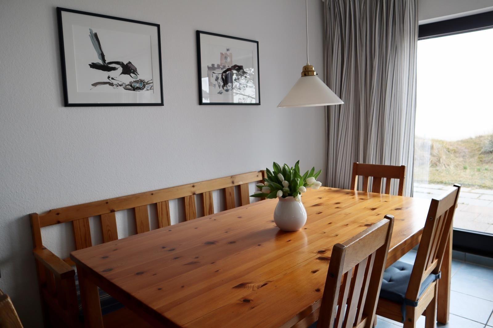 Vom Wohnzimmer hat man einen direkten Zugang zur Terrasse, die mit einem Strandkorb ausgestattet ist, und aus welchem man den herrlichen uneingeschränkten Blick auf den Kniepsand genießt.Auch hat man von hier einen direkten Zugang zur oberen Wandelbahn, der Flaniermeile Wittdüns.Desweiteren stehen Waschmaschine und Wäschetrockner sowie WLAN (unter Vorbehalt) im Hause zur kostenfreien Nutzung zur Verfügung.